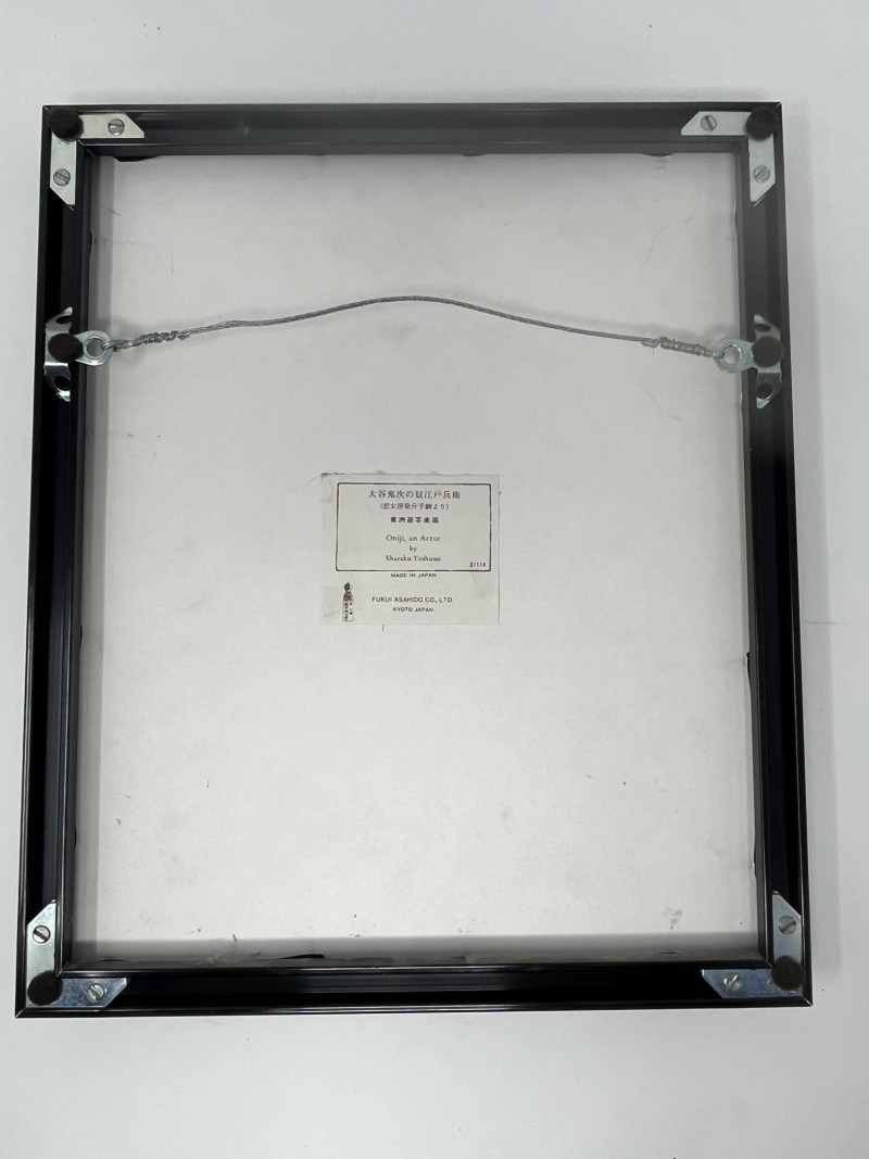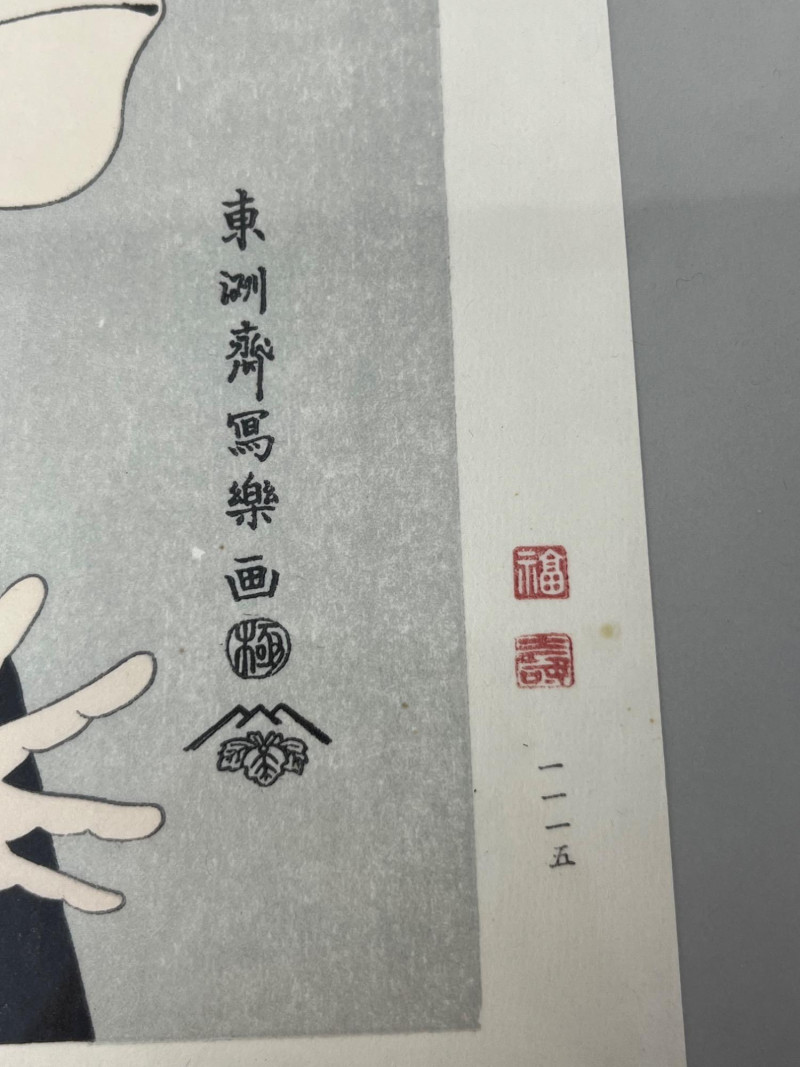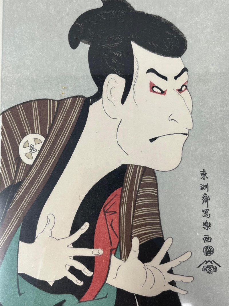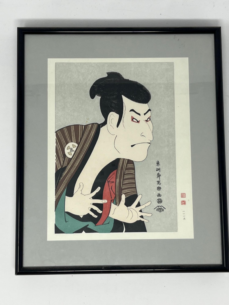 A striking example of Edo-period printmaking, this framed Japanese woodblock print captures the expressive intensity of a Kabuki actor in full theatrical flourish. Attributed to Tōshūsai Sharaku, the enigmatic master of actor portraiture, the piece exemplifies the bold realism and psychological depth that defined his brief but legendary career. Medium: Traditional woodblock print in the Ukiyo-e style Subject: Kabuki actor in dramatic pose, with exaggerated facial expression and stylized hand gesture Details: Red makeup accents and traditional hairstyle Patterned robe with visible textile textures Plain background to emphasize the figure’s emotional presence Japanese calligraphy and red seals along the right margin, likely indicating artist and publisher Framing: Professionally framed under glass Ready for display; ideal for collectors of Japanese art or theater history Artist Note: Sharaku was active for less than a year (1794–1795), producing approx. 140 prints before vanishing from the art world His works are revered for their raw emotion and theatrical immediacy, often compared to Western masters like Rembrandt