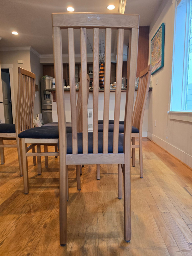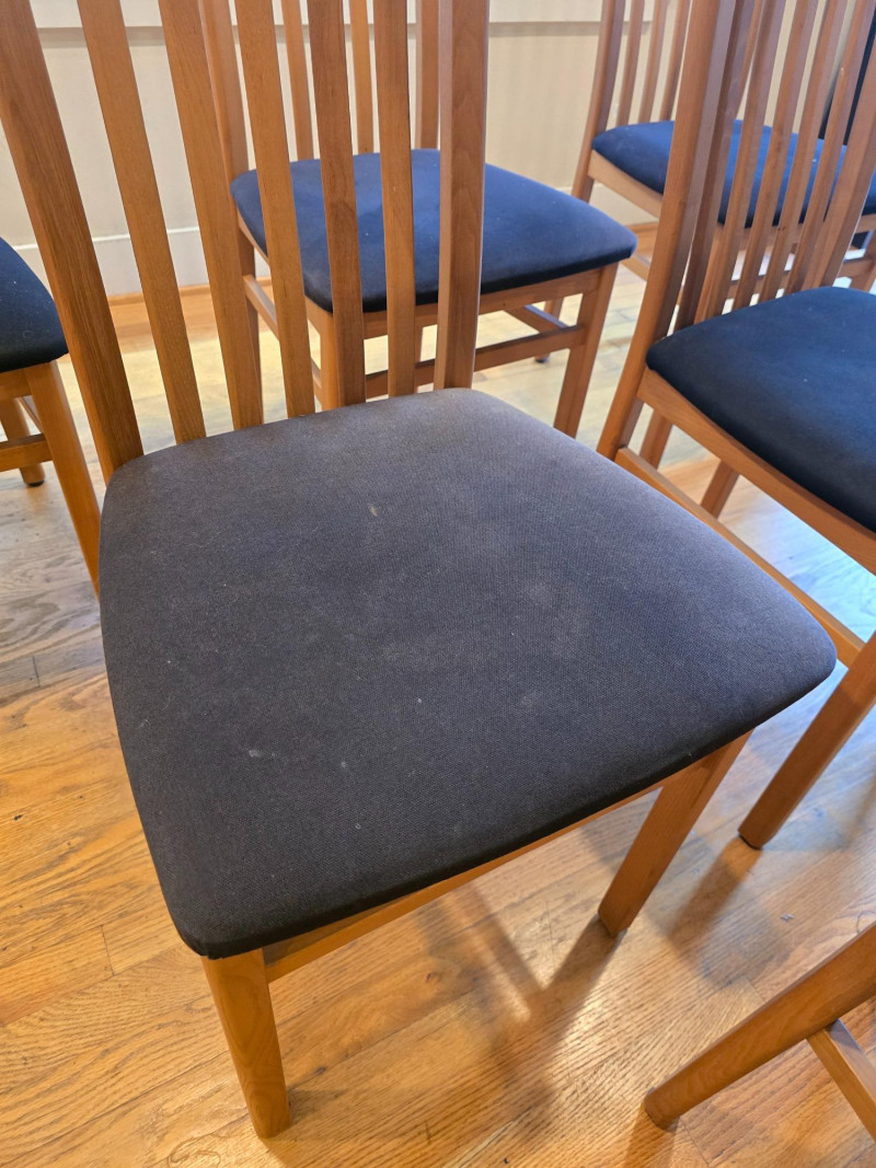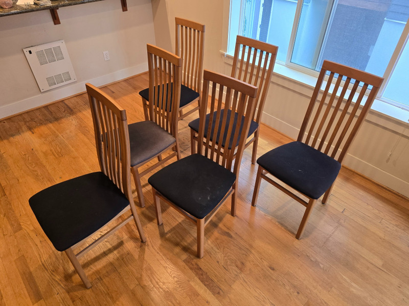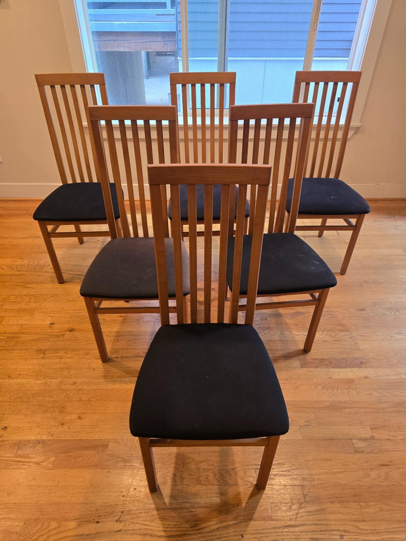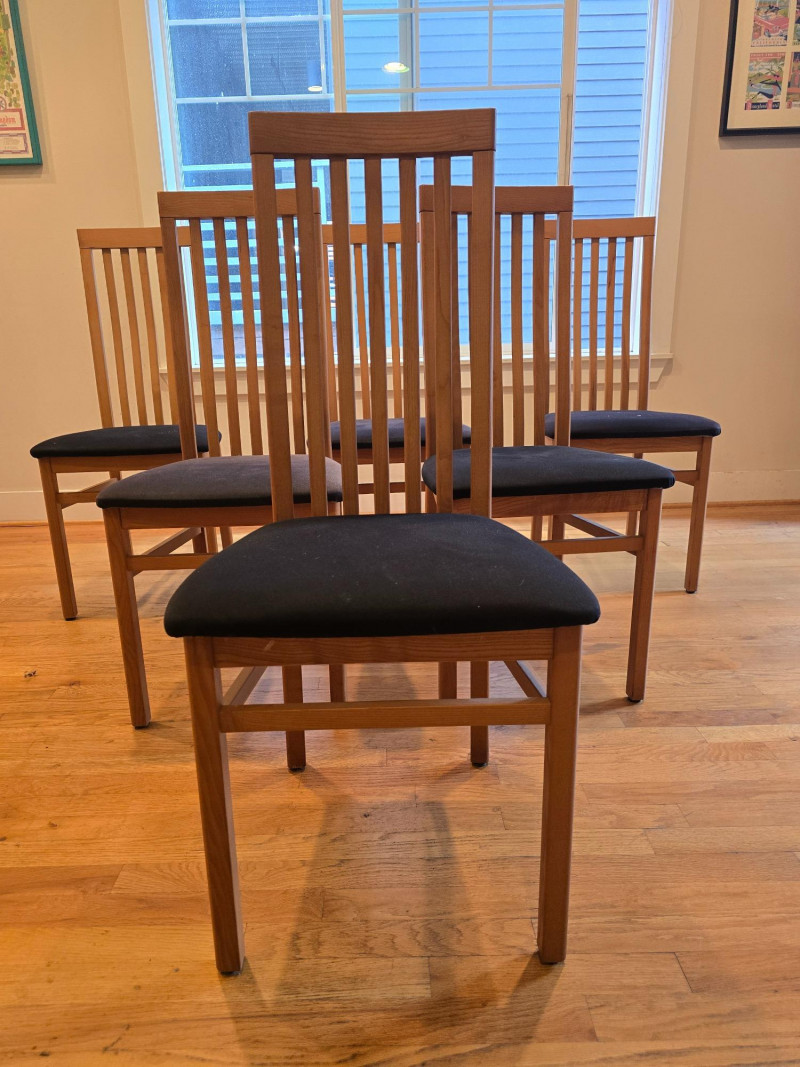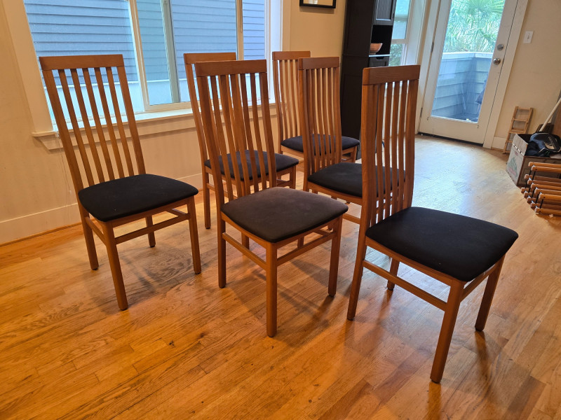 A striking set of six Italian tall-back dining chairs, showcasing clean lines and sculptural elegance. Each chair features a high, vertical slat backrest that rises dramatically, offering both visual height and architectural presence. The seats are upholstered in a dark fabric, providing contrast against the warm wood tones and enhancing comfort. Design: Tall vertical slat backs with squared edges Material: Solid wood frames with visible grain Upholstery: Dark-colored seat cushions (likely black or charcoal) Style: Mid-century Italian modern with minimalist flairItem Overview