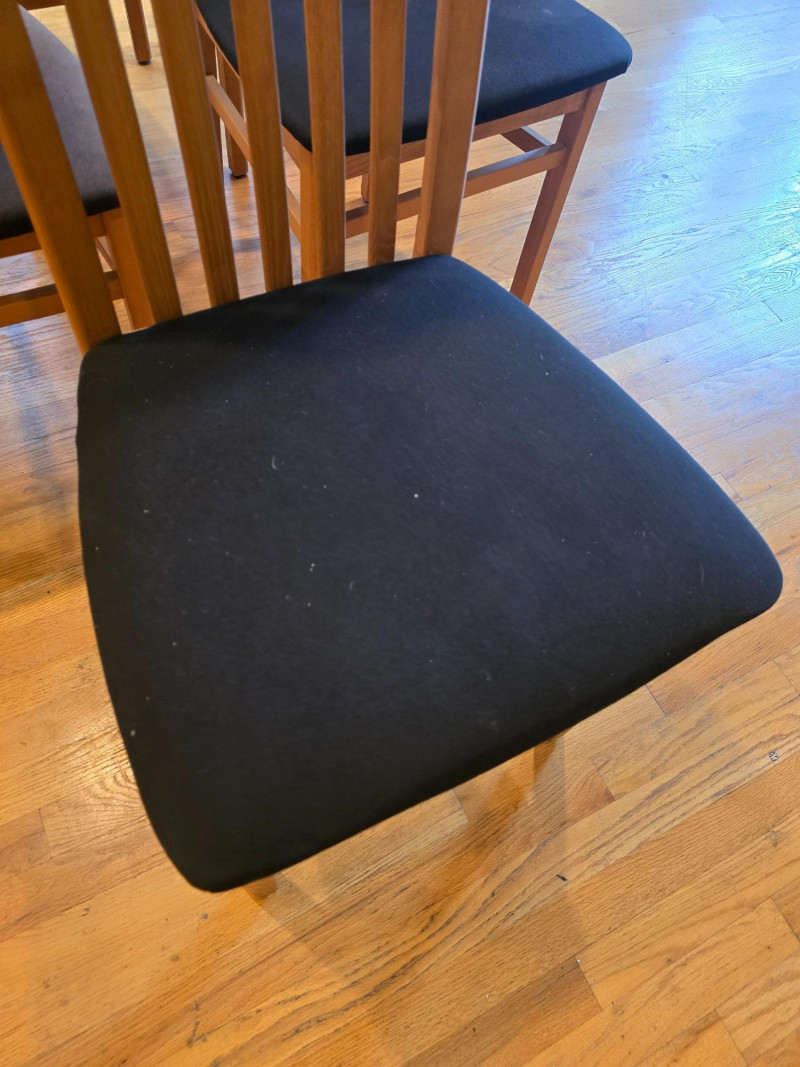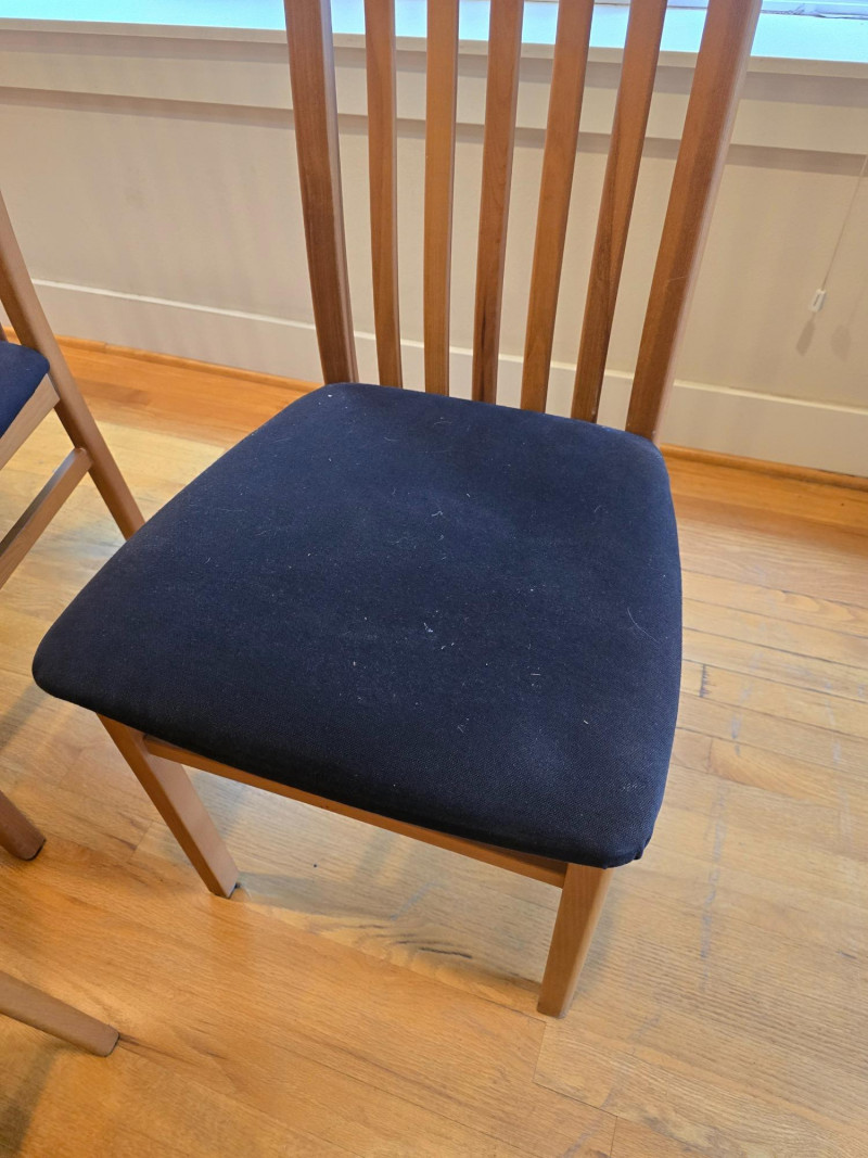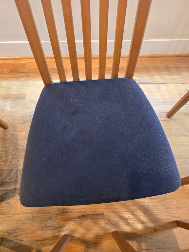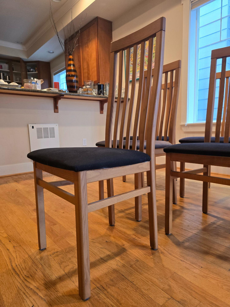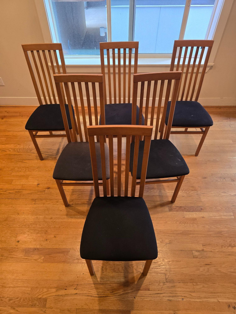 A striking set of six Italian tall-back dining chairs, showcasing clean lines and sculptural elegance. Each chair features a high, vertical slat backrest that rises dramatically, offering both visual height and architectural presence. The seats are upholstered in a dark fabric, providing contrast against the warm wood tones and enhancing comfort. Design: Tall vertical slat backs with squared edges Material: Solid wood frames with visible grain Upholstery: Dark-colored seat cushions (likely black or charcoal) Style: Mid-century Italian modern with minimalist flairItem Overview