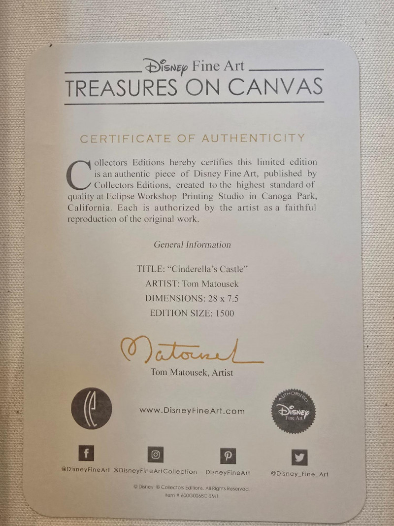"TREASURES'ON CANVAS CERTIFICATE OF AUTHENTICITY ( Collectors Editions, created to the highest standard of ollectors Editions hereby certifies this limited edition is an authentic piece of Disney Fine Art, published by quality at Eclipse Workshop Printing Studio in Canoga Park, California. Each is authorized by the artist as a faithful reproduction of the original work. General Information TITLE: "Cinderella's Castle" ARTIST: Tom Matousek"