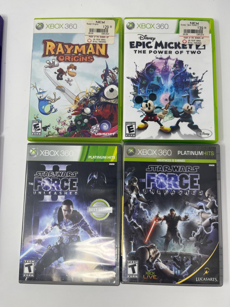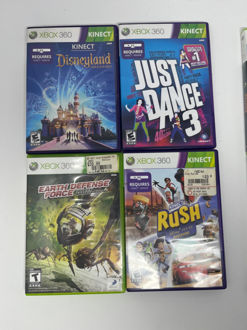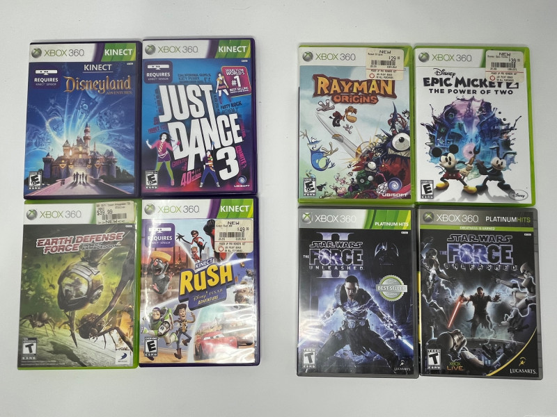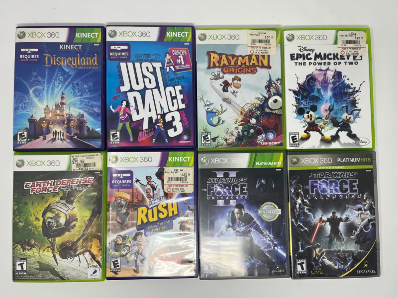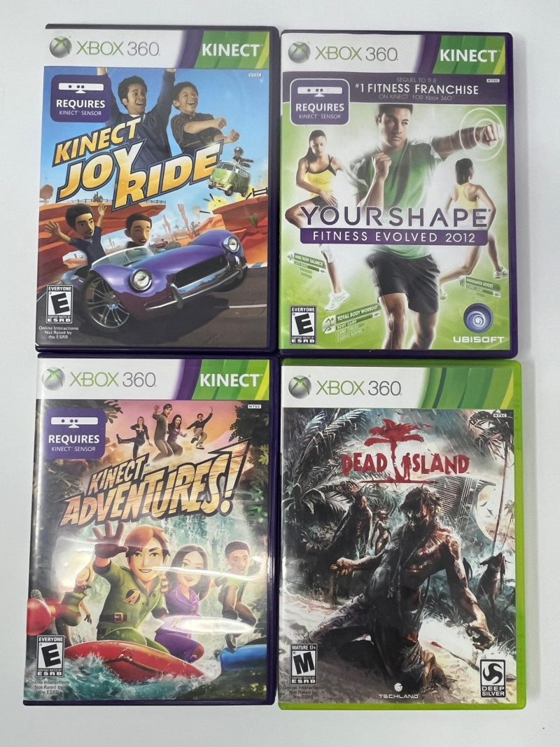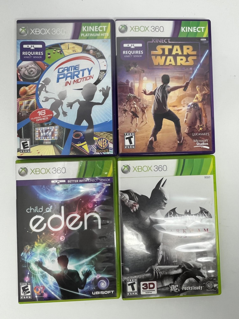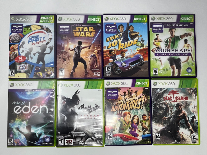 A motion-powered mix of gameplay and genre, this lot includes eight Xbox 360 titles, all compatible with the Kinect sensor. From fitness to fantasy, racing to rhythm, it’s a snapshot of the console’s most interactive era. Top Row: Game Party in Motion – Casual mini-games for group play Kinect Star Wars – Lightsaber duels and pod racing with full-body control Kinect Joy Ride – Arcade-style racing with gesture-based steering Your Shape: Fitness Evolved 2012 – Guided workouts and fitness tracking Bottom Row: Child of Eden – Visually immersive rhythm shooter with motion controls Batman: Arkham City – Action-adventure classic with 3D compatibility Kinect Adventures! – Physical challenges and obstacle courses Dead Island – Survival horror RPG set in a zombie-infested resort Condition: Cases and cover art present; discs untested Sold as-is