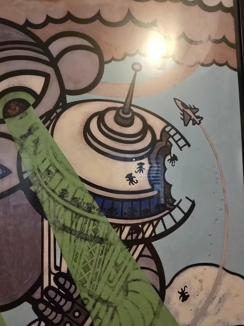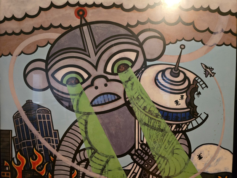 Seattle meets sci-fi mayhem in this bold, graphic print by local illustrator Matthew Porter, known for his whimsical, wide-eyed animal characters and cheeky storytelling. Here, his signature monkey goes full kaiju—towering over the city with green laser eyes, a burning skyline, and panicked citizens in superhero masks fleeing the scene. Artist: Matthew Porter – Seattle-based children’s book illustrator with a folk-art flair Title: Destroy Seattle Monkey Medium: Poster print, professionally framed Style: Cartoonish chaos meets retro comic book drama Details: Flying saucer, distressed buildings, and a monkey too big for the monorail