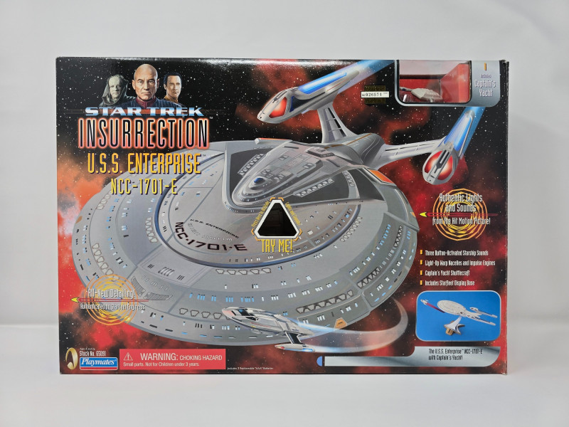 A cinematic collectible with light, sound, and shelf presence, this boxed U.S.S. Enterprise NCC-1701-E by Playmates Toys is a standout from the Star Trek: Insurrection line. Complete in original packaging and marked No. 026574, it features interactive elements and movie-authentic detailing. Features: Light-up warp nacelles and authentic starship sounds “Try Me” button accessible through packaging Sculpted with screen-accurate proportions and paintwork Packaging Highlights: Vivid illustration of the Enterprise-E in flight Portraits of Insurrection characters including Captain Jean-Luc Picard “Star Trek Insurrection” branding and promotional callouts Manufacturer: Playmates Toys, circa 1998 Condition: electronics untested