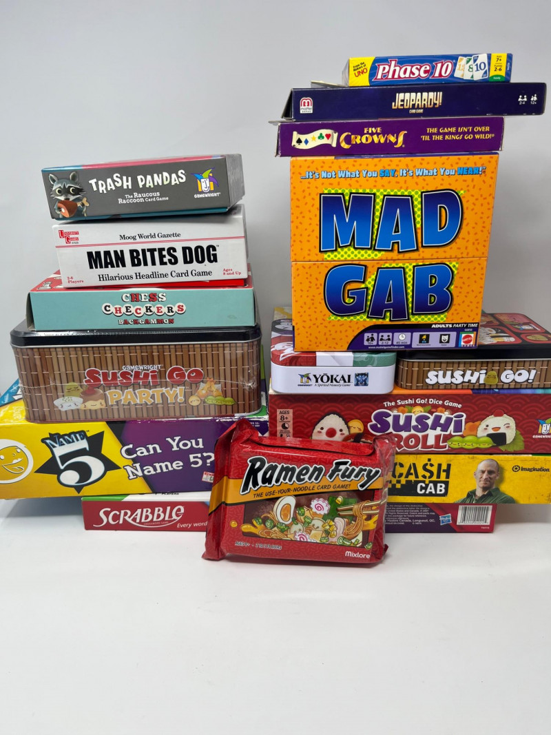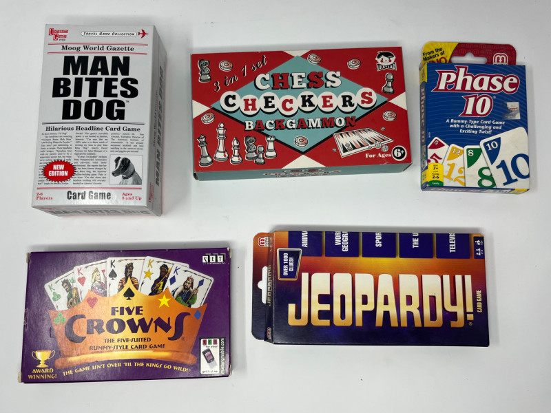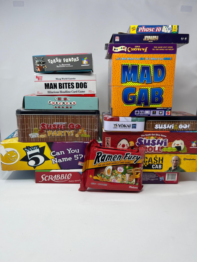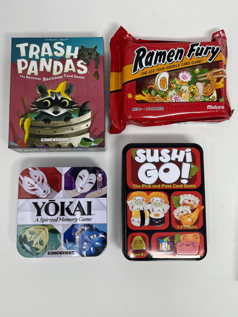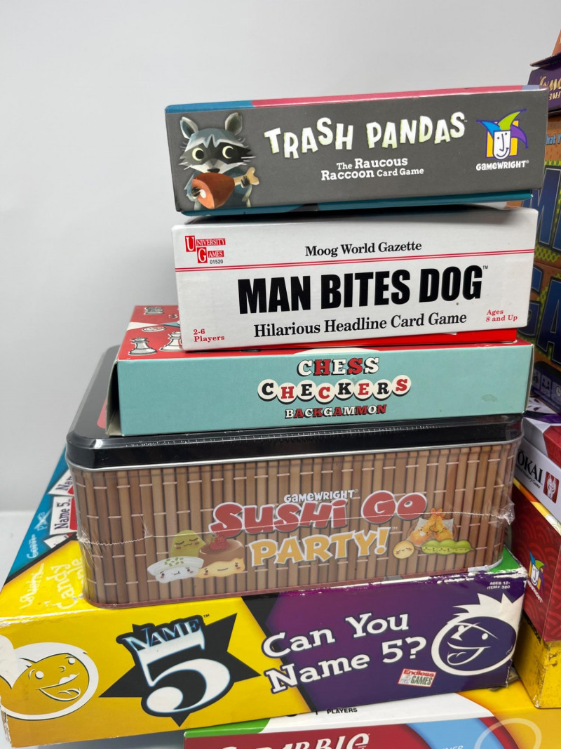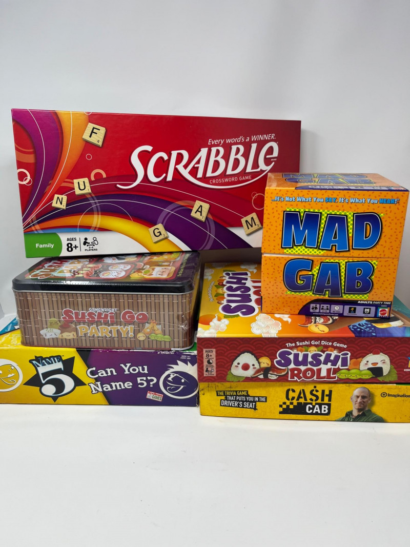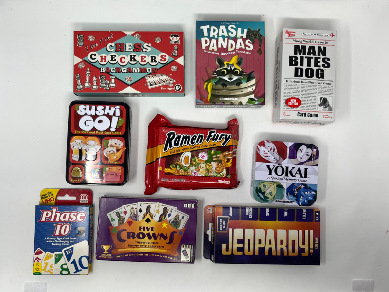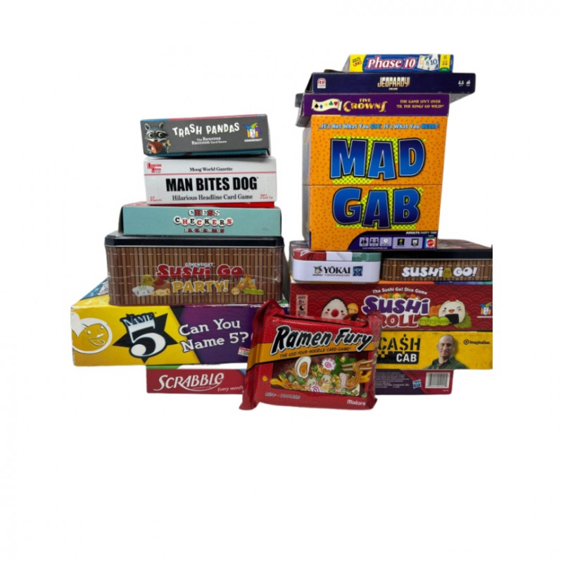 Lot of miscellaneous card and board games. Sold as-is, some are sealed. Games include: - Scrabble - Name 5 - Cash Cab - Ramen Fury *sealed* - Sushi Roll Board Game - Sushi Go Party Edition *Sealed* - Sushi Go Card Game - Yokai - Mad Gab - The Crowns - Jeopardy - Phase 10 - Trash Pandas - Man Bites Dog - Checkers