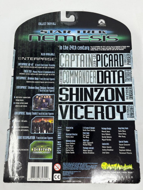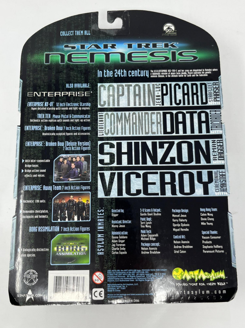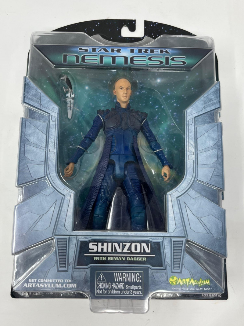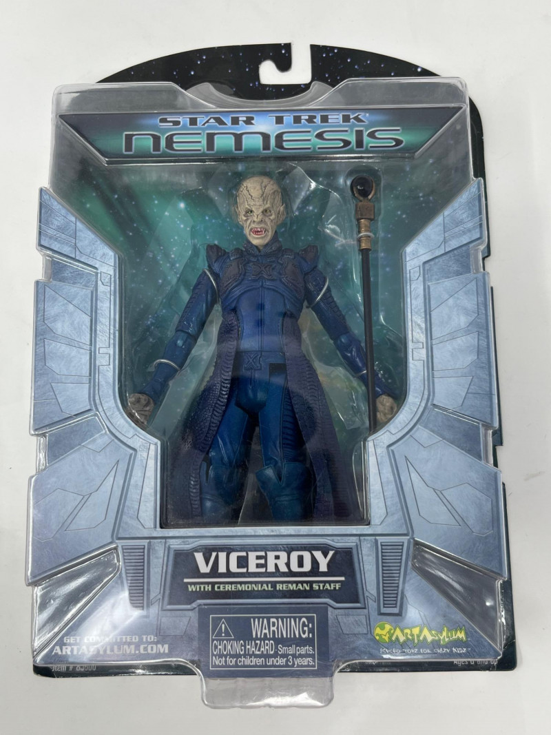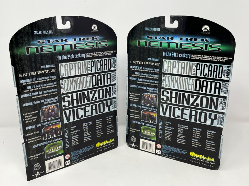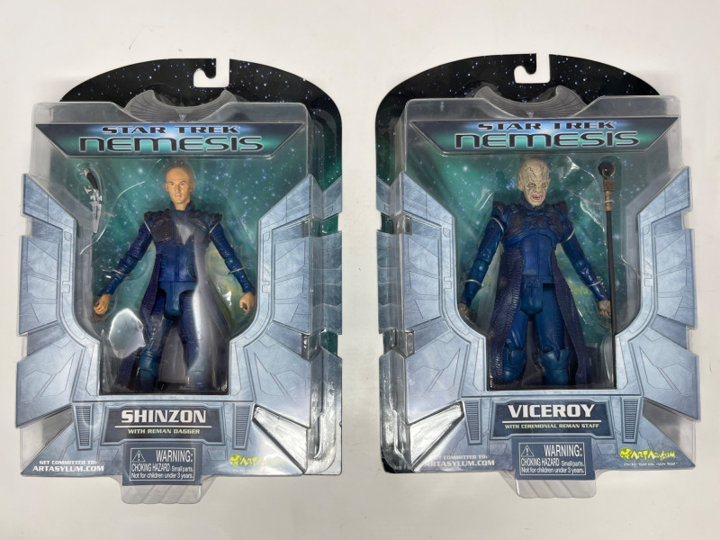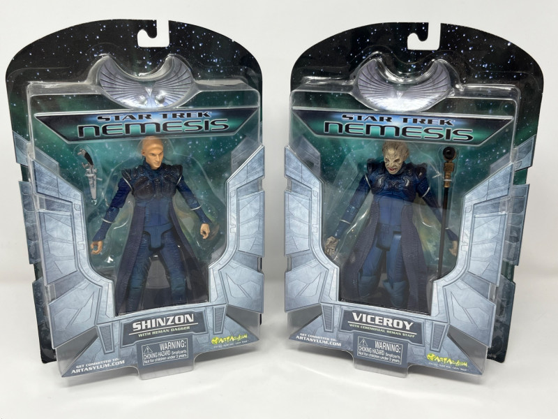 A striking pair of Star Trek: Nemesis action figures from Art Asylum, each sealed in original packaging and ready to command your collector shelf. These figures capture the dark elegance of the film’s antagonists with detailed sculpting and accessories. Included Figures: Shinzon – The clone of Picard turned Romulan usurper, depicted with short blond hair and a textured dark blue uniform. Viceroy – Shinzon’s telepathic ally, featuring an alien visage, matching uniform, and a staff-like accessory. Packaging features the Star Trek: Nemesis logo, a space-themed backdrop, and standard safety warnings. Both figures are marked with Art Asylum branding, known for its high-quality sculpt and cinematic accuracy.Description