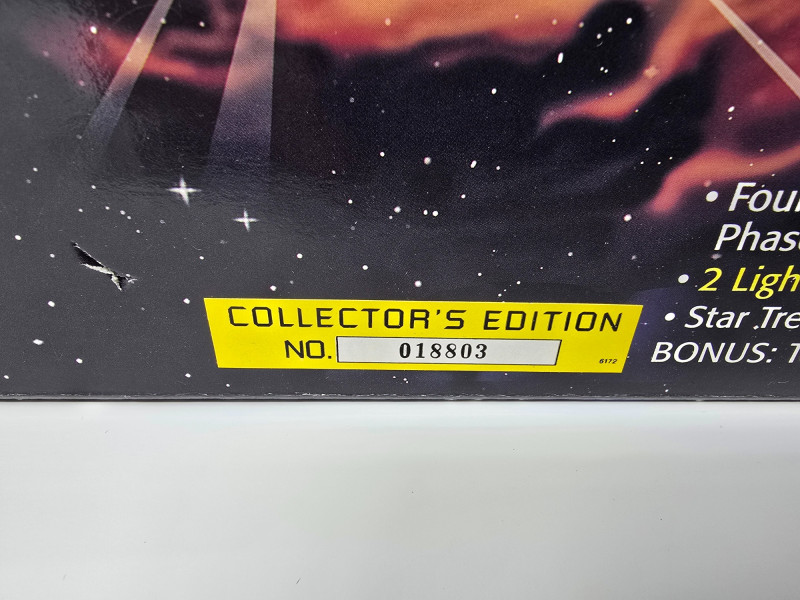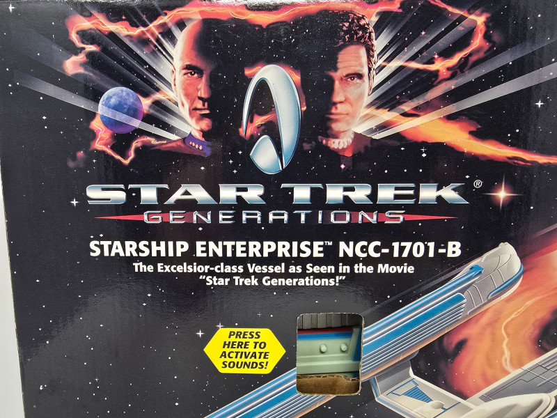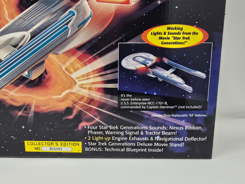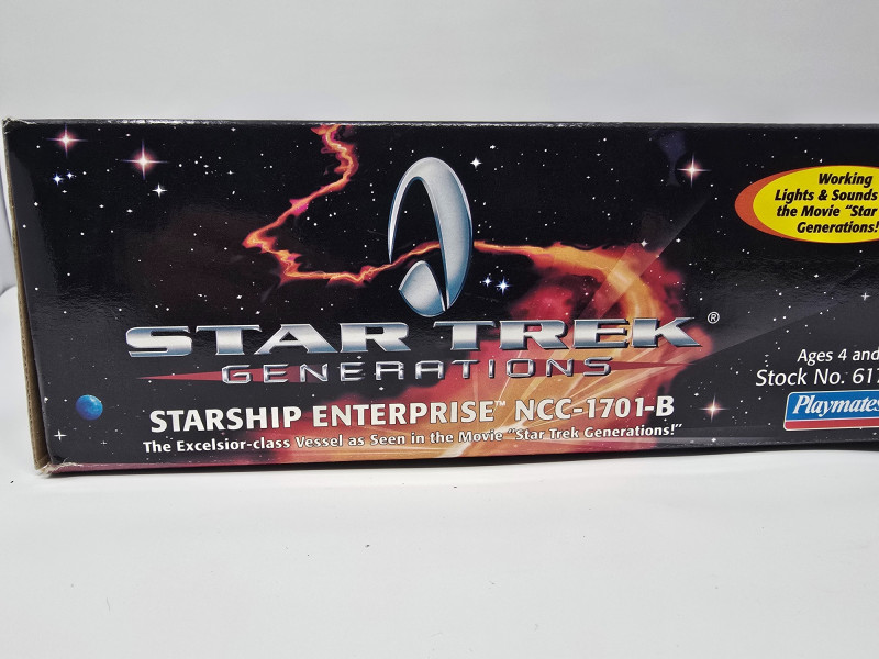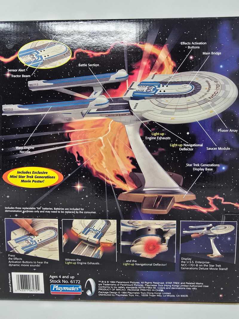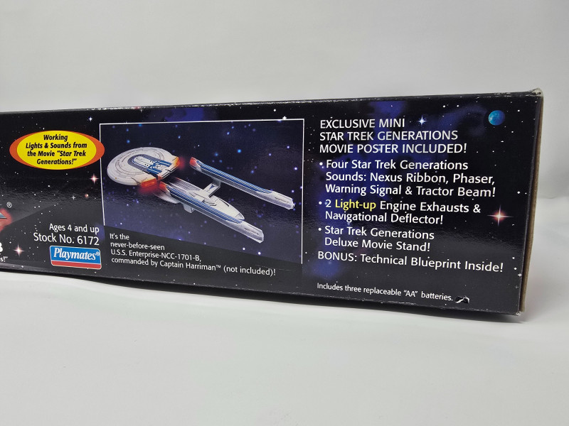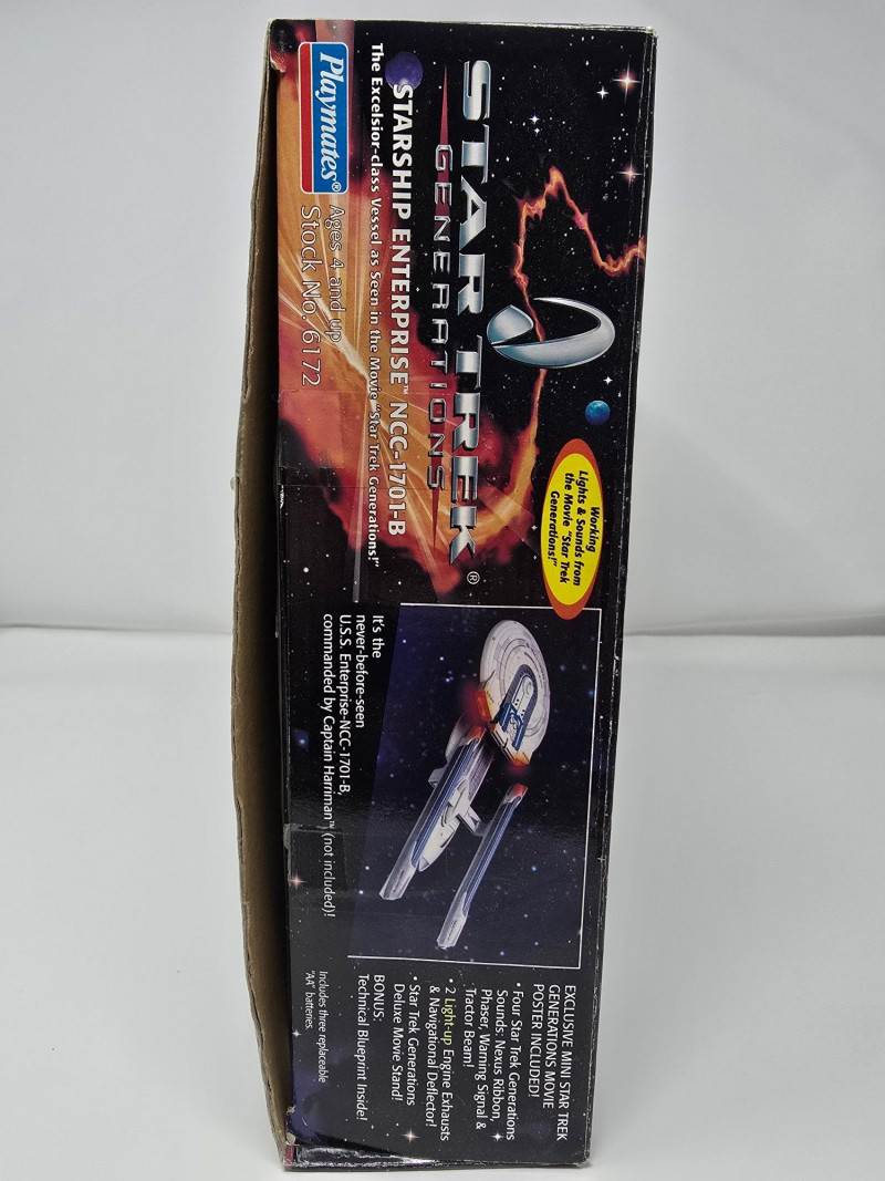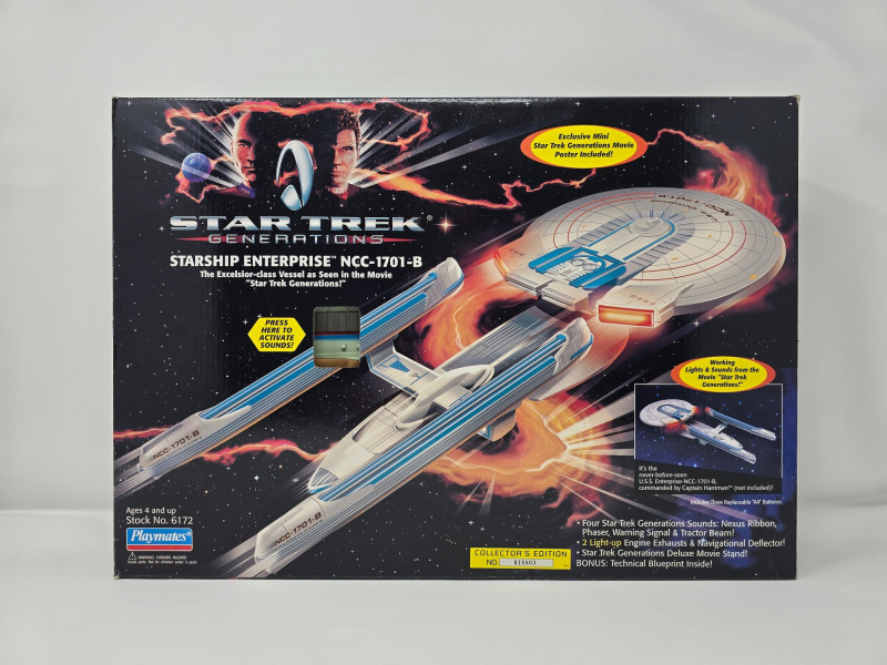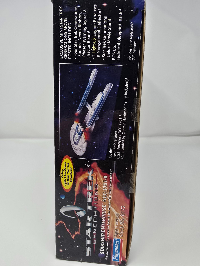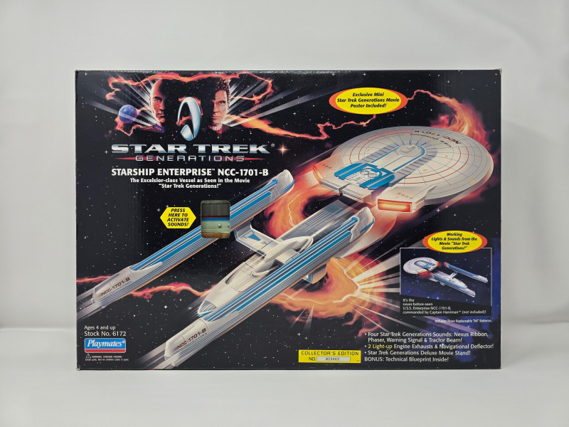 Collector’s Edition – Lights, Sounds & Lore A boxed blast from the final frontier! This vintage 1994 Playmates model of the Starship Enterprise NCC-1701-B beams in from Star Trek Generations, complete with original packaging and promotional flair. Includes: Electronic starship with authentic lights and sounds, Nexus Ribbon, display stand, bonus technical blueprint insert, and mini movie poster Packaging: Vibrant graphics featuring the Enterprise in flight and cast imagery from Generations Labeling: “Collector’s Edition,” Stock No. 6172, designed for ages 4 and up Condition: Boxed and display-ready; batteries not included A must-have for Trekkies, toy archivists, and anyone who knows the difference between a warp core breach and a dramatic plot twist. Whether you’re curating a shelf or staging a miniature space opera, this piece delivers nostalgia at warp speed.