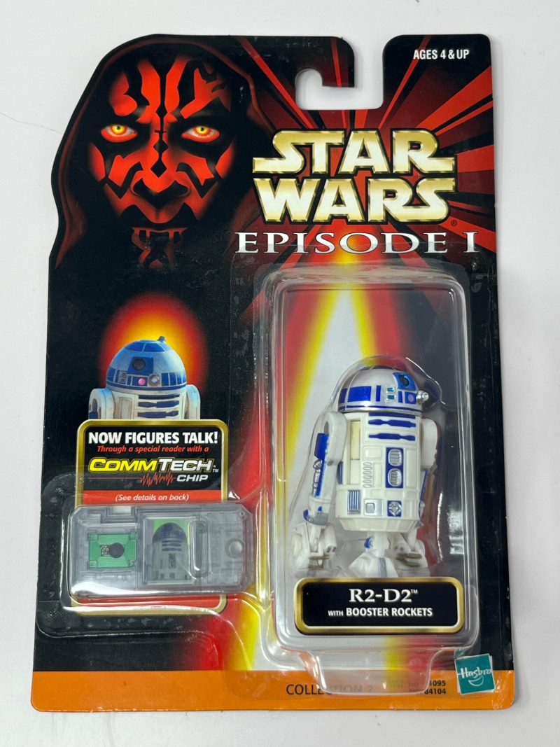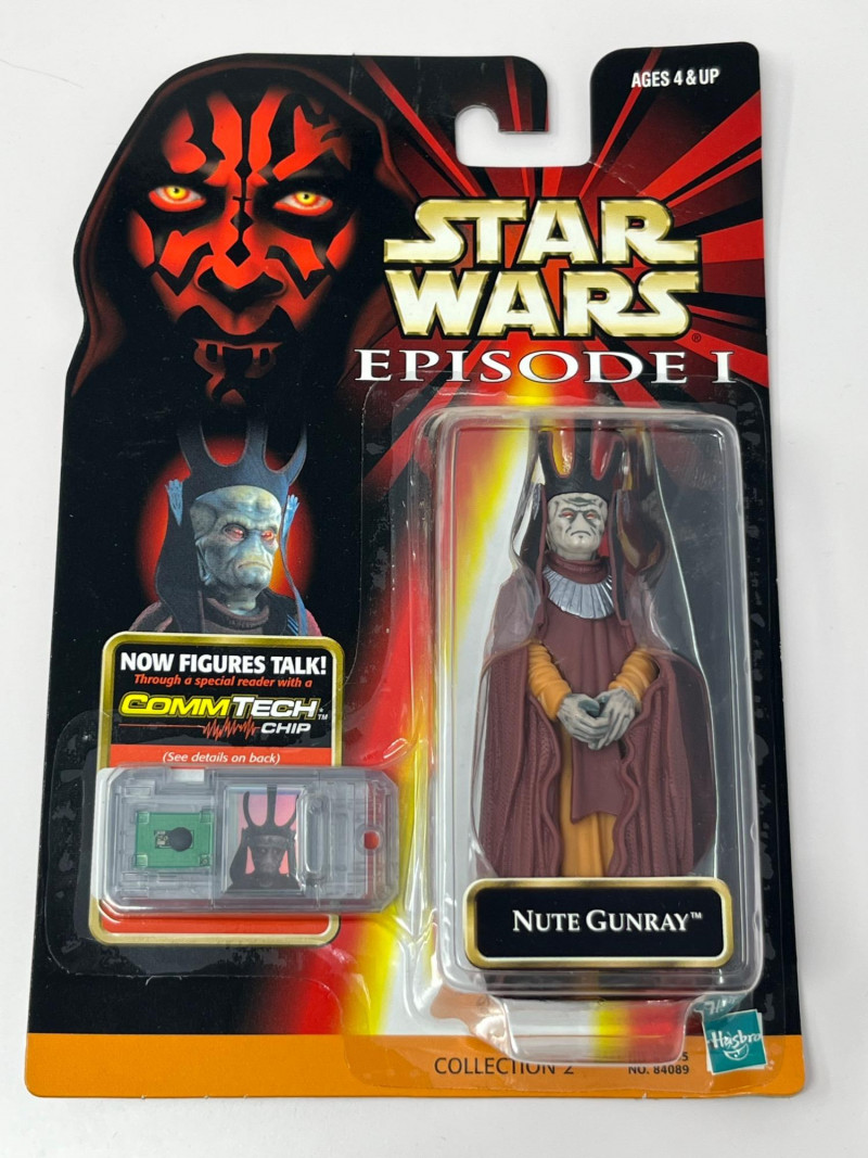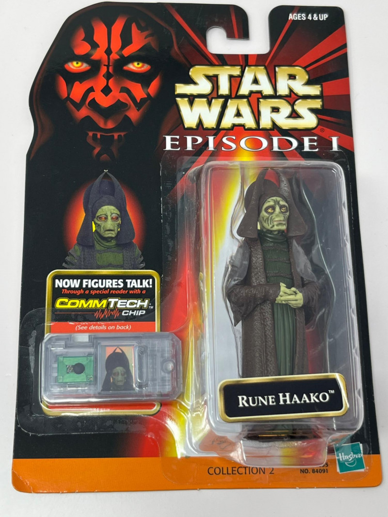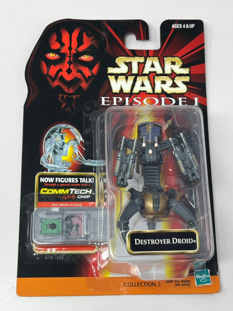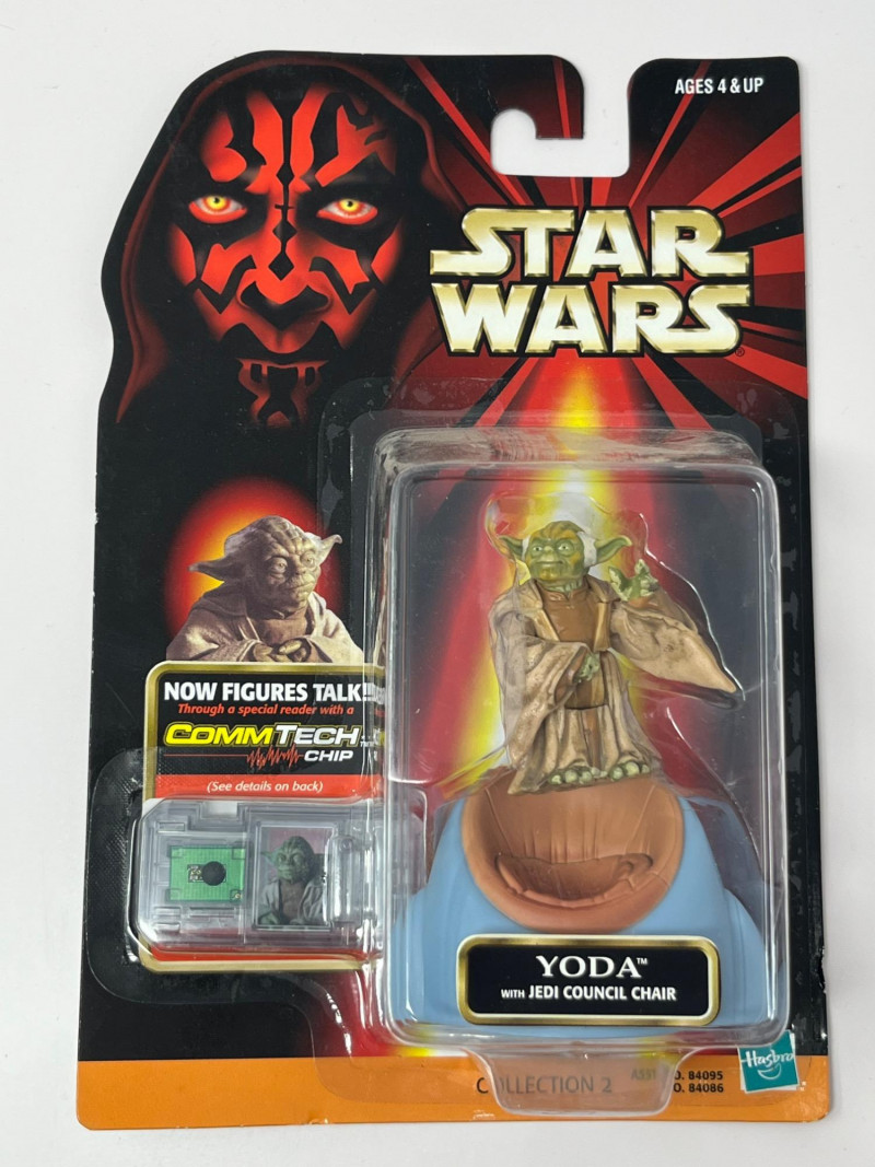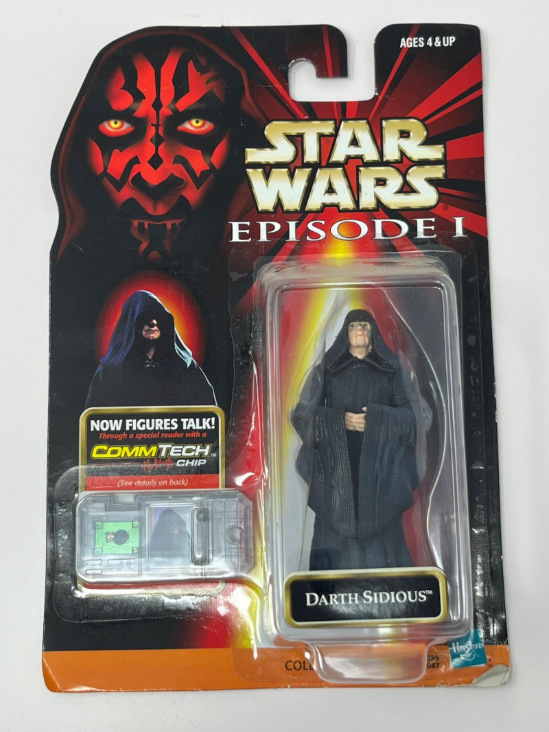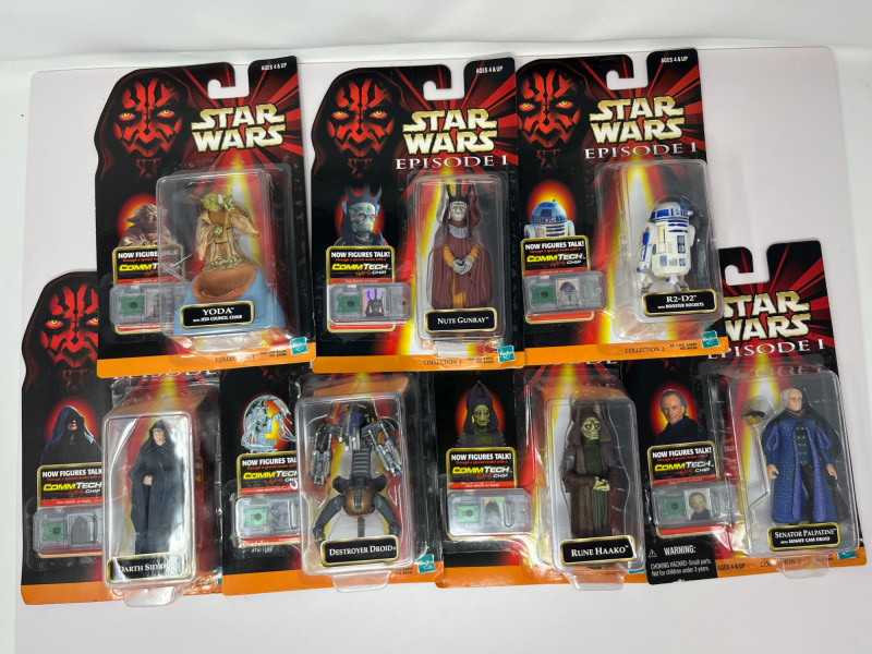 A complete-in-box set of seven Star Wars Episode I action figures, each sealed in original packaging and equipped with a CommTech chip—a late-90s innovation that allowed figures to “speak” when paired with a compatible reader. This set leans into the political intrigue and mechanical menace of The Phantom Menace, with a mix of Jedi wisdom, bureaucratic scheming, and droid destruction. Included Characters: Yoda – Jedi Master with centuries of sass Nute Gunray – Trade Federation schemer Rune Haako – Nervous sidekick in bureaucratic robes Destroyer Droid – Rolling terror with twin blasters Senator Palpatine – Smiling strategist with sinister plans R2-D2 – Loyal astromech with a knack for saving the day Darth Sidious – Cloaked puppet master, pulling strings from the shadows Each figure is housed in blister packaging featuring the Episode I logo, character artwork, and CommTech branding. Packaging includes standard safety warnings and “CHOKING HAZARD” labels.Description