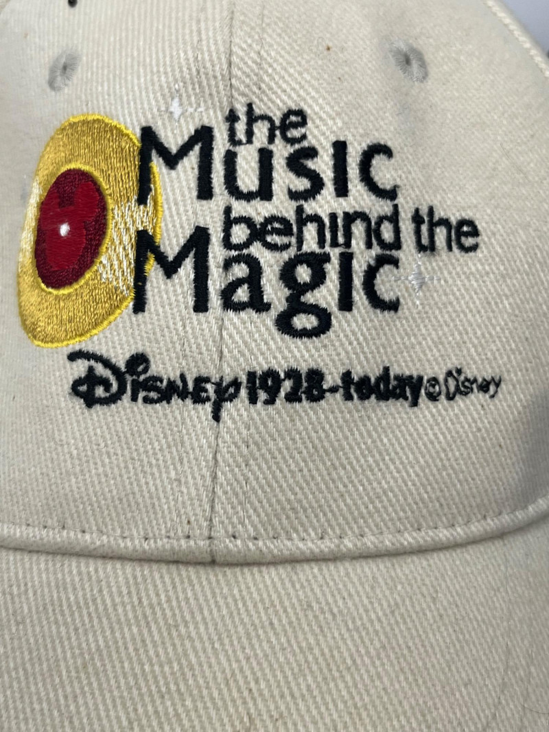 A spirited set of three Disney-themed baseball caps, each celebrating a different slice of the Magic Kingdom’s cultural legacy—from musical nostalgia to pirate bravado to golden anniversaries. Cap 1: Beige “Music Behind the Magic” Hat