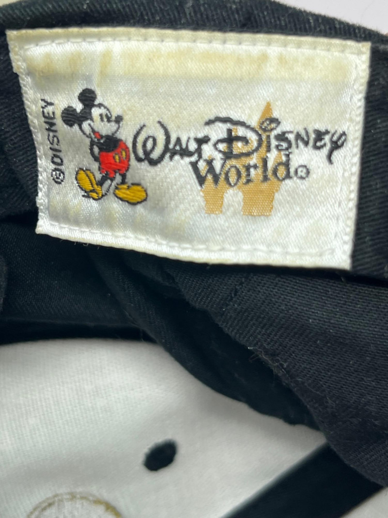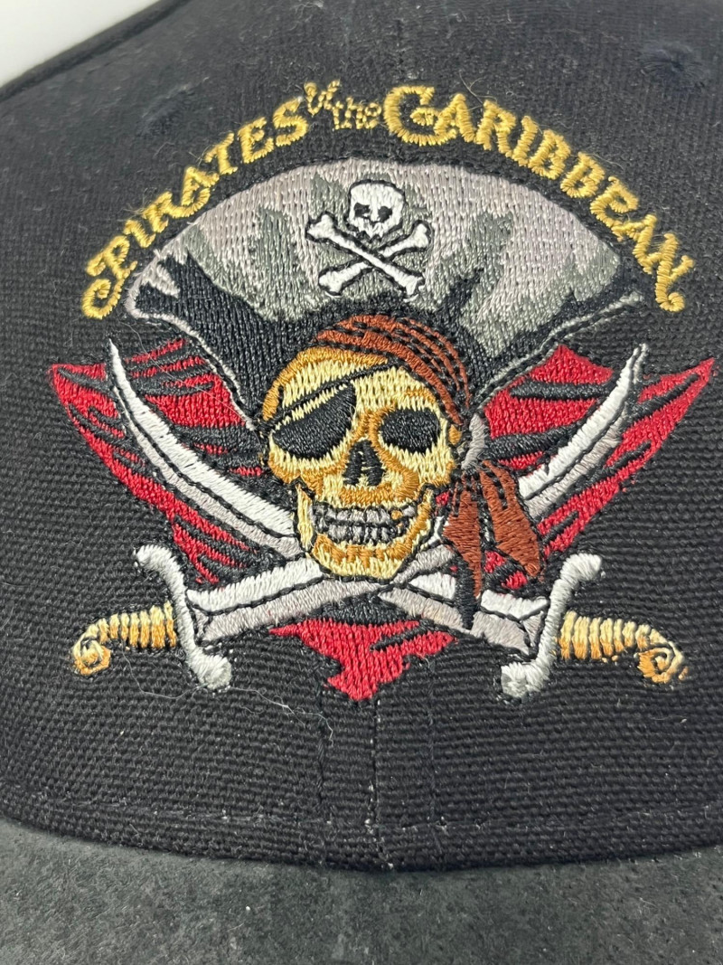 Features a gold Mickey silhouette with a blue center and “50” in gold—likely commemorating Walt Disney World’s 50th anniversary. Clean, bold, and celebratory. Cap 3: Black “Pirates of the Caribbean” Hat
