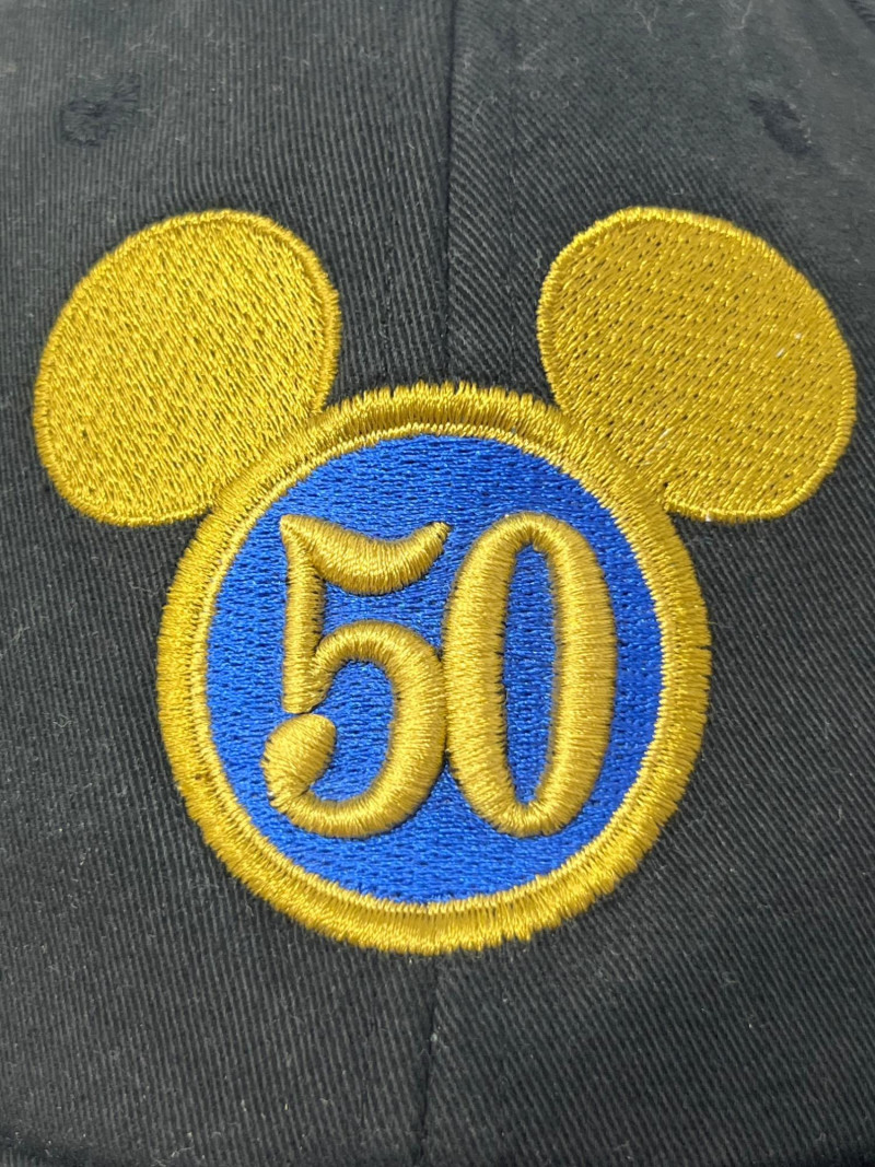 Embroidered with a red music note and the text: “Music Making the Magic – Disney 1992 – Magic Music Days.” A nod to Disney’s long-running performance program for school bands and choirs. Cap 2: Black & Blue “50th Anniversary” Hat