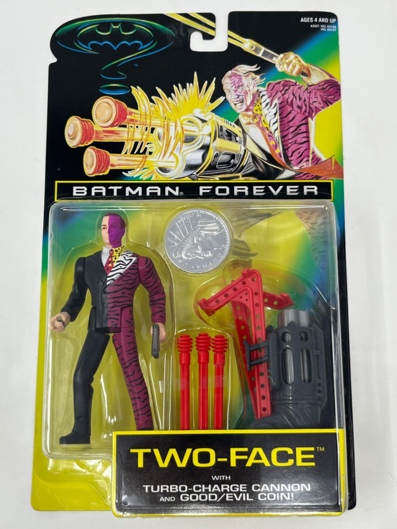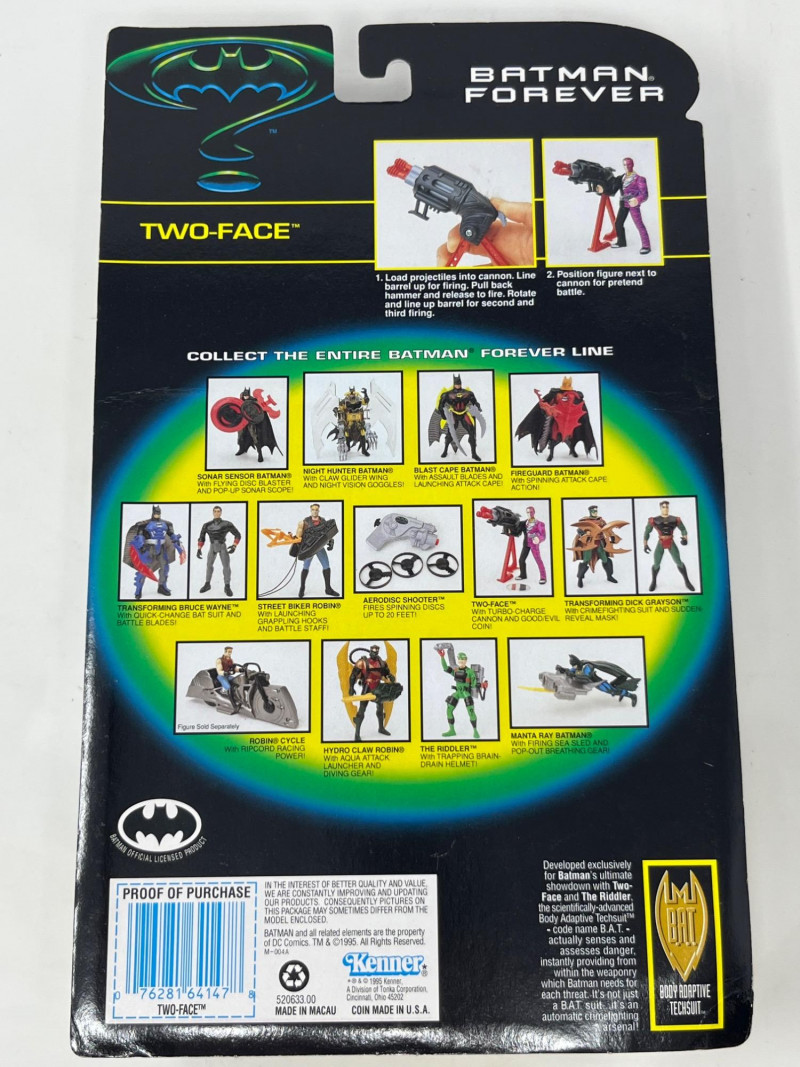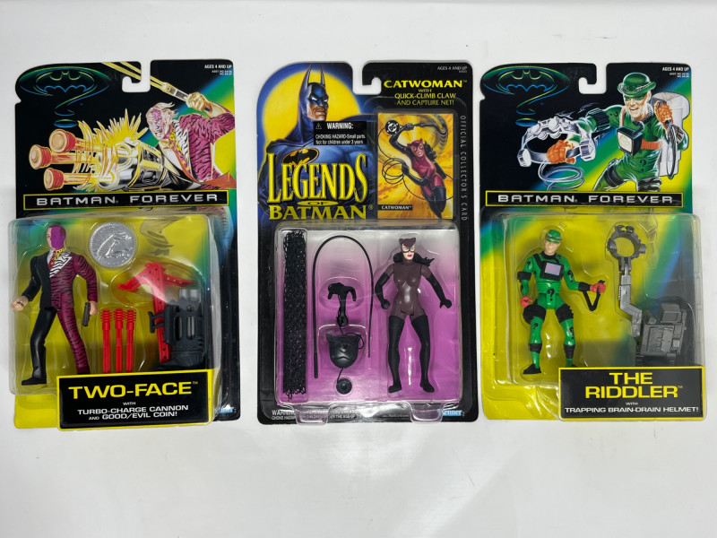 A triple-threat lineup of carded vintage Batman villain action figures, each sealed in original packaging with character-specific accessories and artwork. These 1990s-era collectibles channel the camp, chaos, and charisma of Gotham’s most iconic troublemakers. Two-Face (Batman Forever Series)