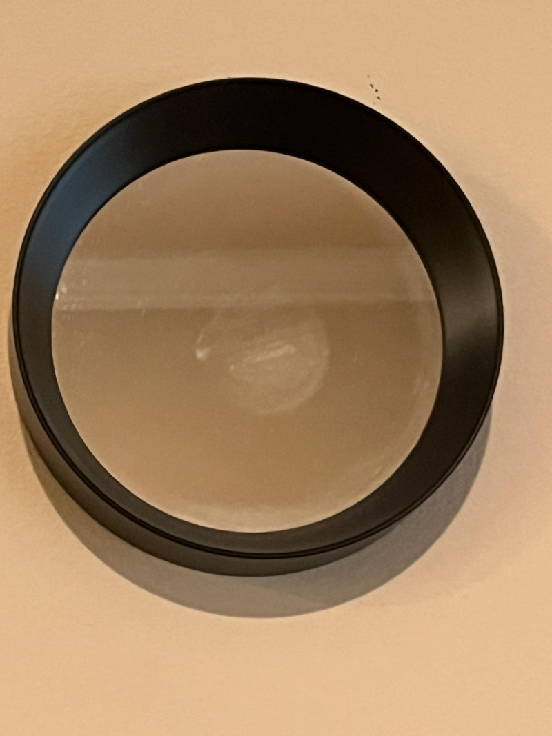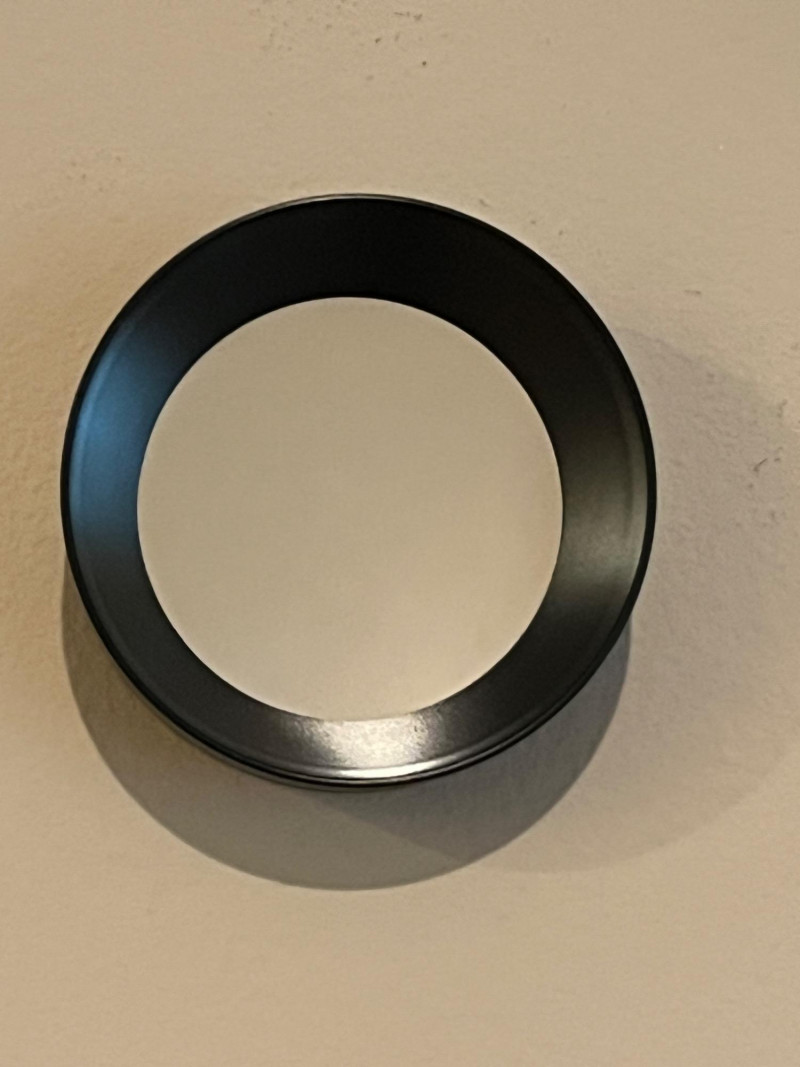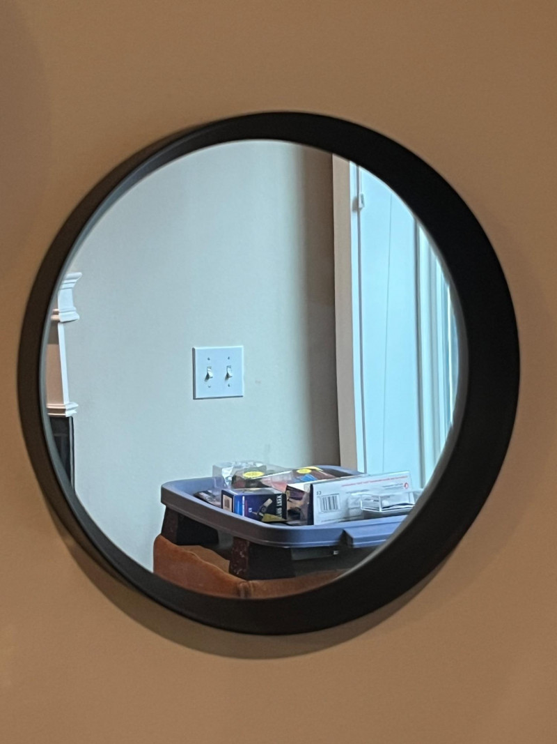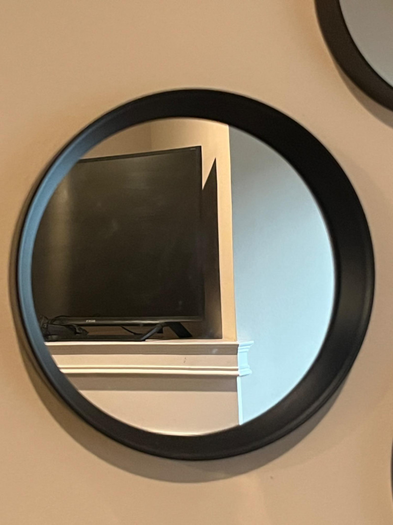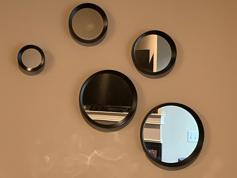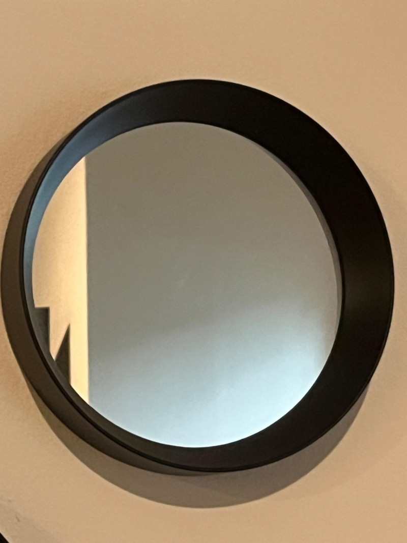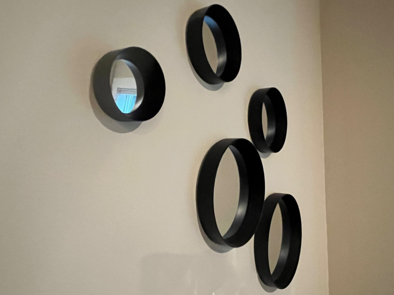 A sculptural set of five circular wall mirrors, each framed in matte black and arranged for maximum visual impact. With subtle variations in size and angle, this collection offers a minimalist yet dynamic approach to wall décor. Design Features: Five round mirrors with sleek black frames Varying diameters for layered, gallery-style presentation Ideal for modern, mid-century, or industrial interiors Condition: Excellent visual condition; no cracks or chips noted Ready to hang; hardware not included Styling Notes: Display as a clustered statement piece or scatter across a space Adds light, depth, and architectural interest to any wall