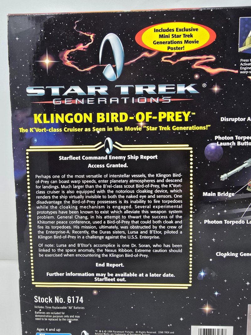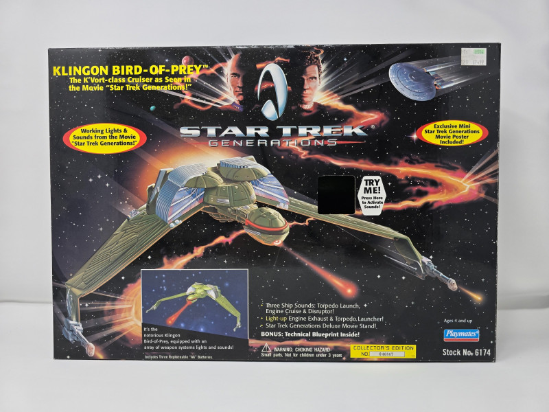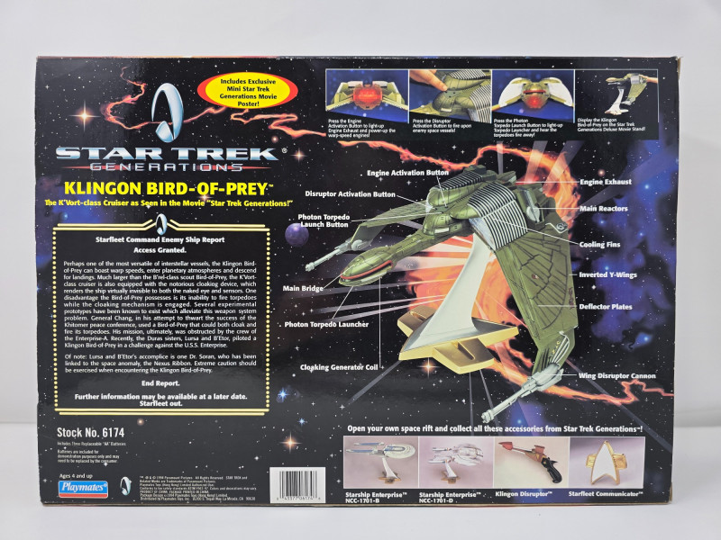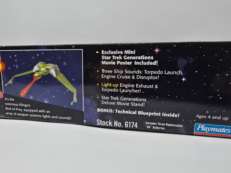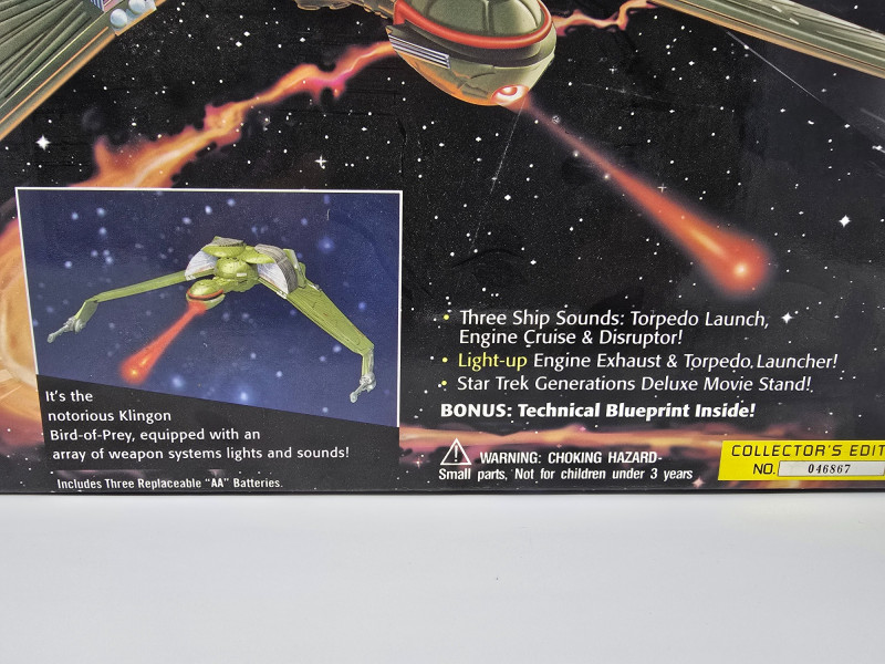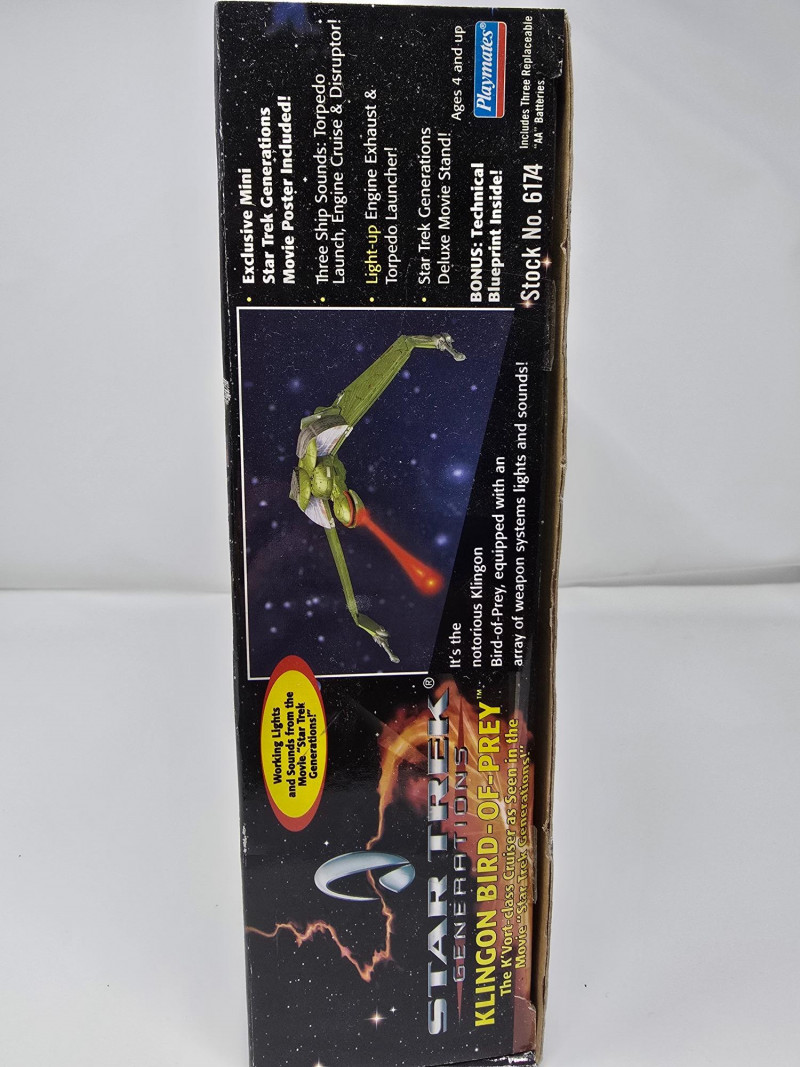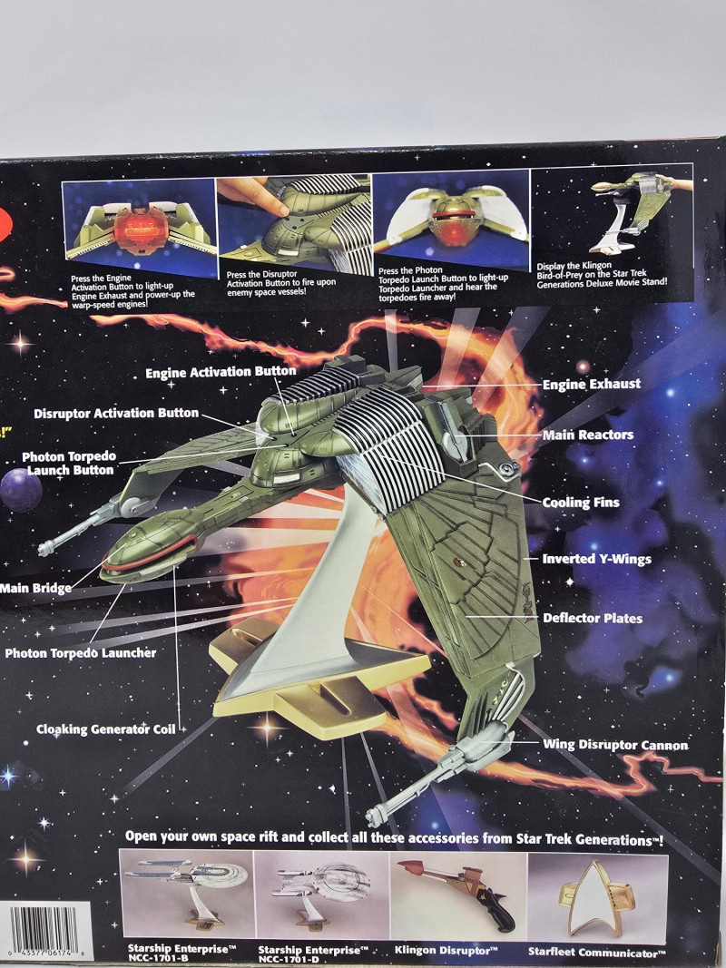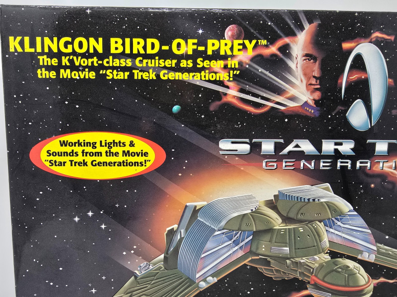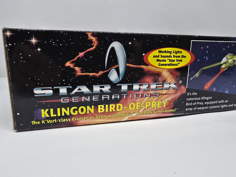 A K'Vort-class Klingon Bird-of-Prey toy by Playmates, modeled after its cinematic appearance in Star Trek Generations. This collector’s edition is built for display, nostalgia, and full-on shelf drama. Lights & Sounds: Includes torpedo launch, engine cruise, and disruptor effects Illuminated Details: Light-up engine exhaust and torpedo launcherOverview
