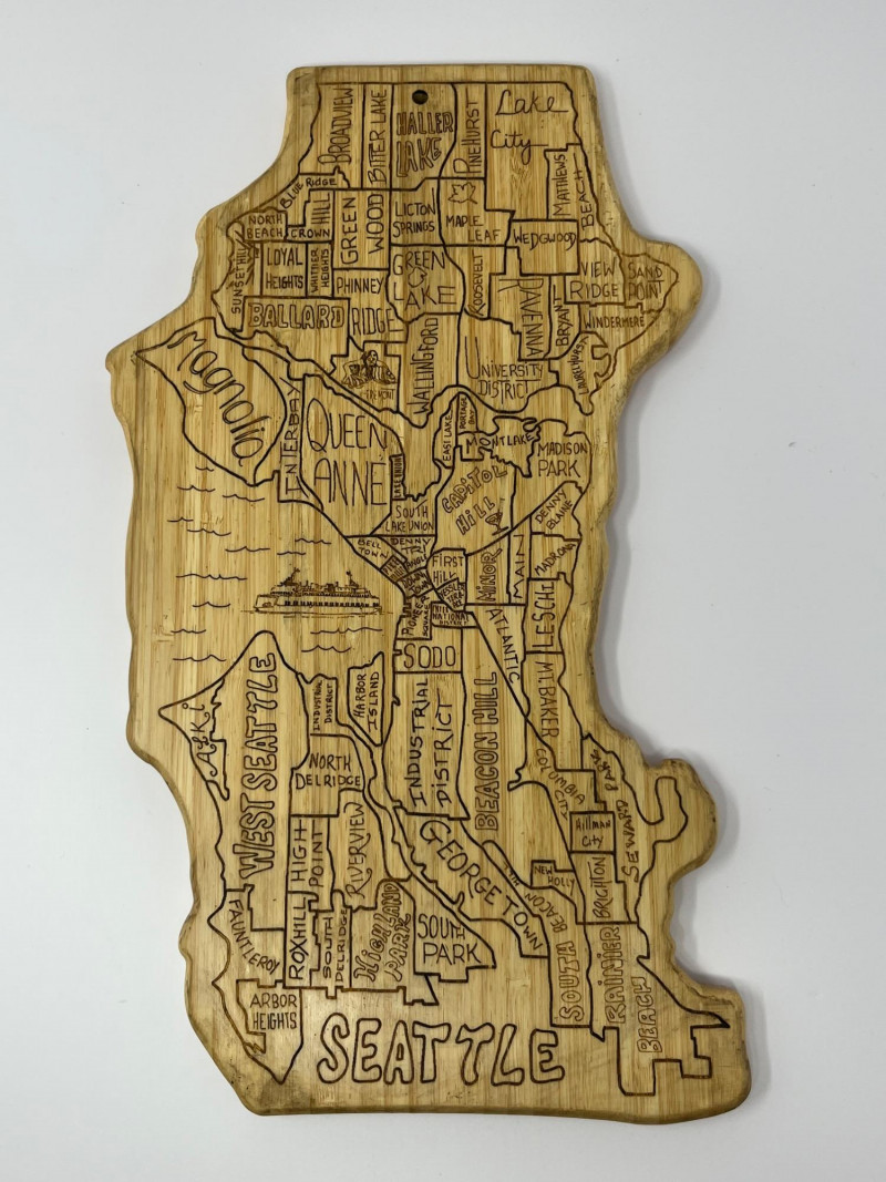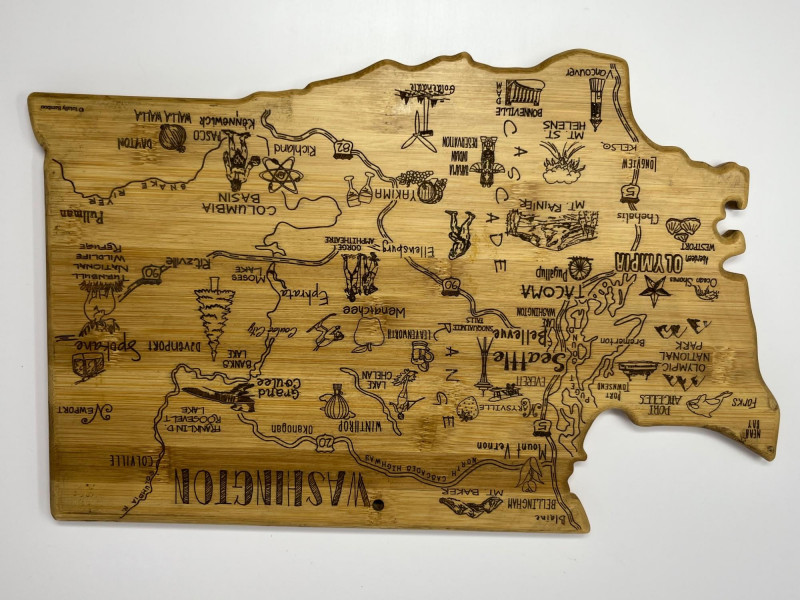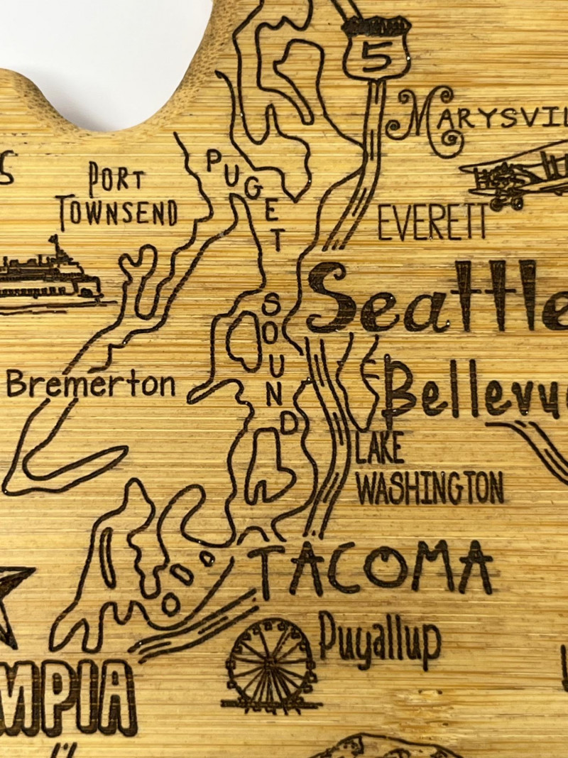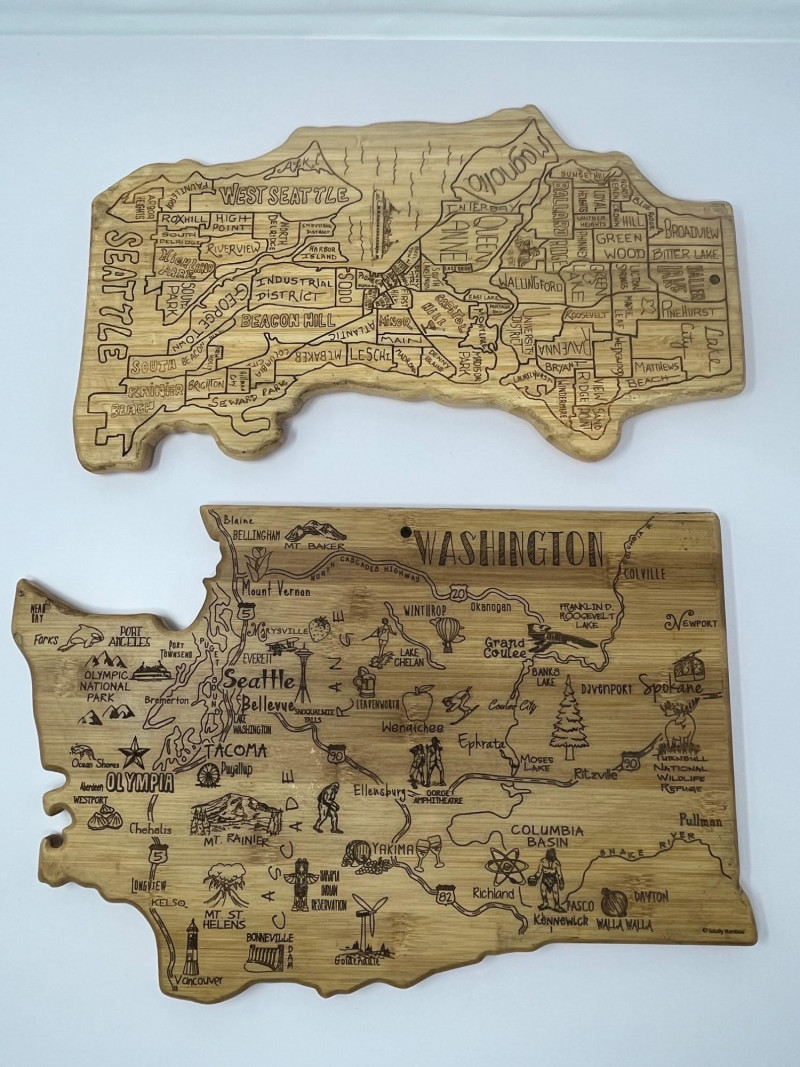 A visually stunning pair of carved bamboo cutting boards, each featuring a detailed map—one of Seattle and one of the state of Washington. These boards blend utility with artistry, offering geographic precision and decorative flair. Perfect for display, gifting, or light serving use. Included Boards: Seattle Map Board – Highlights neighborhoods like Ballard, Fremont, Capitol Hill, and the University District; includes stylized street labels and local landmarks Washington State Map Board – Features major cities including Seattle, Spokane, Tacoma, Olympia, and Vancouver; engraved with mountains, rivers, and regional icons Crafted from sustainably sourced bamboo, these boards are lightweight, durable, and naturally antimicrobial—ideal for kitchens that value both form and function.