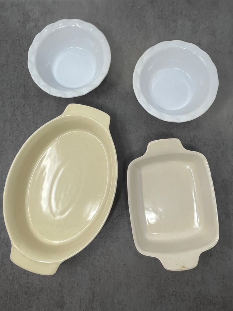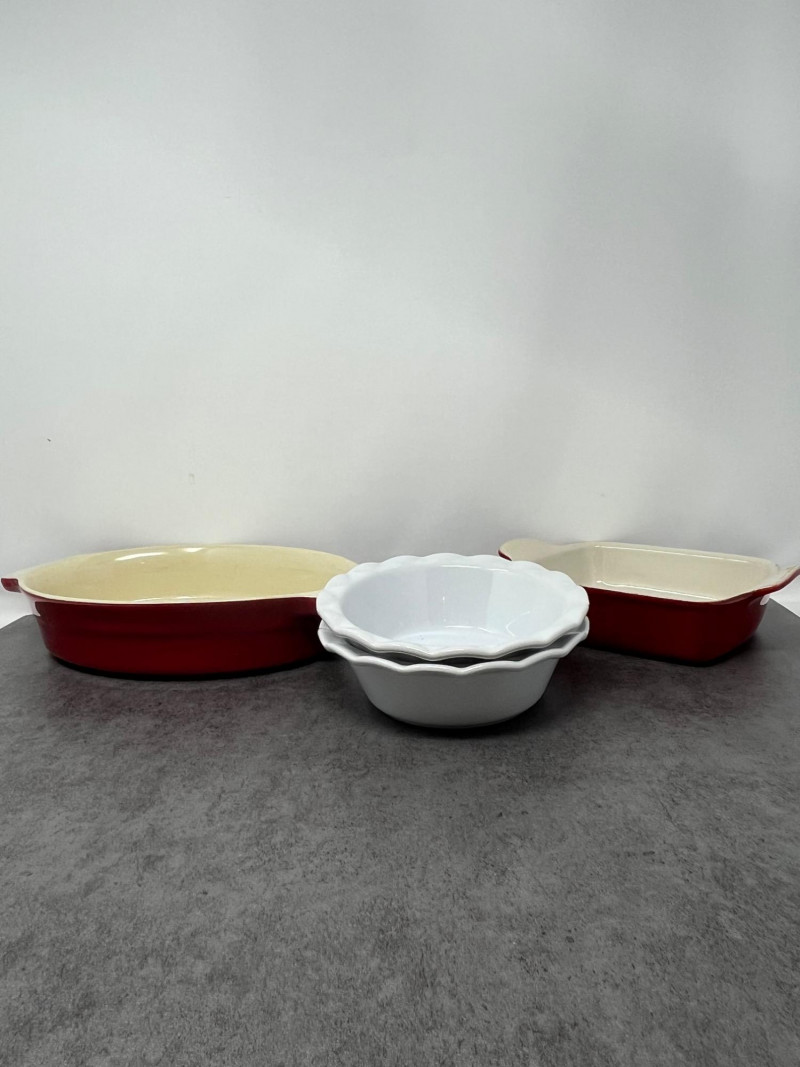 A clean and coordinated set of three ceramic baking dishes, ideal for oven-to-table presentation. Includes two white fluted round dishesand one bold red rectangular casserolewith a cream interior. Perfect for everyday cooking, holiday hosting, or staging that “just-baked” look. Included Pieces: 2 White Round Dishes– Fluted edges, ideal for quiche, cobbler, or deep-dish pie 1 Red Oval Dish- Off white interior, side handles for easy transport 1 Red Rectangular Dish– Cream-colored interior, side handles for easy transportDescription