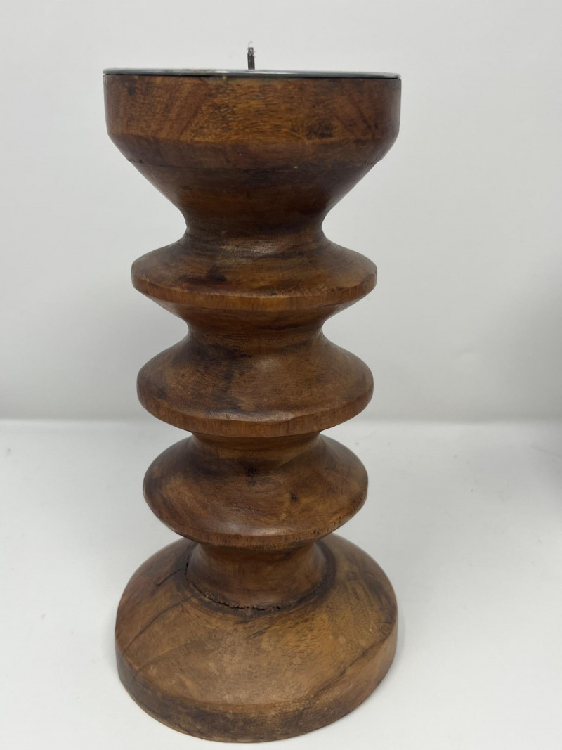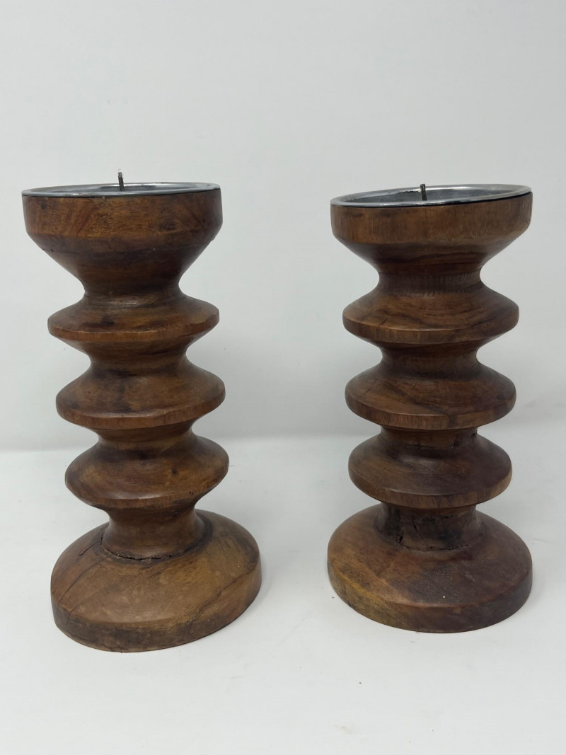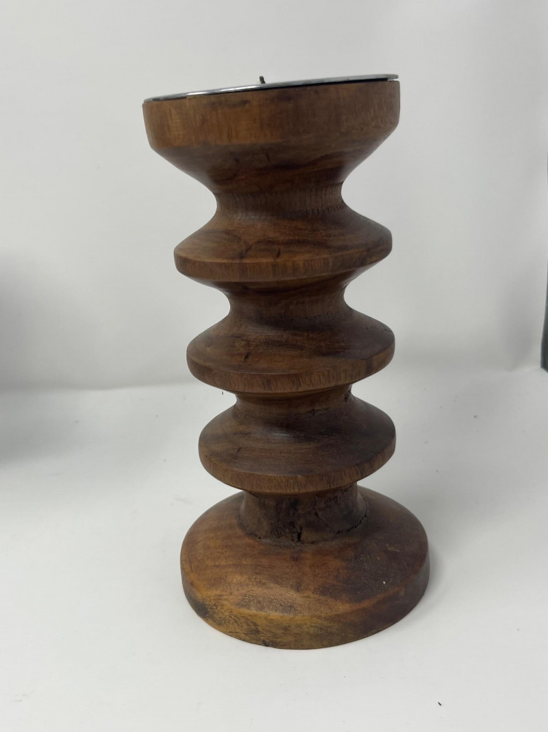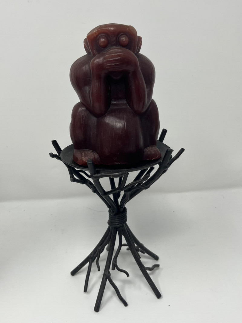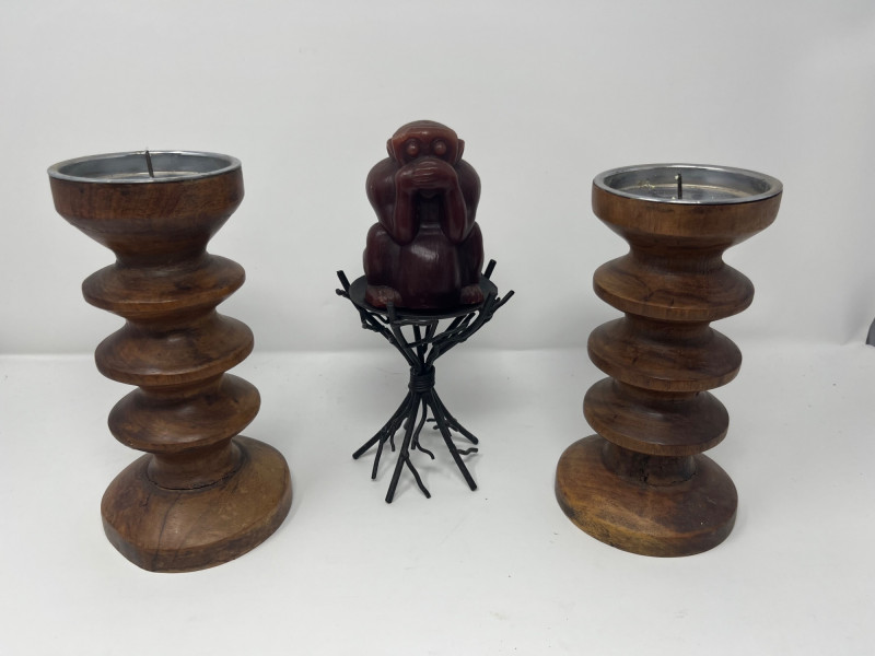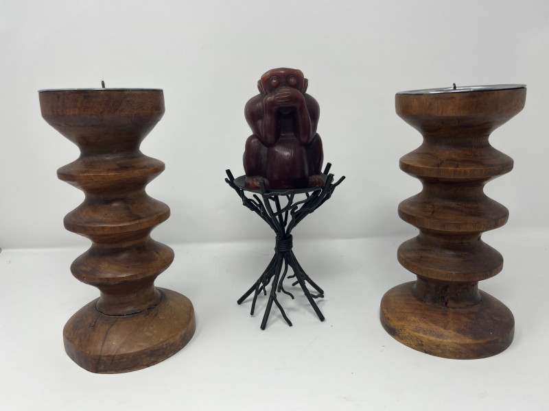 A visually striking trio of small-format décor, this lot pairs figural charm with bold, sculptural woodwork. Centerpiece: Carved “speak no evil” monkey in deep reddish-brown candle Perched on a black metal stand shaped like branching limbs Flanking Pair: Two solid wood candle holders with a stacked, geometric silhouette Each features a metal insert for taper candles