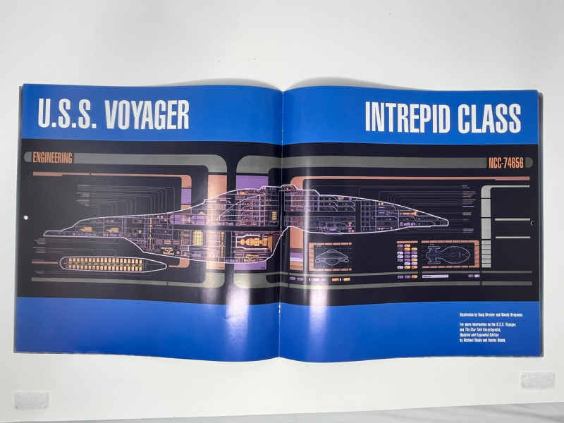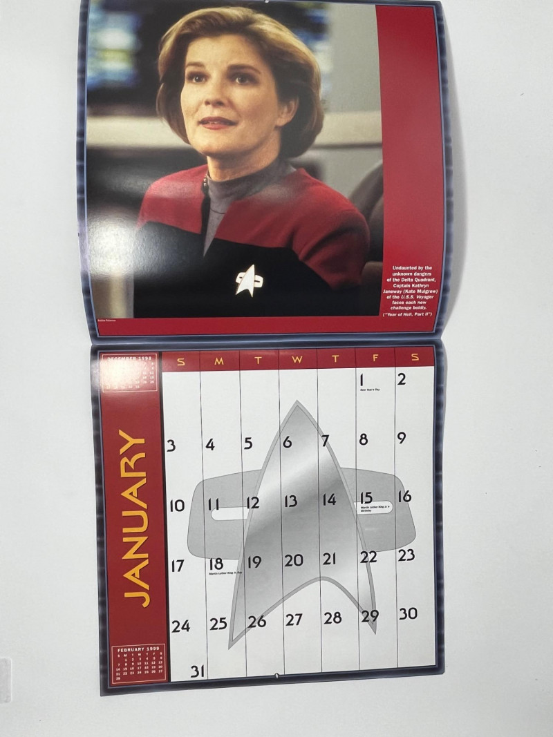 Vintage 1999 12 month calendar featuring signature of Kate Mulgrew, known for her starring role as Kathryn Janeway in the Star Trek: Voyager series. Full signatures reads as "Best Wishes - Kate Mulgrew" Each month features a high quality print of promotional images of characters and stills from episodes, complete with description blurbs. Center of the calendar features a two-page spread diagram of the USS Voyager Intrepid Class. You may not be able to travel back to 1999, but you can beam with nostalgia reliving the good ol' days.