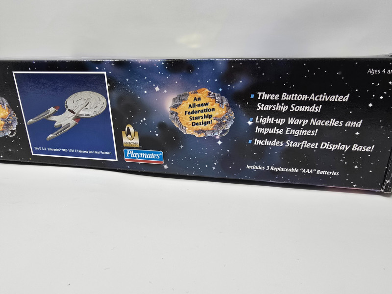 From the high-stakes drama of Star Trek: First Contact, this 1996 Playmates release brings the sleek, battle-ready Enterprise-E to life with lights, sounds, and display appeal. Features: Three button-activated starship sounds straight from the film Light-up warp nacelles and impulse engines for dynamic shelf presence Includes Starfleet Display Base for upright presentation Requires three AAA batteries (originals may be expired) Design Notes: Sleek, elongated hull design introduced in First Contact Authentic detailing true to the cinematic model Collector’s favorite for bridging the TNG era with big-screen action Condition: Presumed unused; electronics untested Packaging condition not specified—sold as-isStar Trek: First Contact U.S.S. Enterprise NCC-1701-E – Electronic Starship by Playmates (1996)