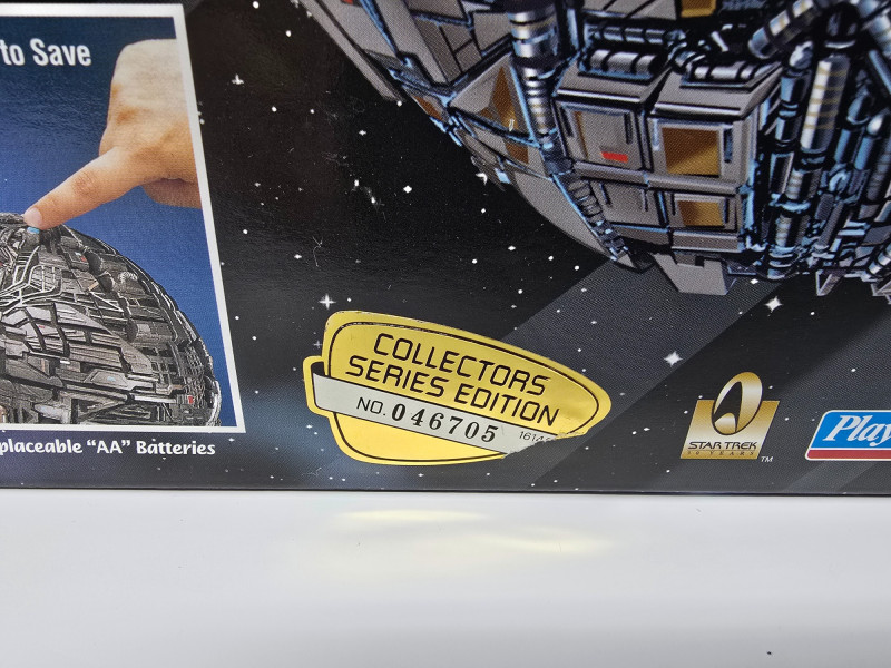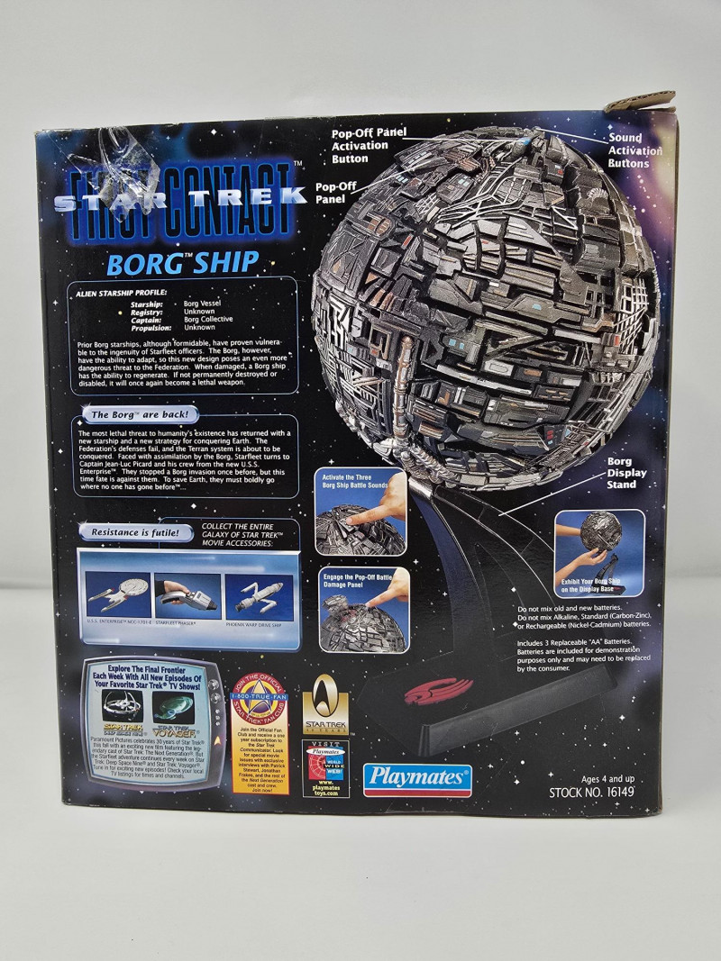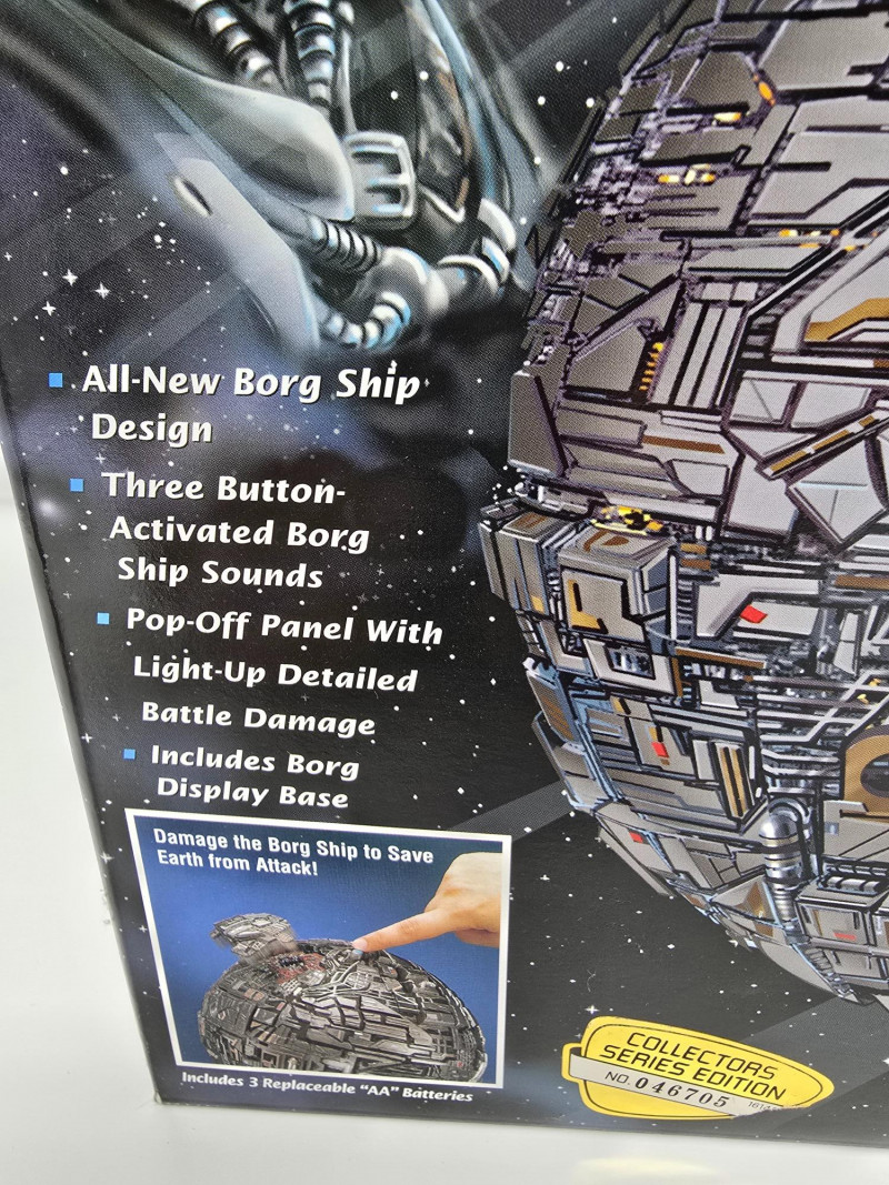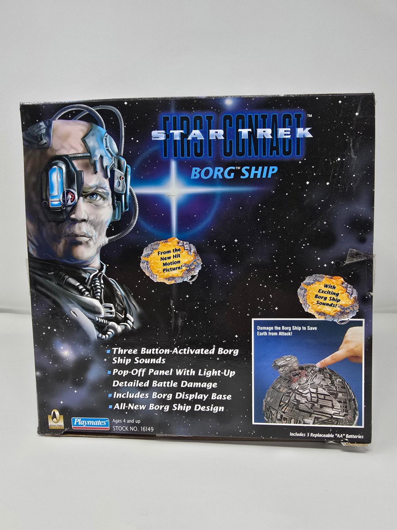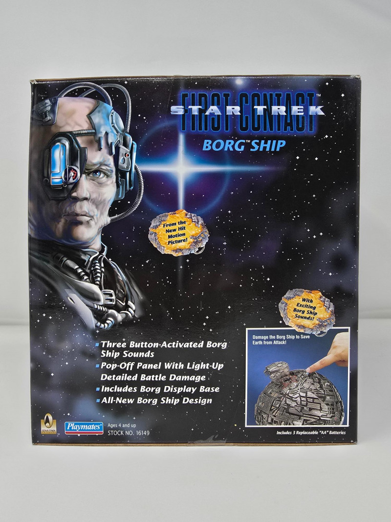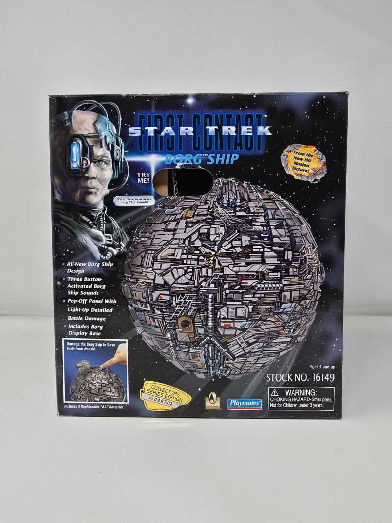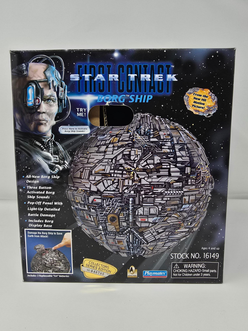 Star Trek: First Contact Borg Ship collectible toy by Playmates. It is part of the Collector's Series Edition. The toy features an all-new Borg Ship design with three button-activated Borg Ship sounds. It includes a pop-off panel with light-up detailed battle damage. A Borg Display Base is also included.