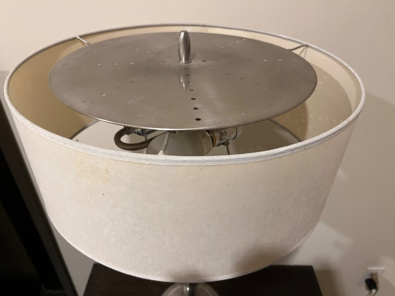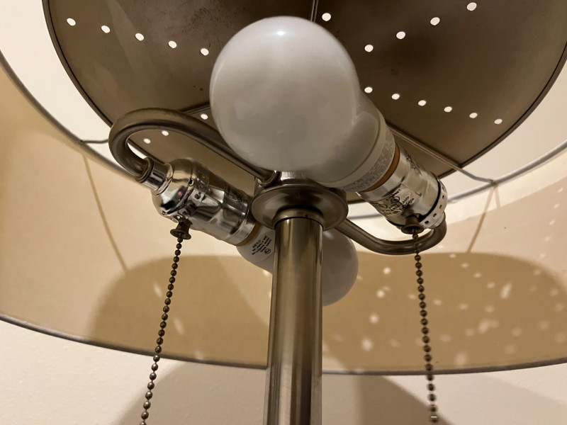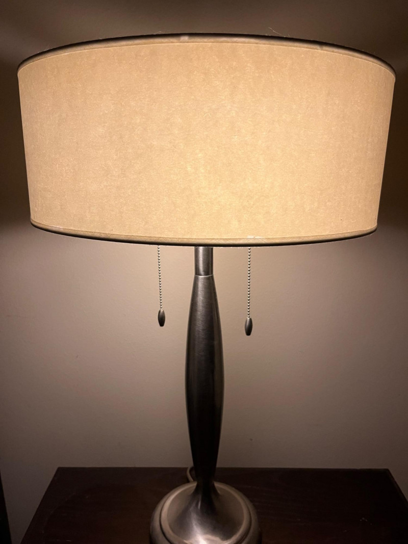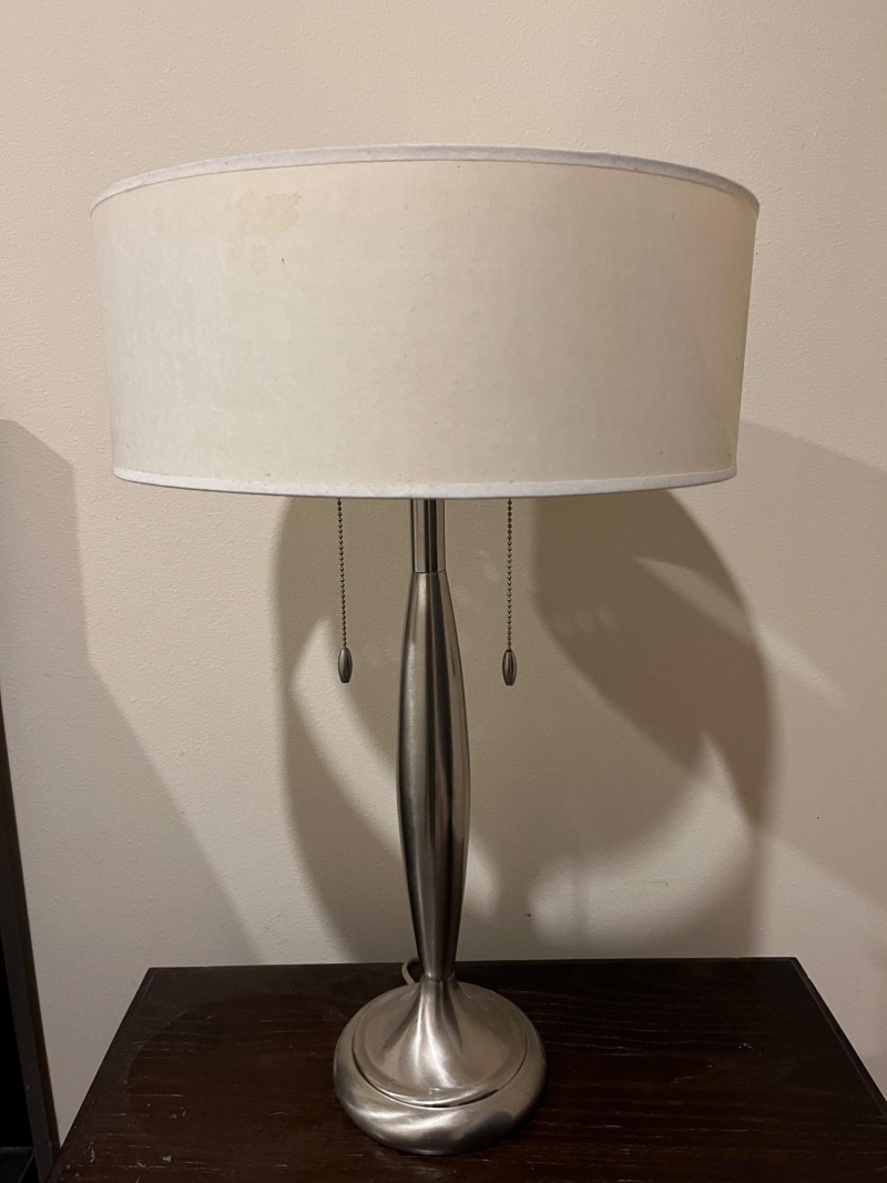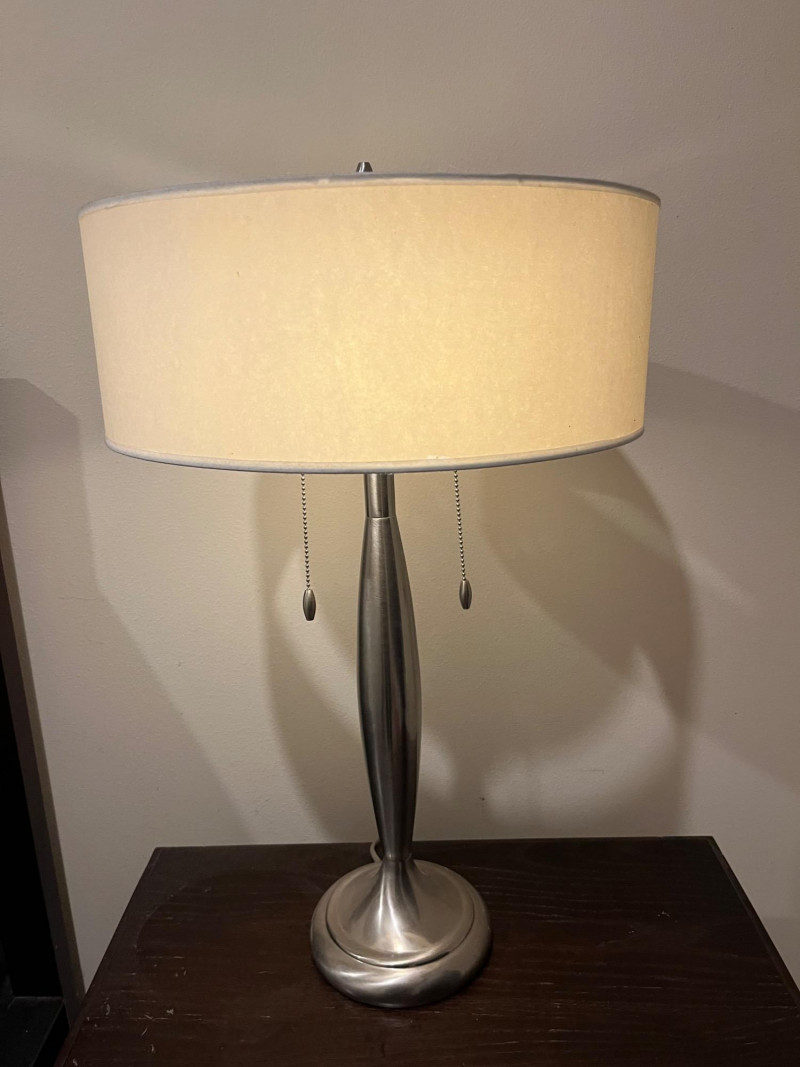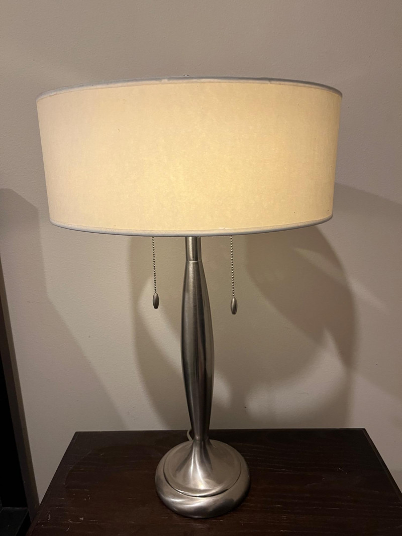 Sleek and slim modern silver table lamp. Great for bedside reading or for being a couch side illumination. Design features 2 light sockets for most controller lighting, with a warm lampshade creating an inviting glow that brightens a space that's easy on the eyes. Two pull chains control if only one or both of the lightbulbs are turned on.