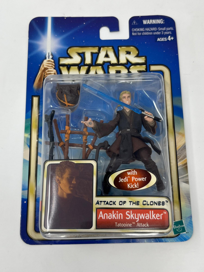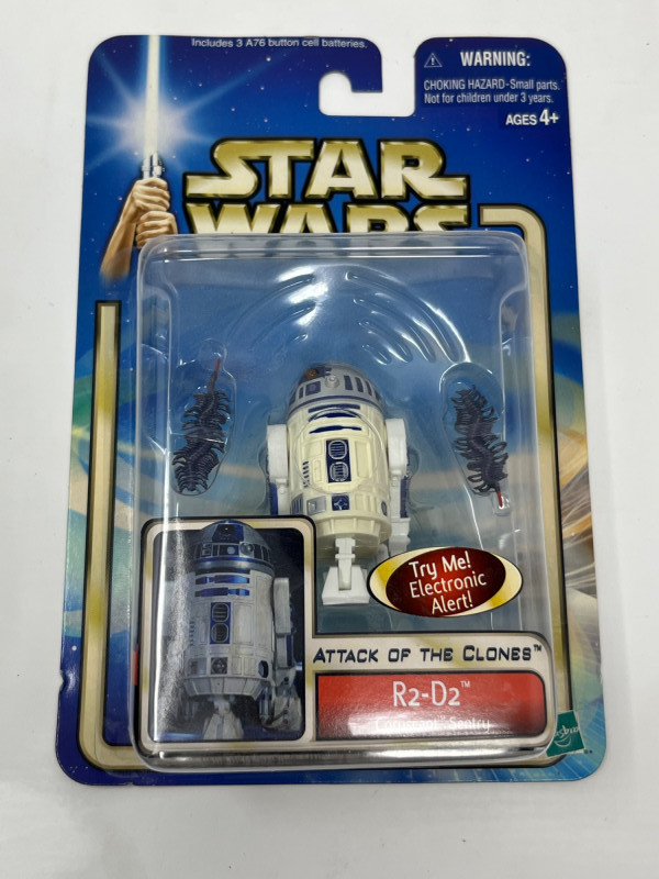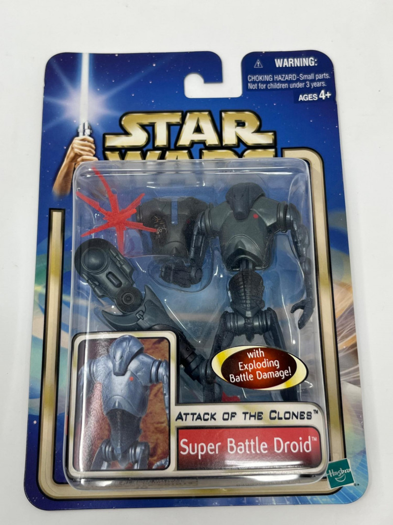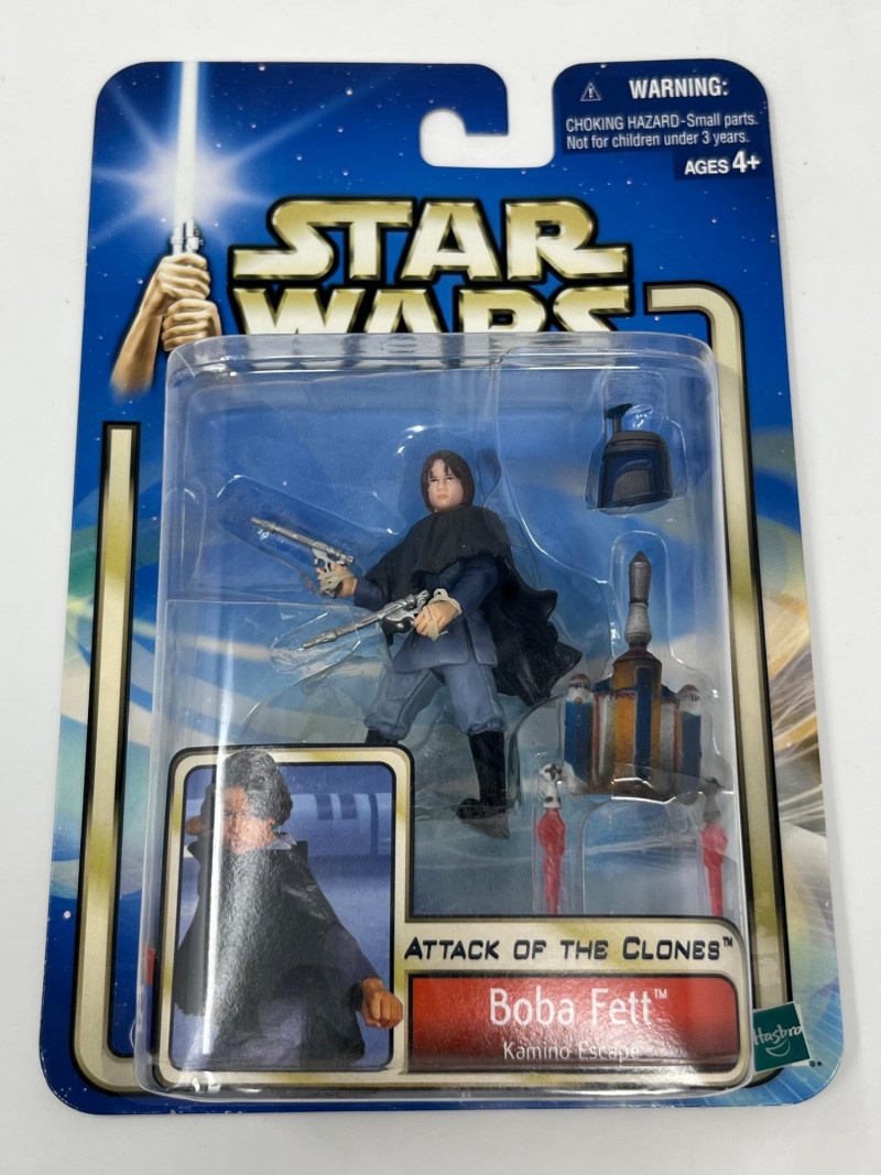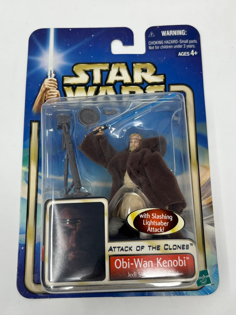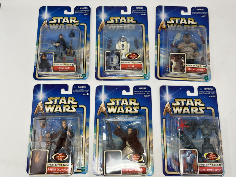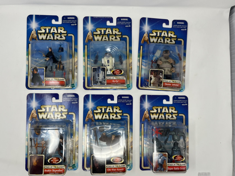 A dynamic six-figure set from Hasbro’s Attack of the Clones line, each figure is complete in box (CIB) with accessories and character artwork. This lot features a mix of Jedi, droids, bounty hunters, and diner wisdom—perfect for collectors building out their prequel trilogy shelf. Figures Included: Anakin Skywalker – Jedi-in-training with lightsaber and signature scowl Obi-Wan Kenobi – Cloaked and ready for diplomacy or duels R2-D2 – Loyal astromech with accessory detail Super Battle Droid – Heavily armored Separatist enforcer Boba Fett – Young clone with bounty hunter legacy in the making Dexter Jettster – Four-armed diner owner with blaster and backstory Packaging Notes: All figures sealed in original Hasbro blister packs Includes character-specific accessories and movie artwork Star Wars branding with Attack of the Clones styling Condition: Packaging shows light shelf wear consistent with age Sold as-is