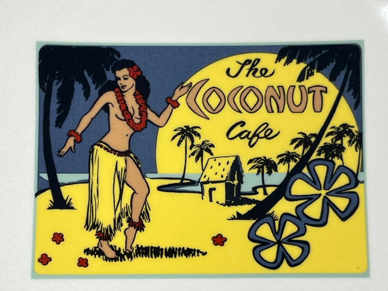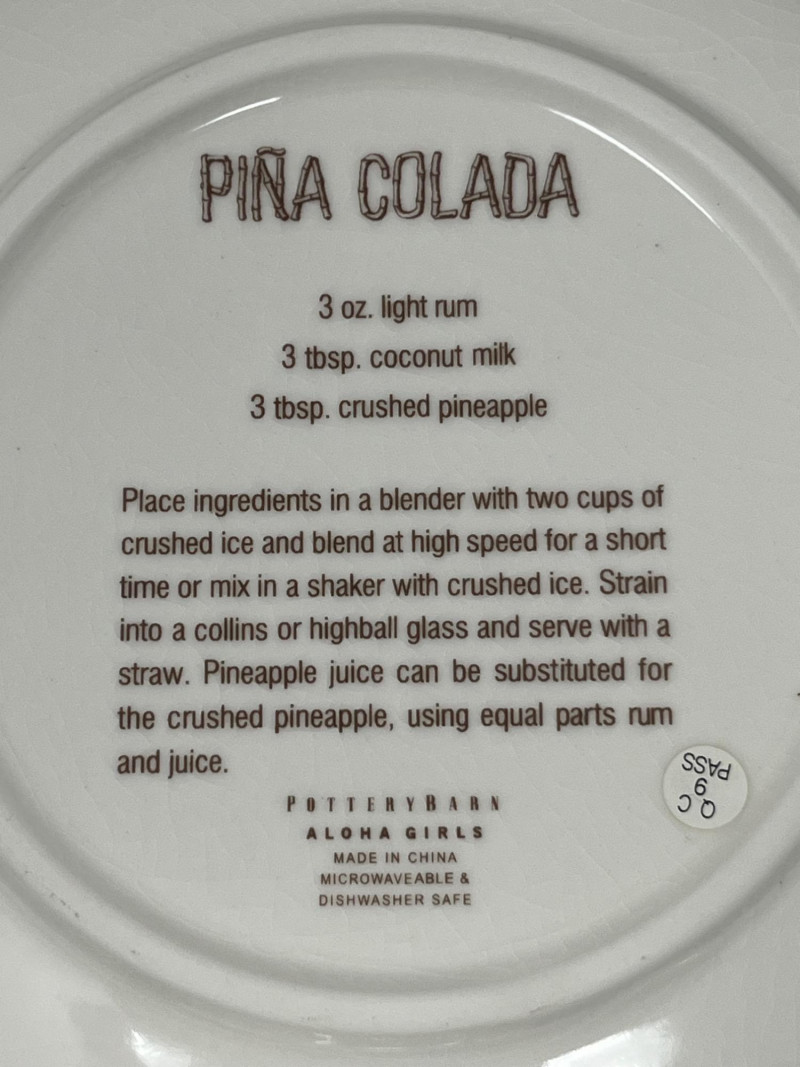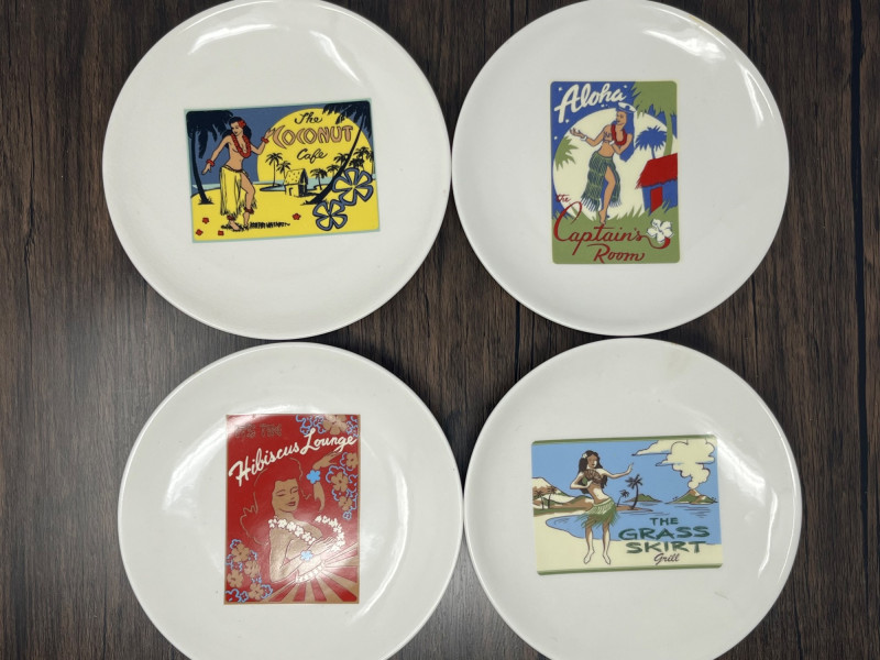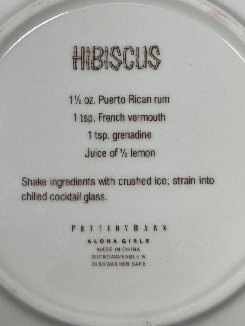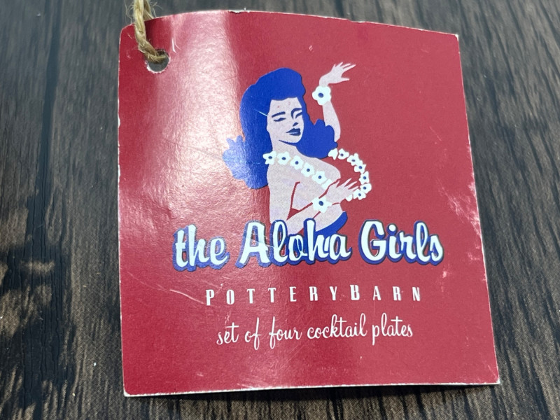 A vibrant and cheeky set of four ceramic dessert plates from Pottery Barn’s limited-edition Aloha Girls series, each featuring a vintage-style tropical illustration with playful text. These plates channel the spirit of mid-century Hawaiian postcards and tiki lounge kitsch—ideal for collectors, entertainers, or anyone who likes their tableware with a wink. Designs include: “The Coconut – The Café at The Royal” “Aloha – Captain’s Room” “The Hibiscus Lounge” “The Grass Skirt Grill” Each plate showcases a stylized island girl in a lush tropical setting, with bold colors and nostalgic typography.Description