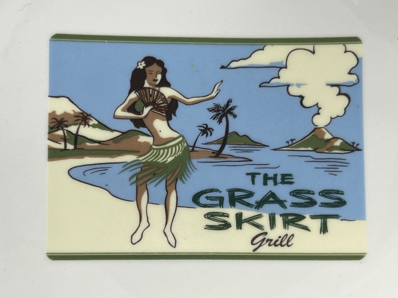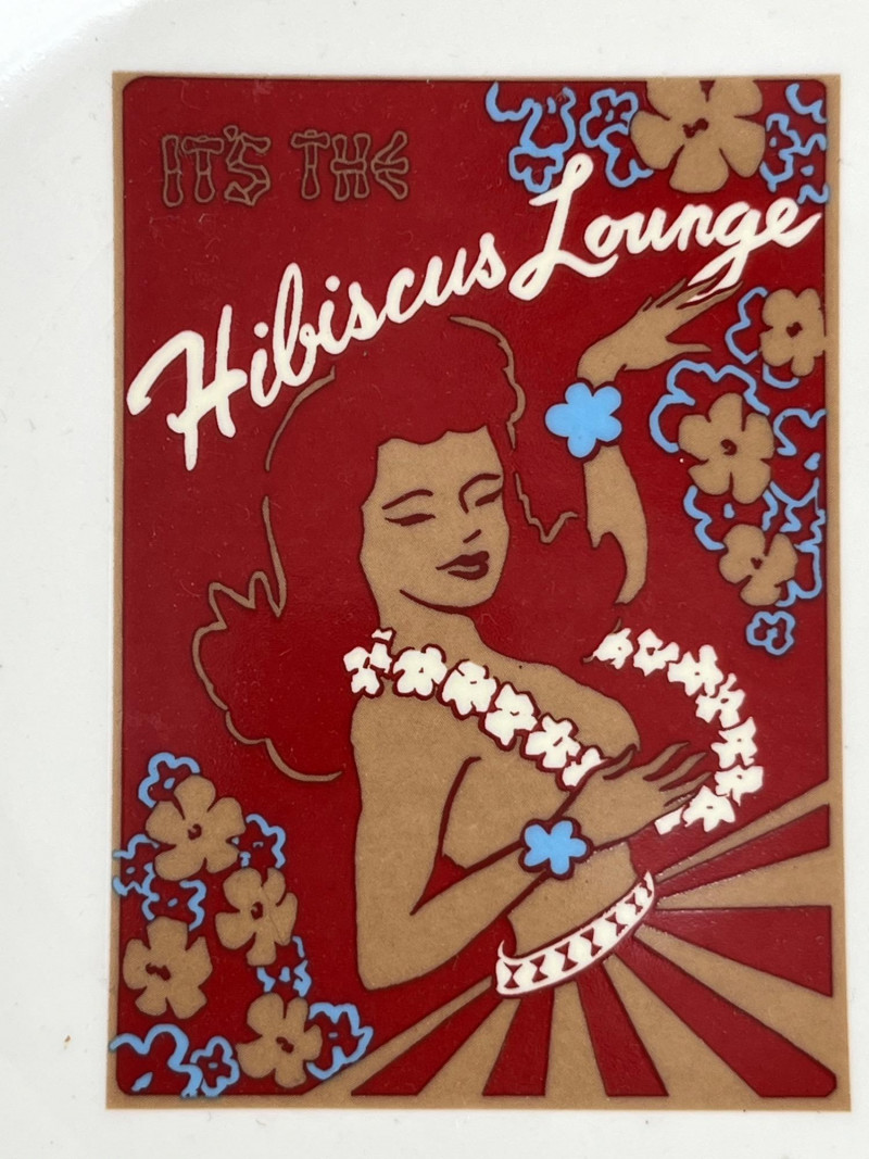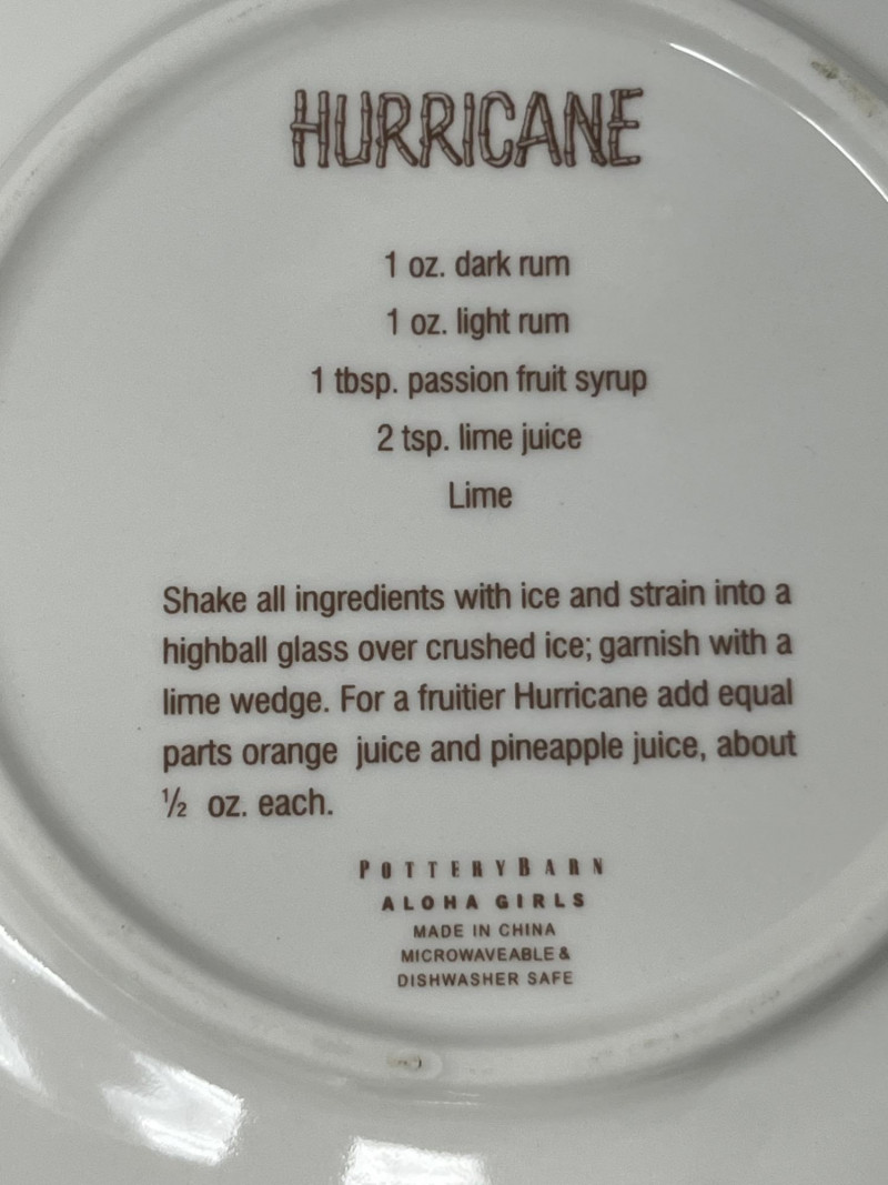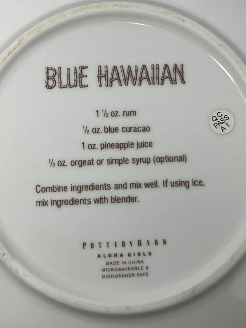 A vibrant and cheeky set of four ceramic dessert plates from Pottery Barn’s limited-edition Aloha Girls series, each featuring a vintage-style tropical illustration with playful text. These plates channel the spirit of mid-century Hawaiian postcards and tiki lounge kitsch—ideal for collectors, entertainers, or anyone who likes their tableware with a wink. Designs include: “The Coconut – The Café at The Royal” “Aloha – Captain’s Room” “The Hibiscus Lounge” “The Grass Skirt Grill” Each plate showcases a stylized island girl in a lush tropical setting, with bold colors and nostalgic typography.Description