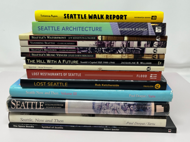 A rich and varied collection of 13 books exploring Seattle’s architectural evolution, neighborhood identities, cultural quirks, and vanished icons. From Capitol Hill’s early days to the Space Needle’s symbolic rise, this lot offers a deep dive into the Emerald City’s past and present—perfect for historians, designers, or anyone who’s ever loved a rainy walk through Belltown. Titles include: Seattle Walk Report by Susanna Ryan Seattle Architecture by Maureen R. Elenga Seattle’s Waterfront by Joy Keniston-Lundberg Vanishing Seattle and Seattle’s Belltown by Clark Humphrey Seattle Neighborhoods Vol. 1 by Julie D. Ranniger The Hill With A Future: Seattle’s Capitol Hill 1900–1946 by Jacqueline B. Williams Lost Restaurants of Seattle by Chuck Flood Lost Seattle by Rob Ketcherside Seattle: Now and Then Volumes I–III by Paul Dorpat The Space Needle: Symbol of Seattle by Robert SpectorDescription