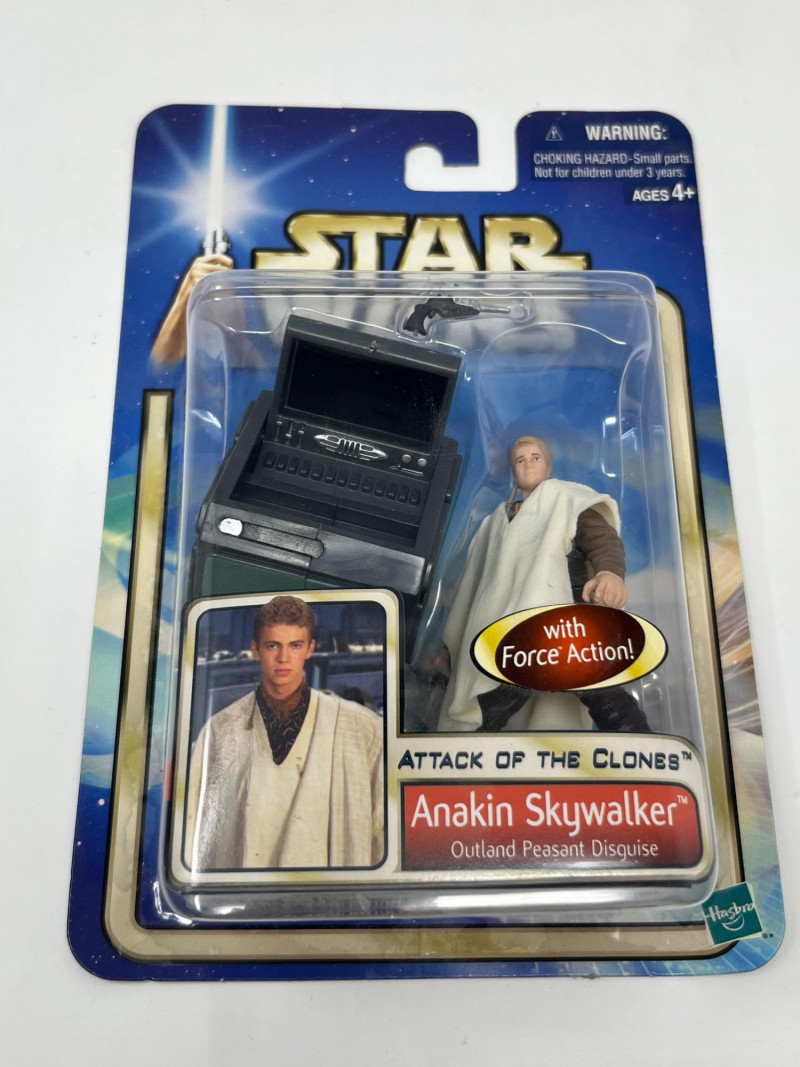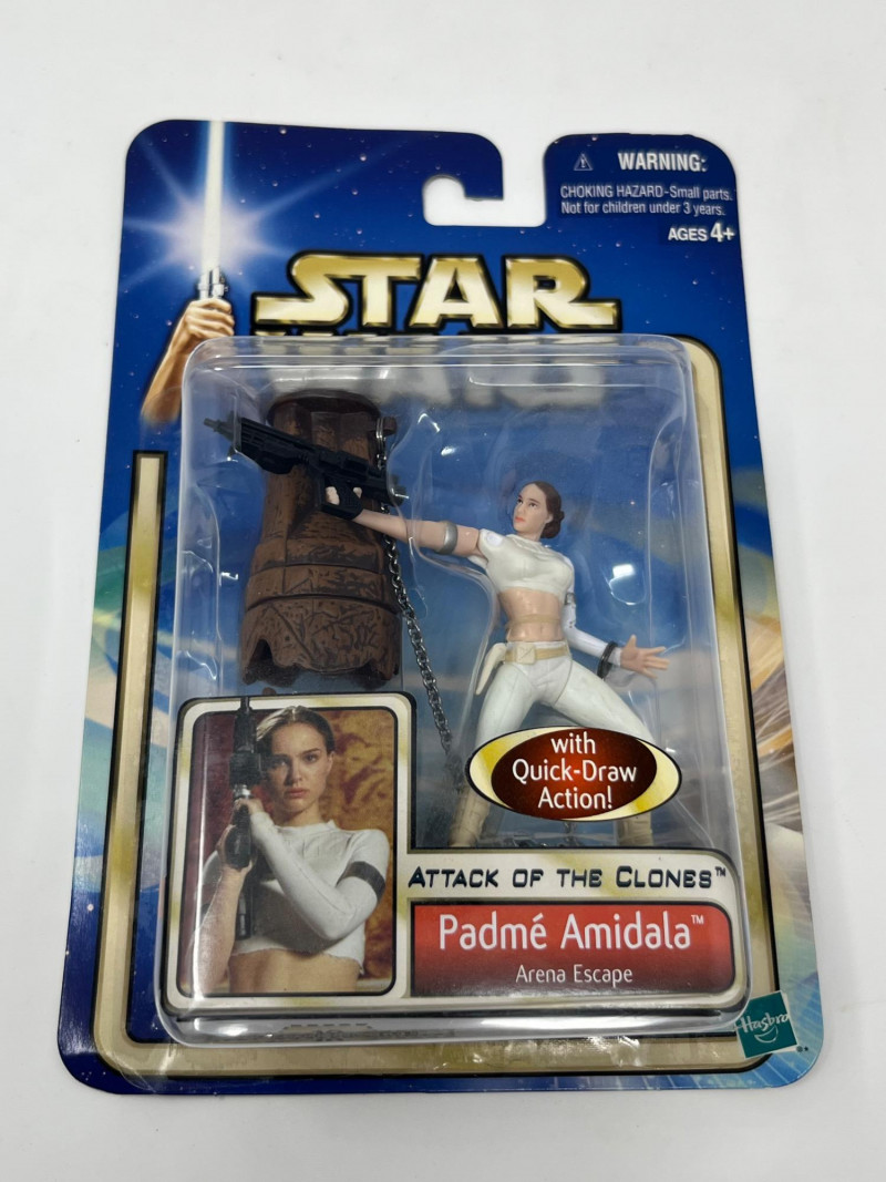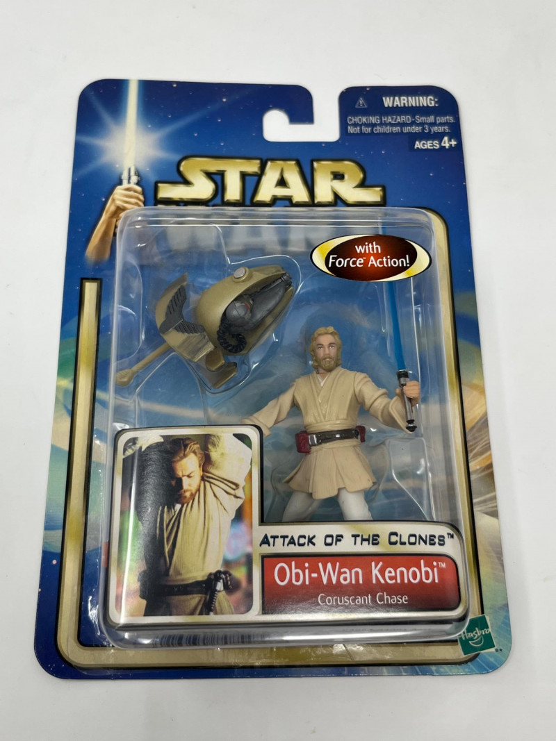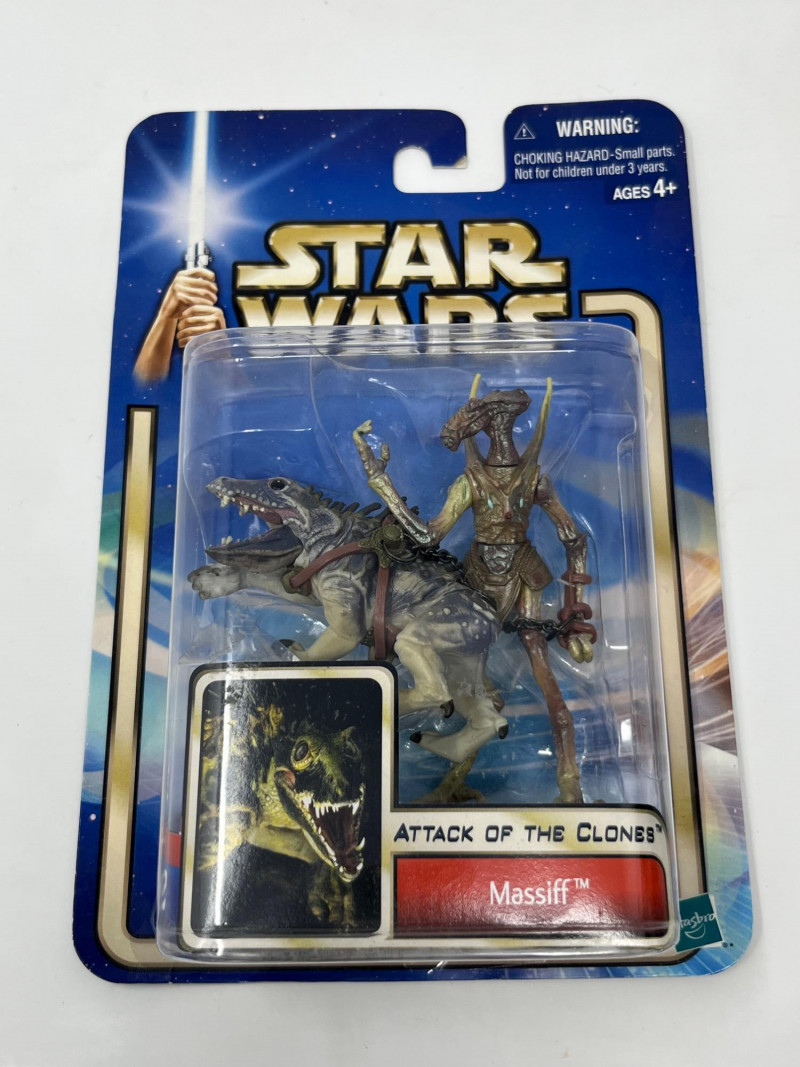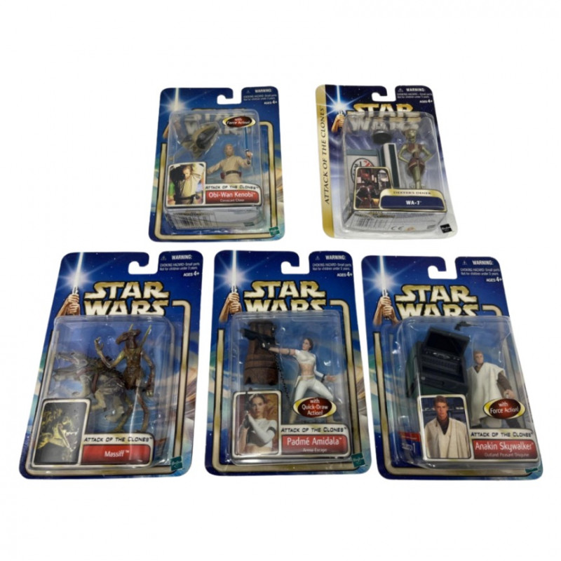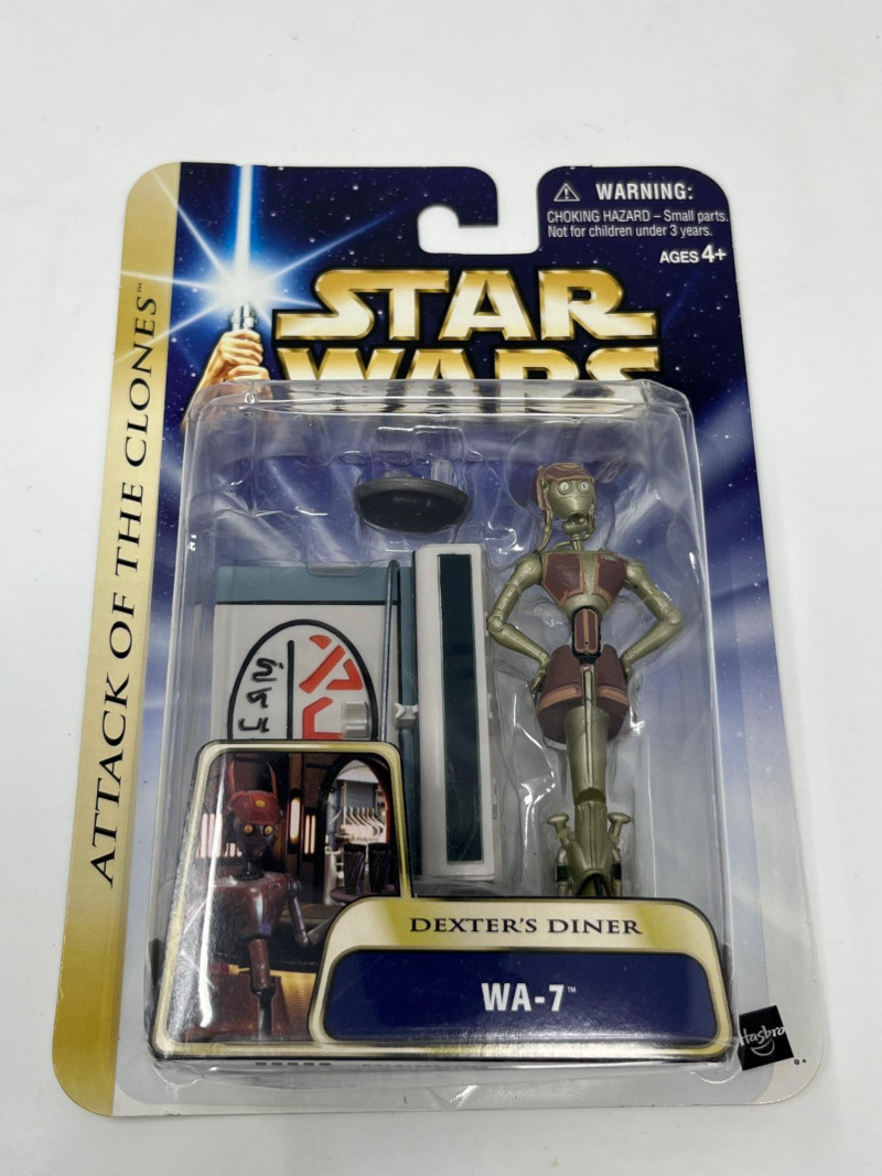 A complete-in-blister set of six Star Wars action figures from the Attack of the Clones series, each sealed in original packaging with character-specific accessories and dramatic card art. Released in the early 2000s, these figures spotlight key characters and creatures from Episode II—including a fan-favorite droid with diner sass. Included Characters: Obi-Wan Kenobi – Jedi Master with lightsaber and display stand Anakin Skywalker – Padawan with lightsaber and display stand Padmé Amidala – Blaster-wielding senator in action-ready attire R2-D2 (Droid Factory Flight) – Astromech droid with flight accessories Massiff – Ferocious Geonosian beast with chain accessory WA-7 – Dexter’s Diner waitress droid with tray and retro flair