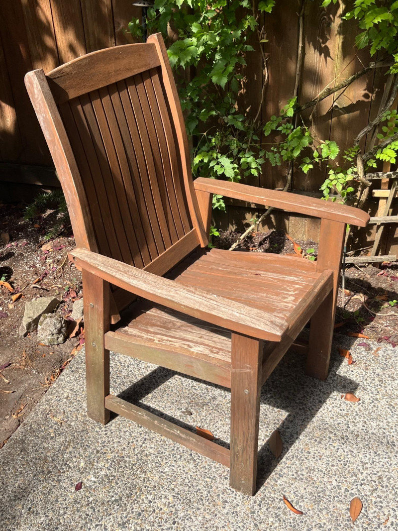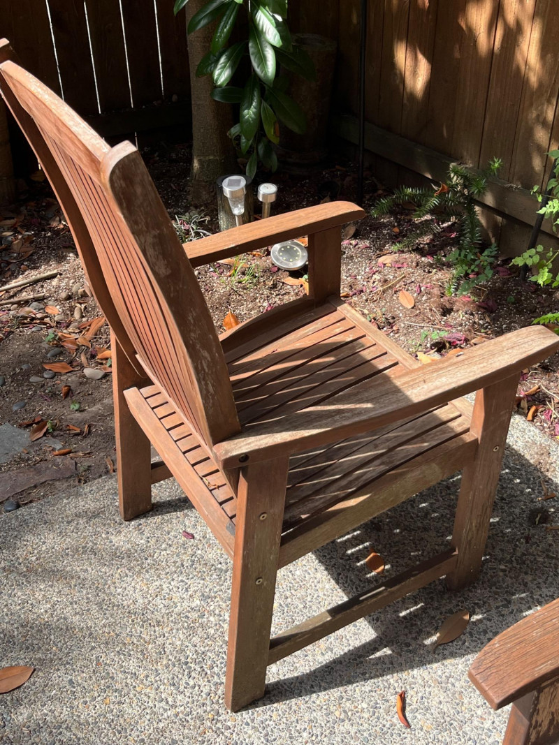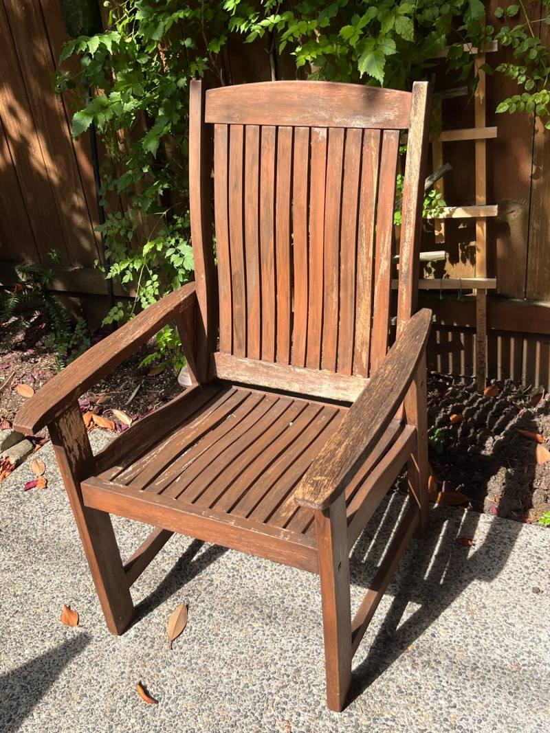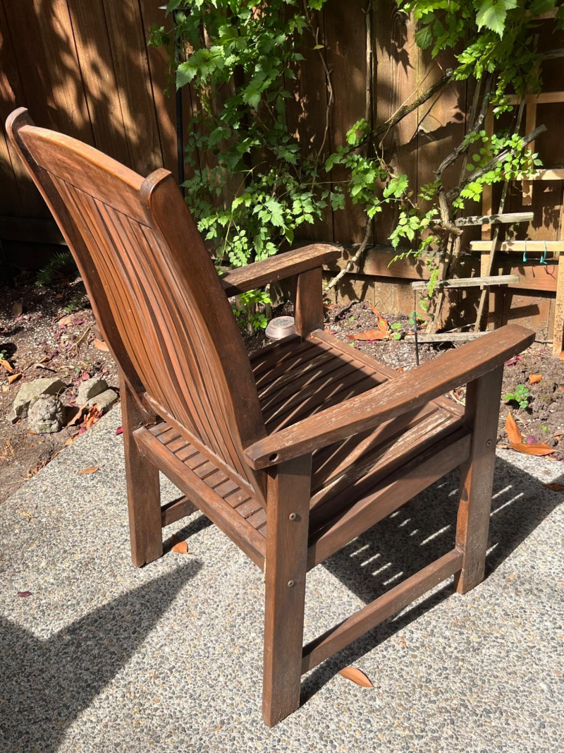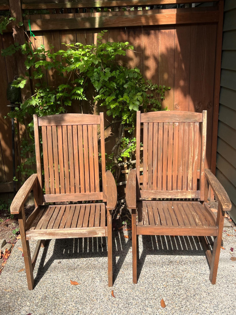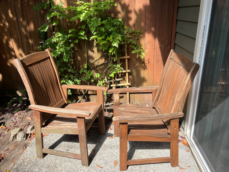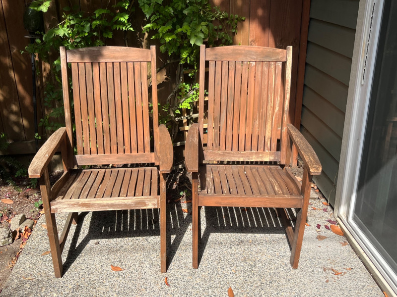 Pair of beautiful wood deck chairs. Solid and sturdy construction, but lightweight for easy movement around your deck and yard. Slat back design with a solid seat that could have a cushion fitted for added comfort. Armrests are well fitted and perfect for daytime lounging. Wood has some wear in spots, just needing a quick refinishing to shine like new!