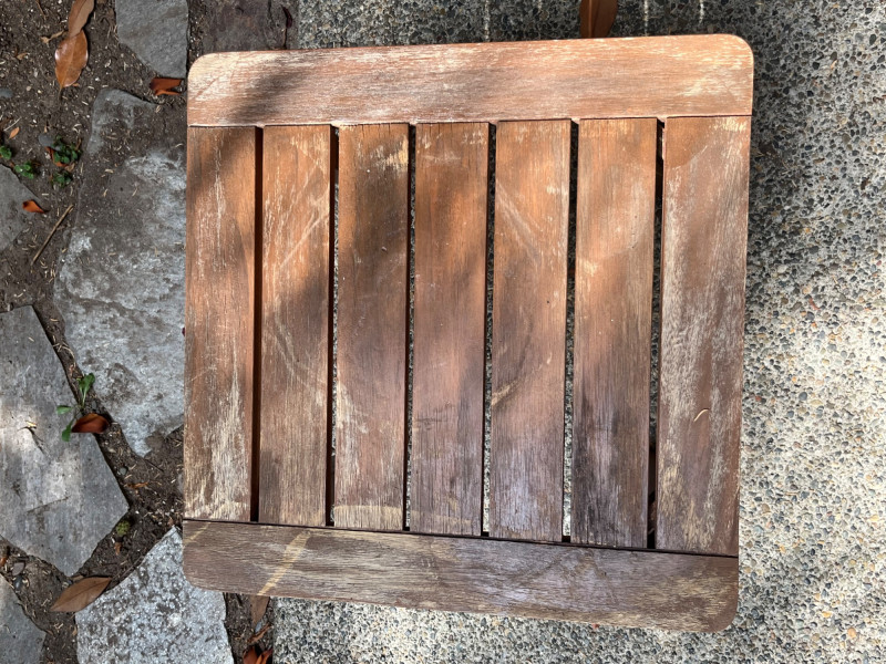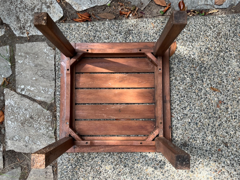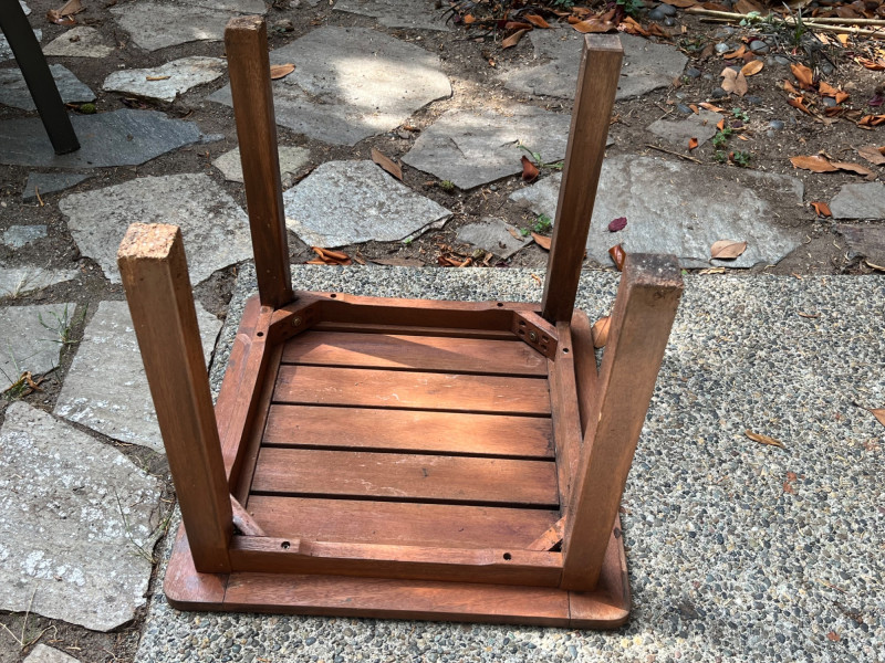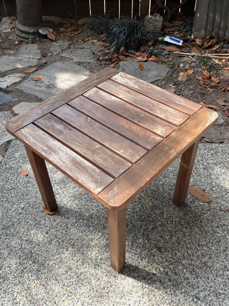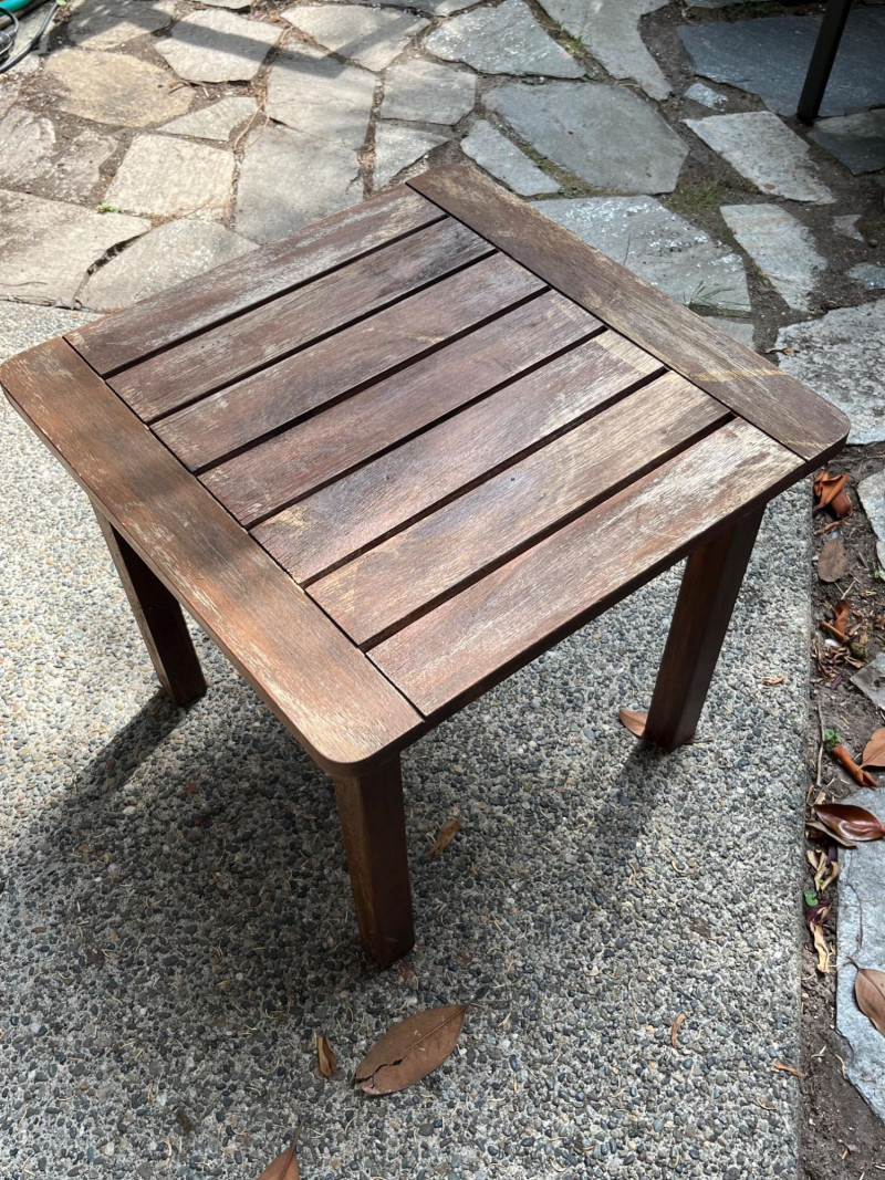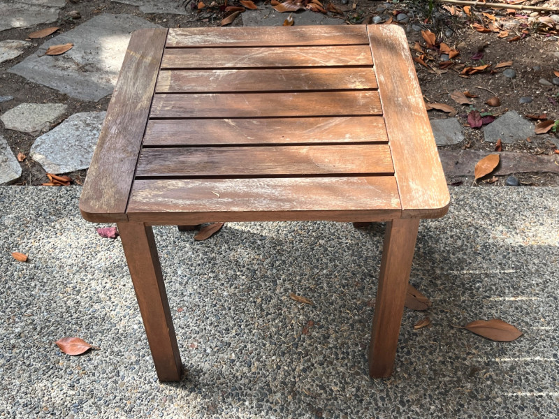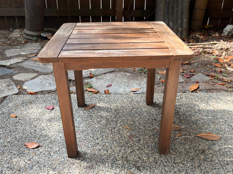 Solid wood outdoor side table. Measuring 20x20 square, it makes a great choice to sit between 2 chairs. Use it for holding drinks, playing a game of cards, or to rest a good book on a sunny day. Slat design is sturdy, with just a quick refinishing in some areas to look like it's new from the store.