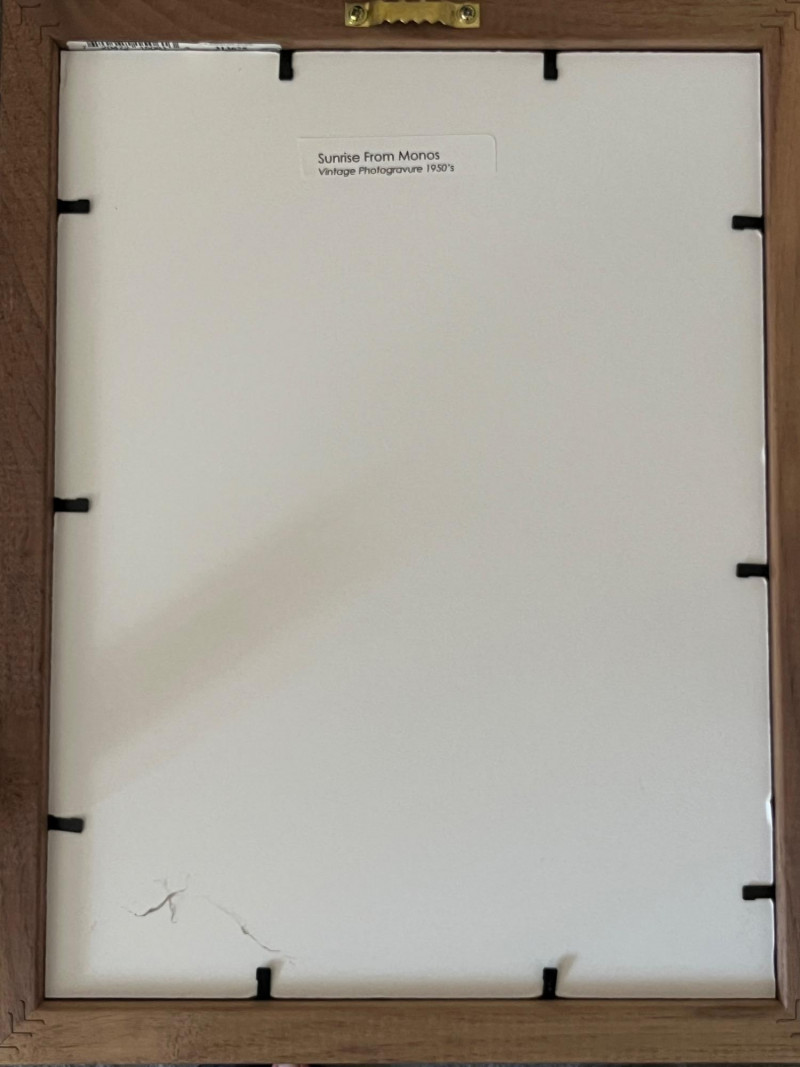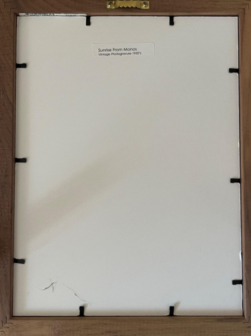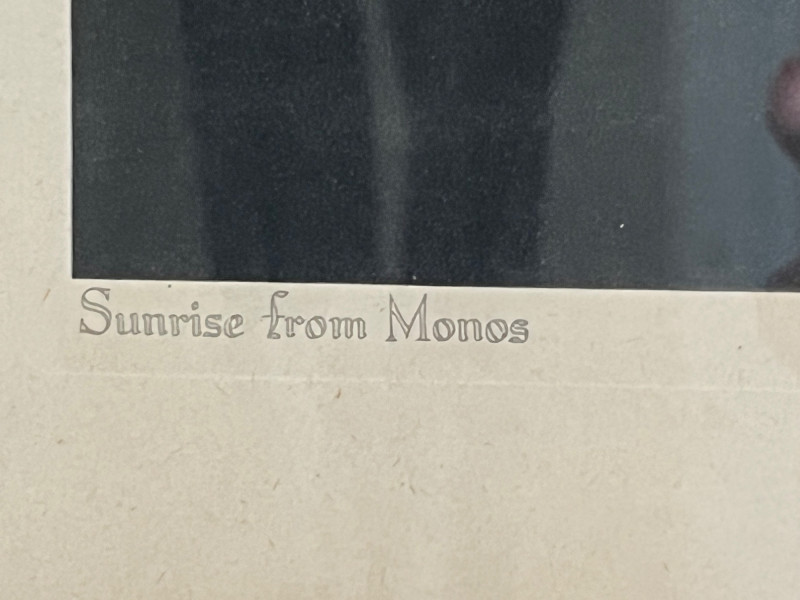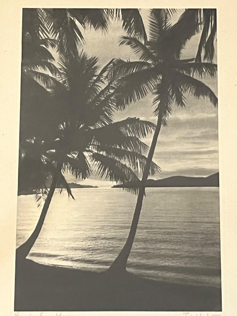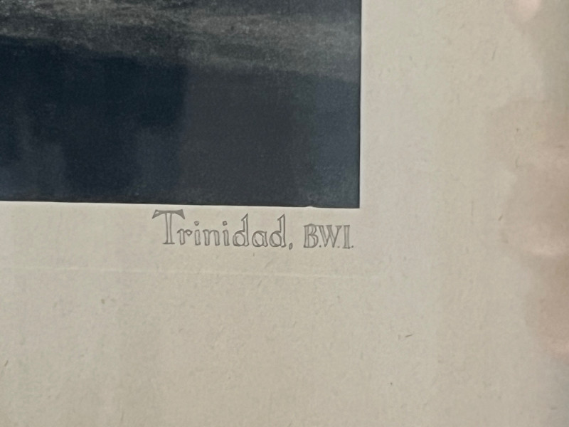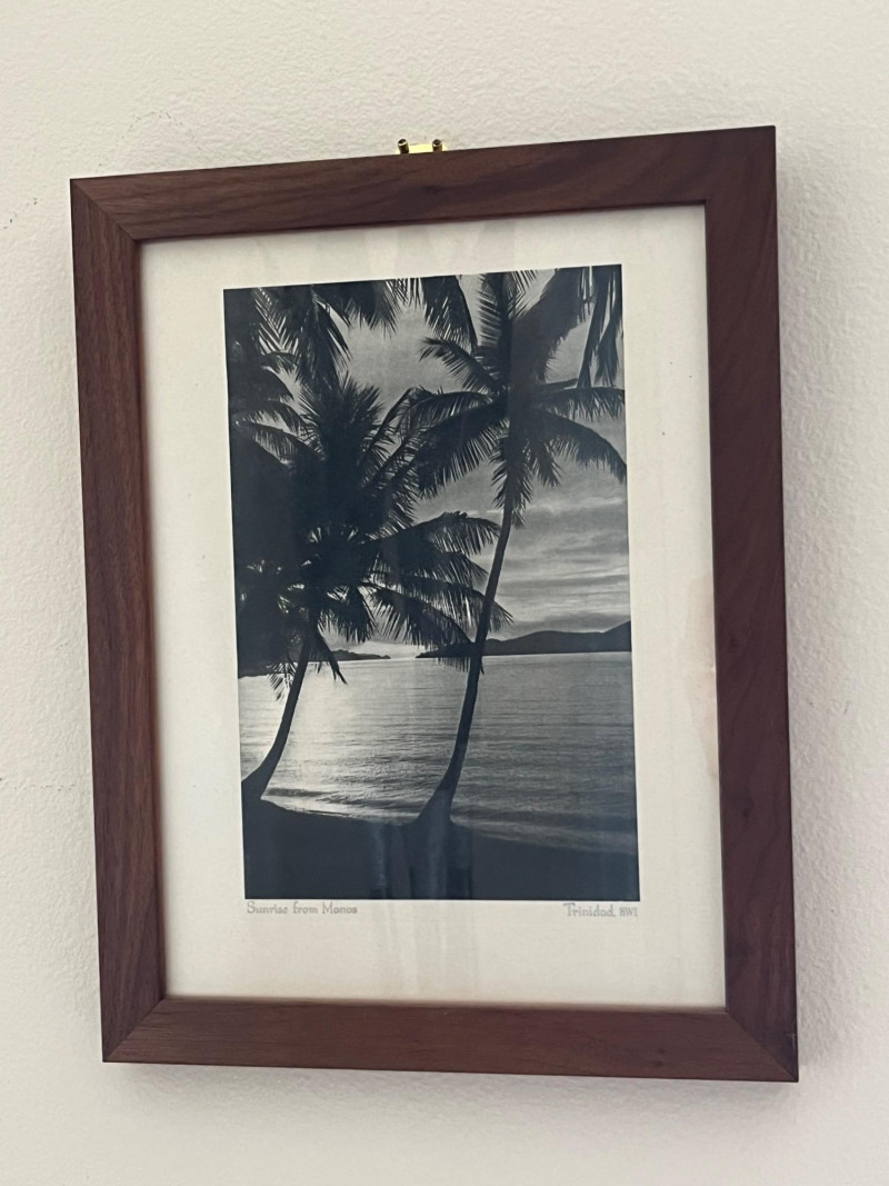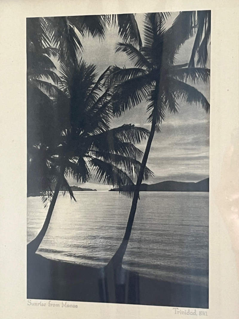 Framed photo of Monos, Trinidad in black & white.. Back of the frame lists the title "Sunrise in Monos" and a date of the 1950s. Small profile makes it great for hallways or tiny rooms, or can be reframed to sit at your desk as you daydream of your next tropical getaway.