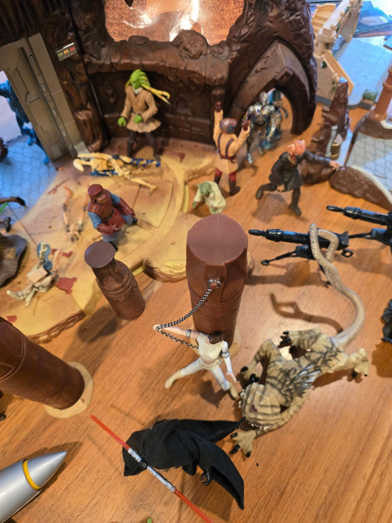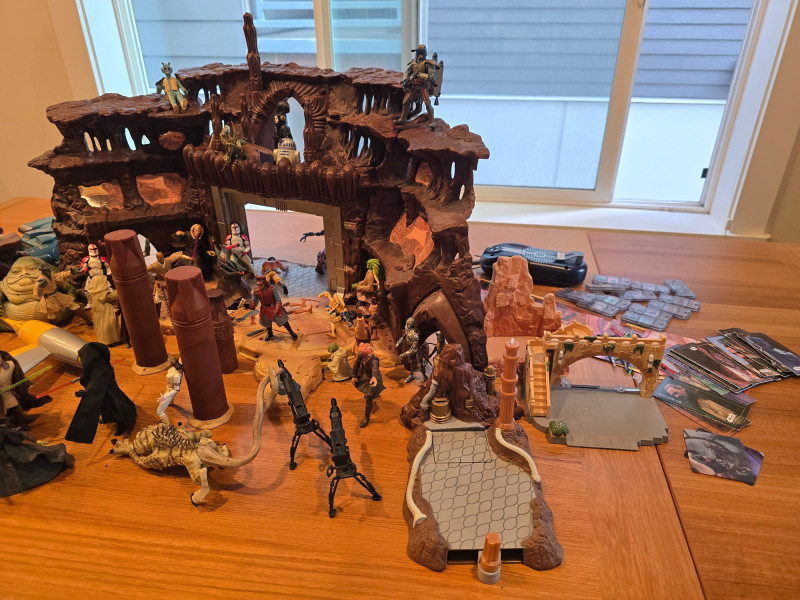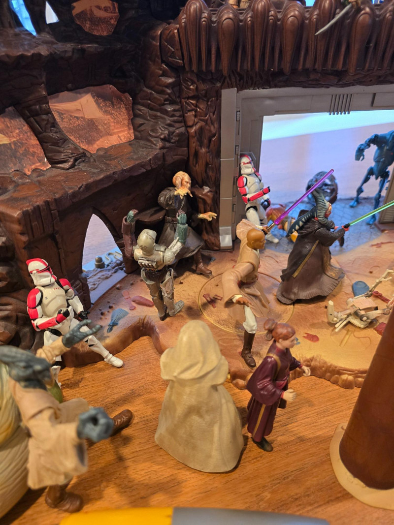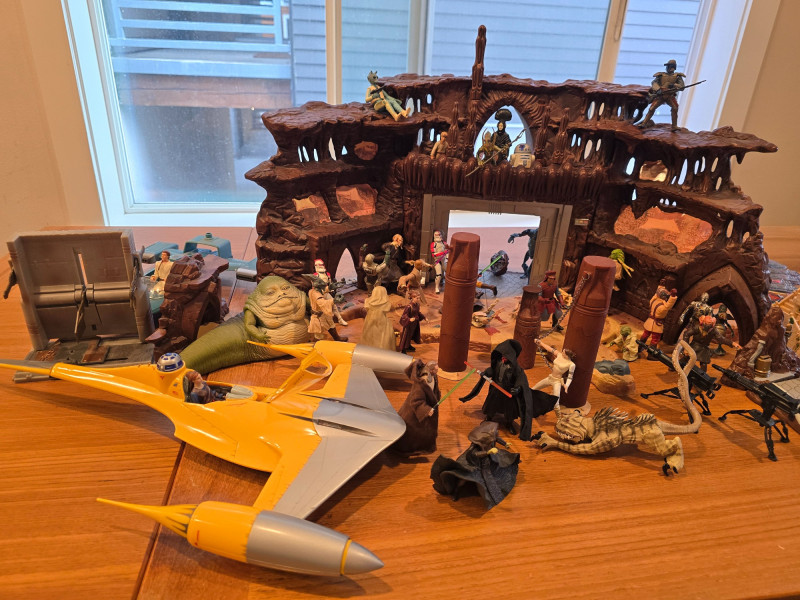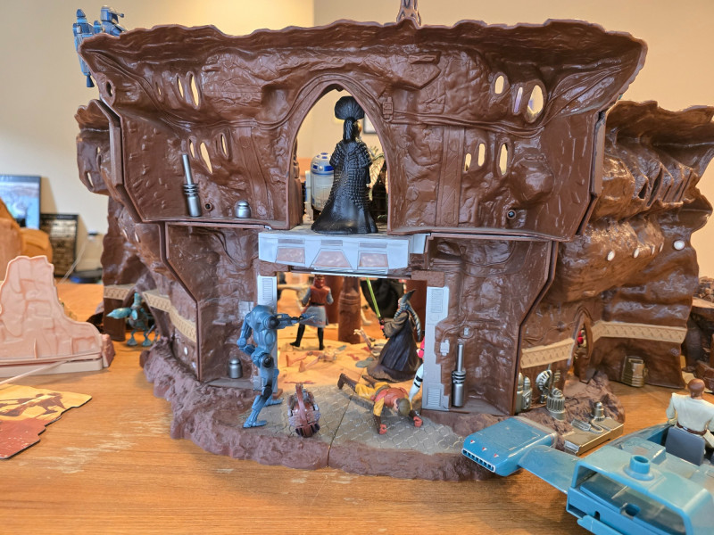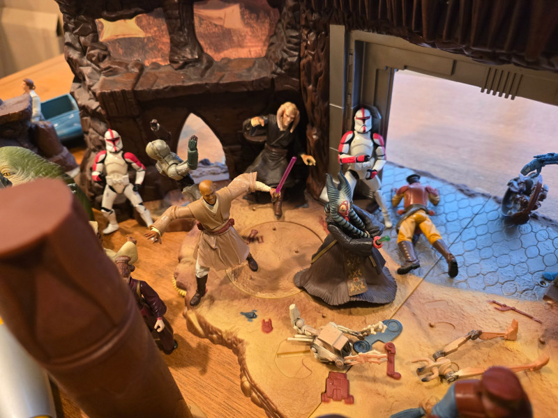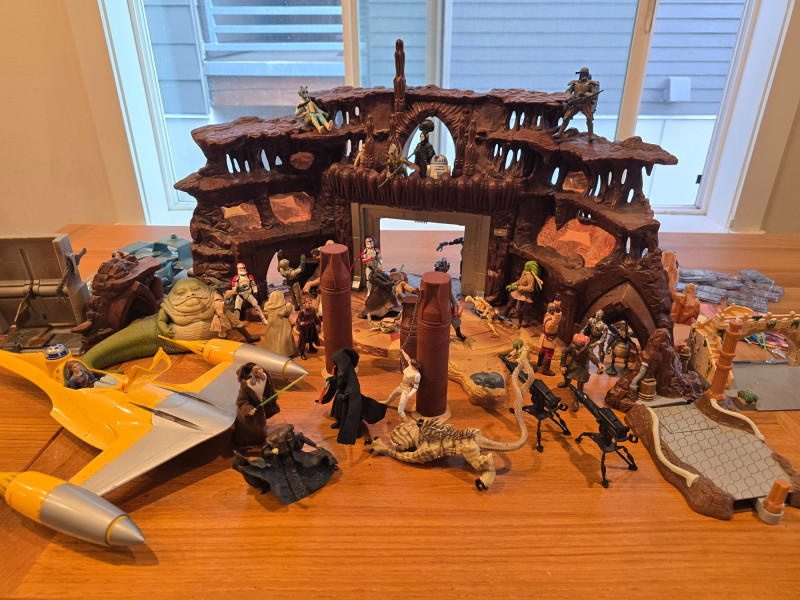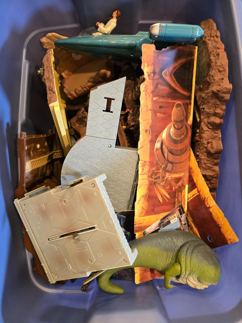 Geonosis battle arena with characters from different time and space! Lot of miscellaneous star wars action figures from different film adoptions all summoned to Geonosis! Toys are used and many do not come with original accessories. Expand your collection, pick up some extras, or maybe gain back some pieces you lost! May the force be with you in your bidding! This lot will come packed in a tote for transport.