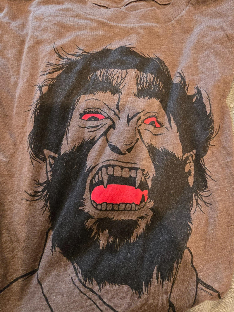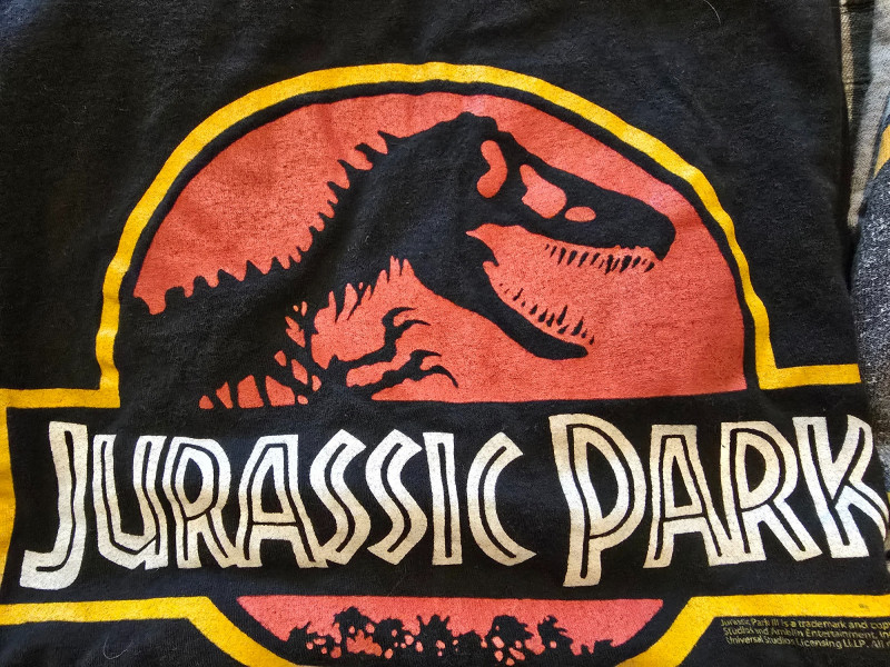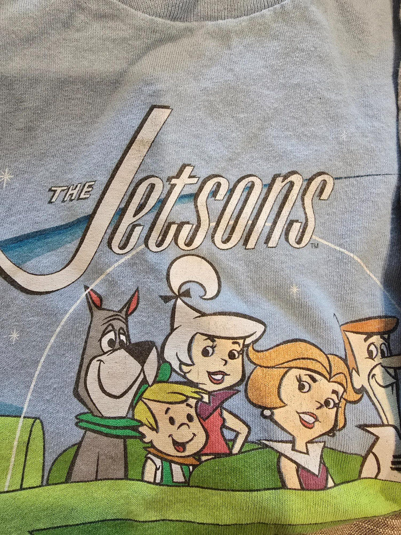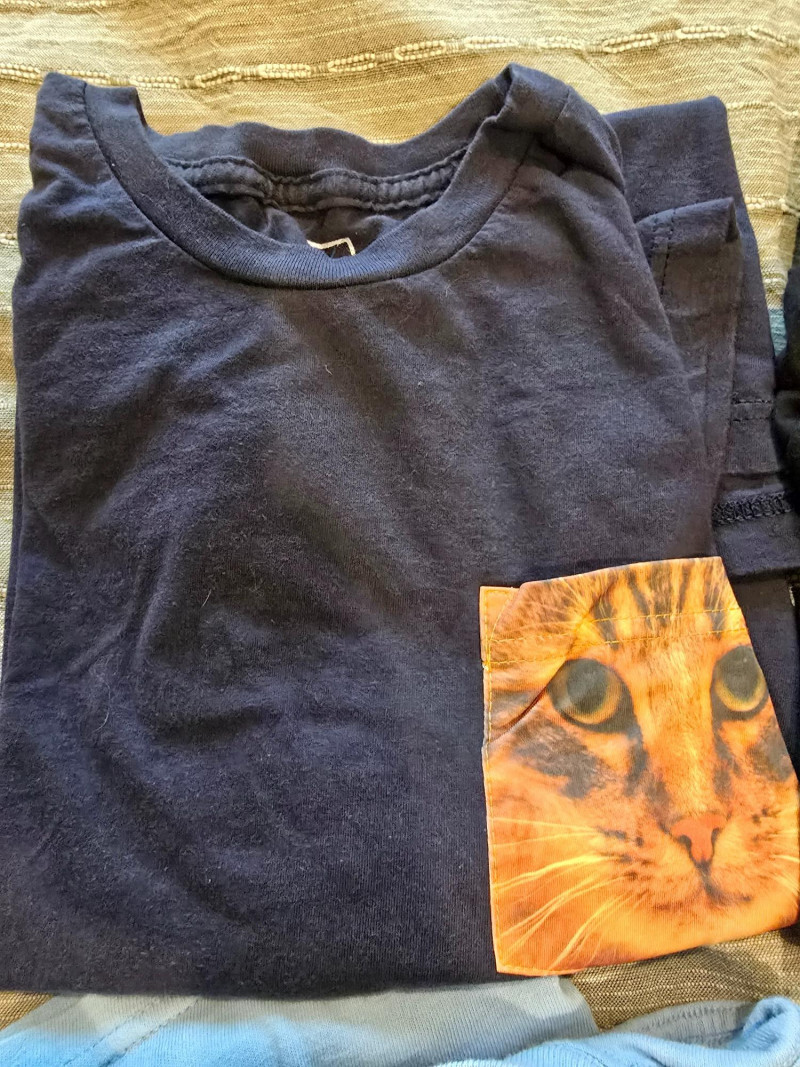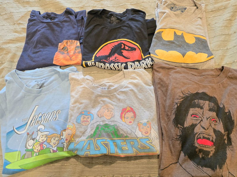 Includes: Batman graphic tee Jurassic Park logo shirt Jetsons cartoon print Wolfman horror tee He-Man retro design One mysterious cat shirt with a pocket (possibly plotting something) Description:
