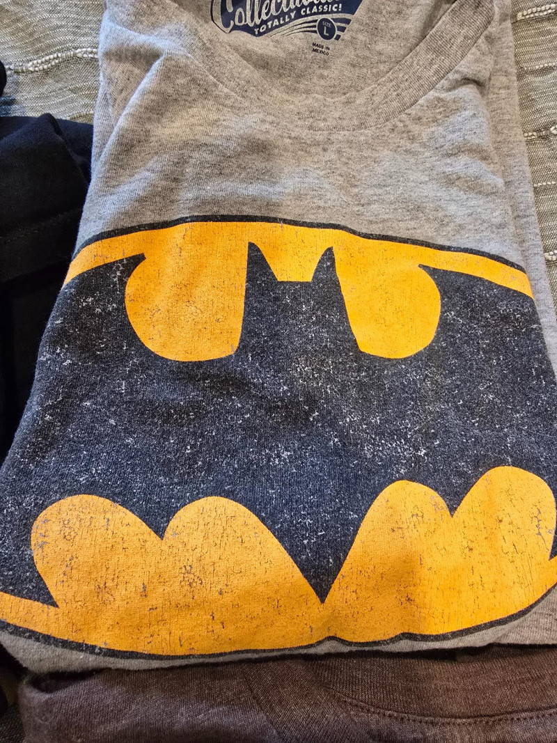 A wearable time capsule of pop culture nostalgia. This lot features six men’s large shirts spanning comic book legends, sci-fi classics, Saturday morning cartoons, and one cryptic feline. Whether you're channeling Gotham grit, prehistoric thrills, or ‘80s Saturday morning power, this bundle delivers iconic flair with a wink. Perfect for collectors, casual cosplayers, or anyone who wants their laundry pile to look like Comic-Con.