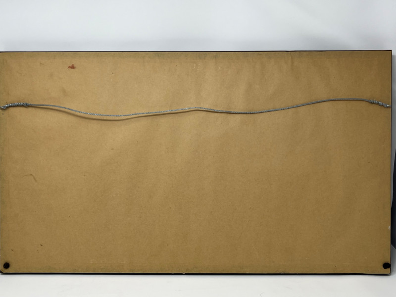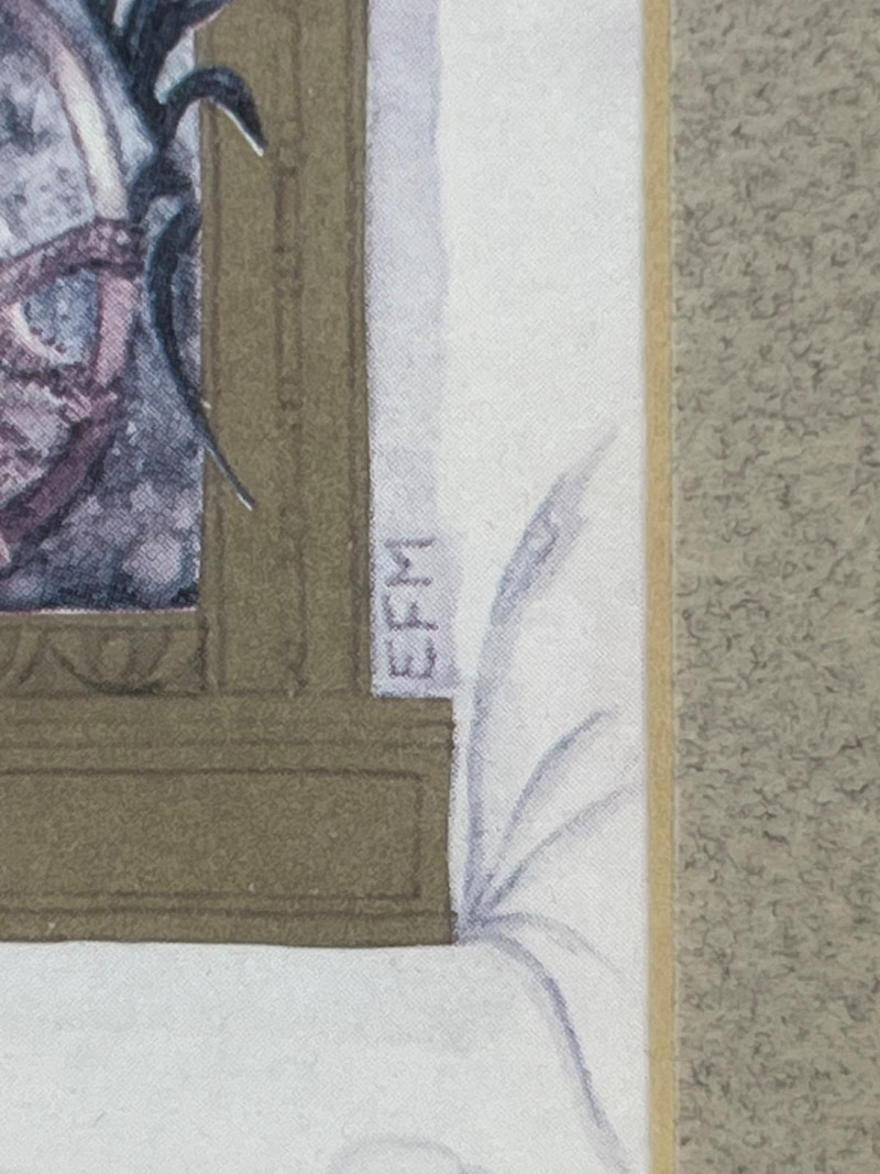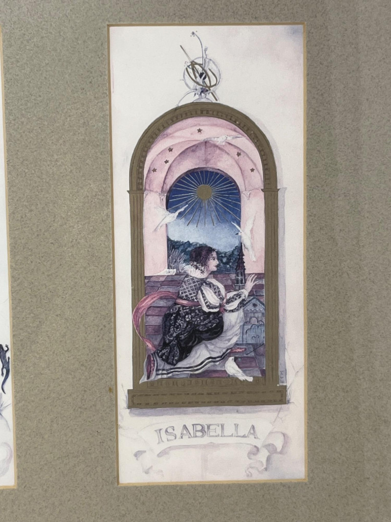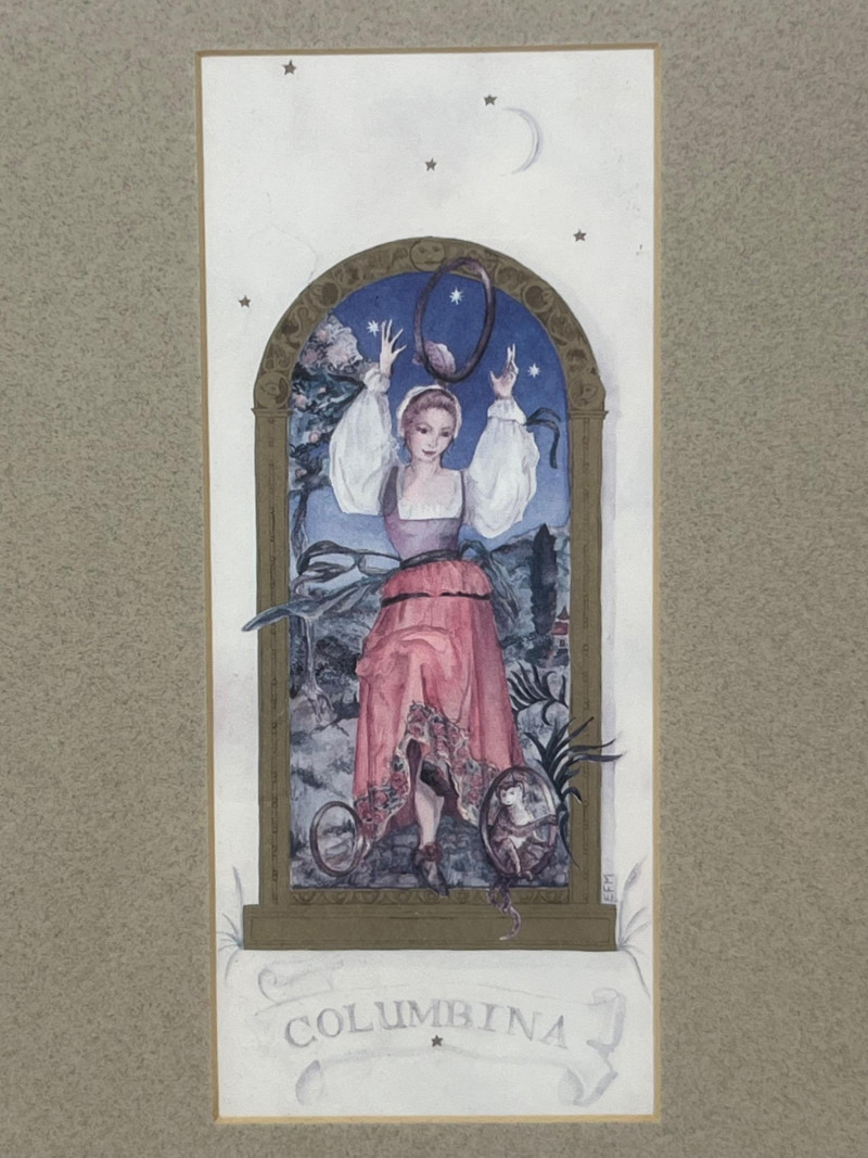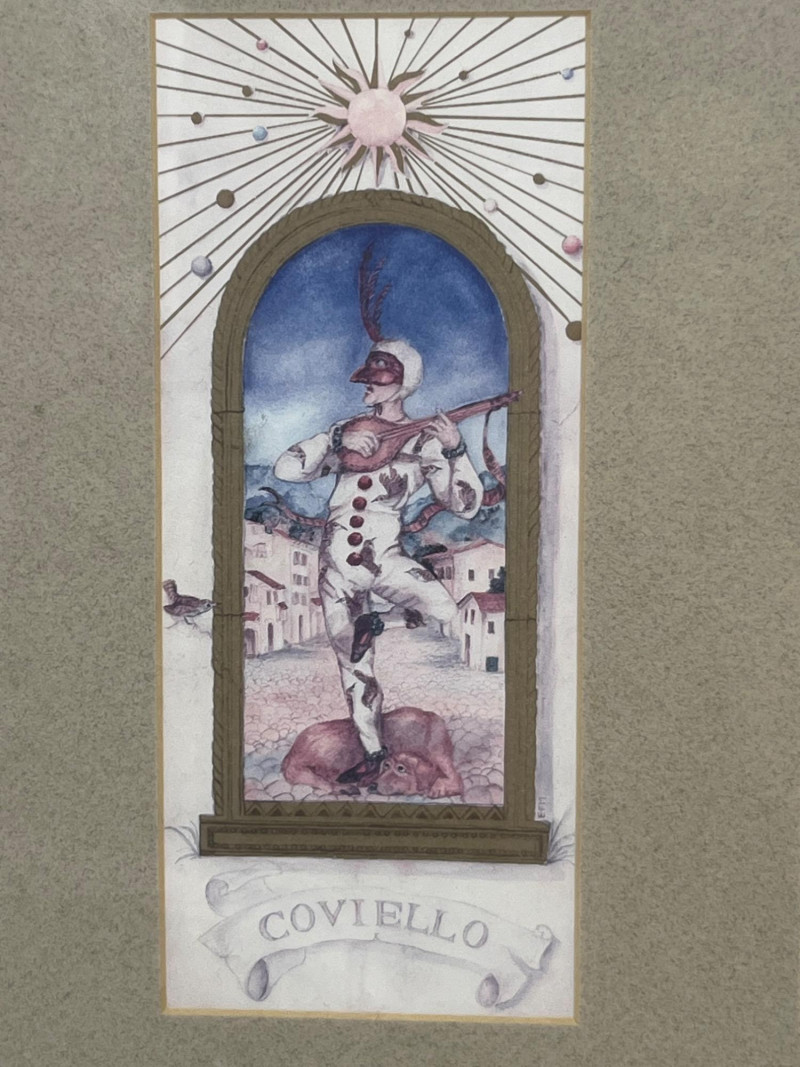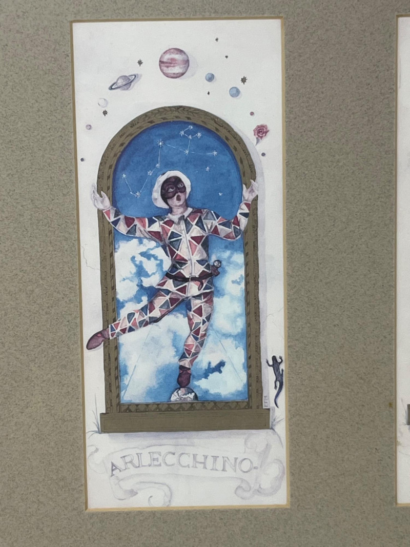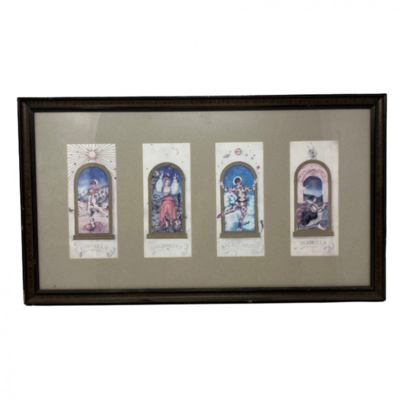 Framed print of a handful of actors from the early Italian theatre company Commedia dell'Arte. Initials "EFM" are visible on the sides of each piece, but no longform name or date. -Coviello: A servant character (zanni), often seen as cunning or mischievous. - Columbina: A witty and intelligent servant, often associated with fellow actor Arlecchino and known for being independent. - Arlecchino: A popular harlequin character, known for his romantic pursuits and a patchwork costume as colorful as his comedic antics. - Isabella: Known as an innamorati, or lovers, she is a stock character representing the young, naive, and beautiful lead in plays.