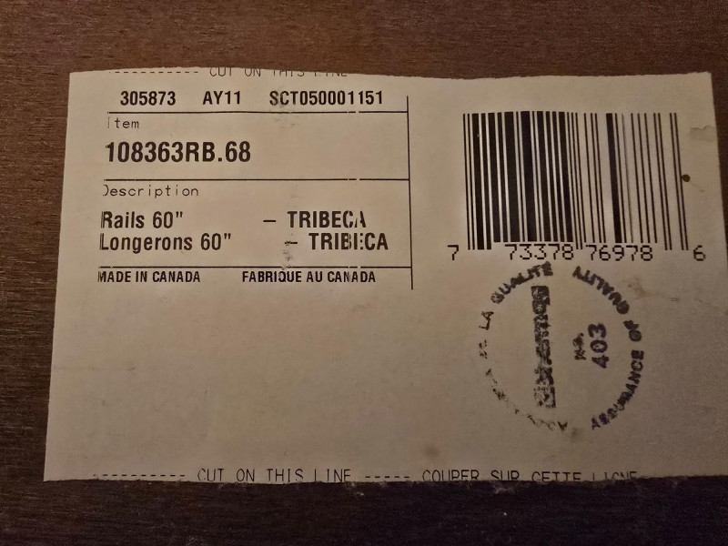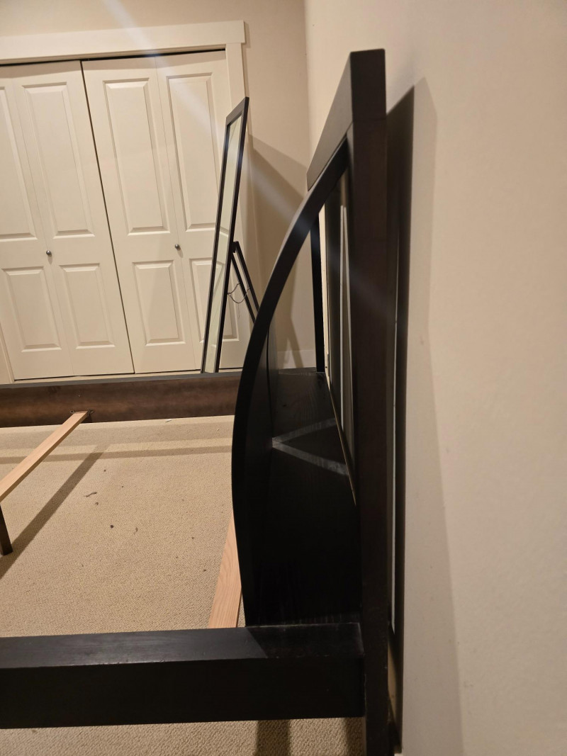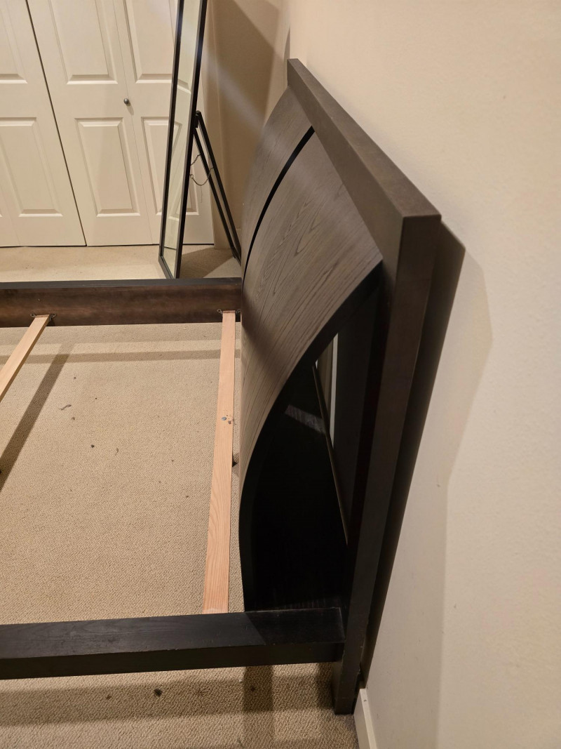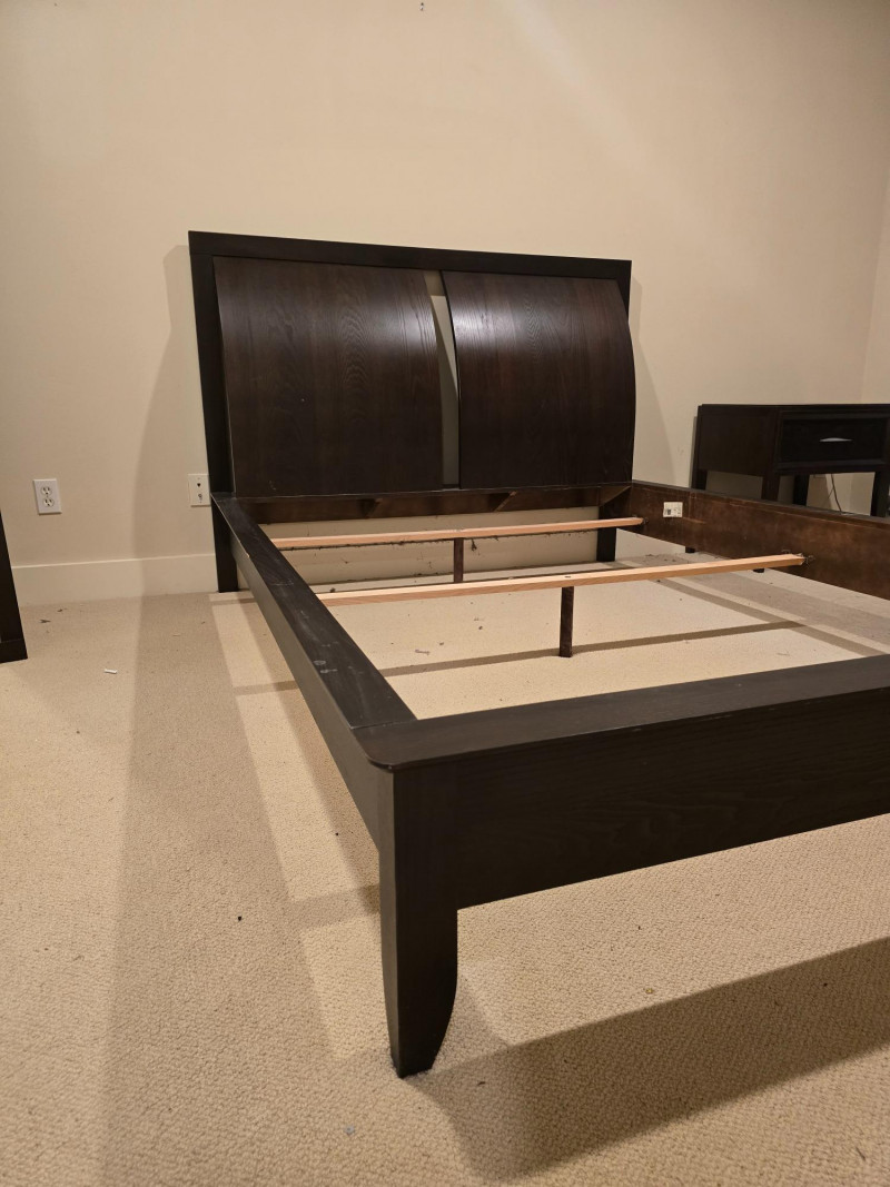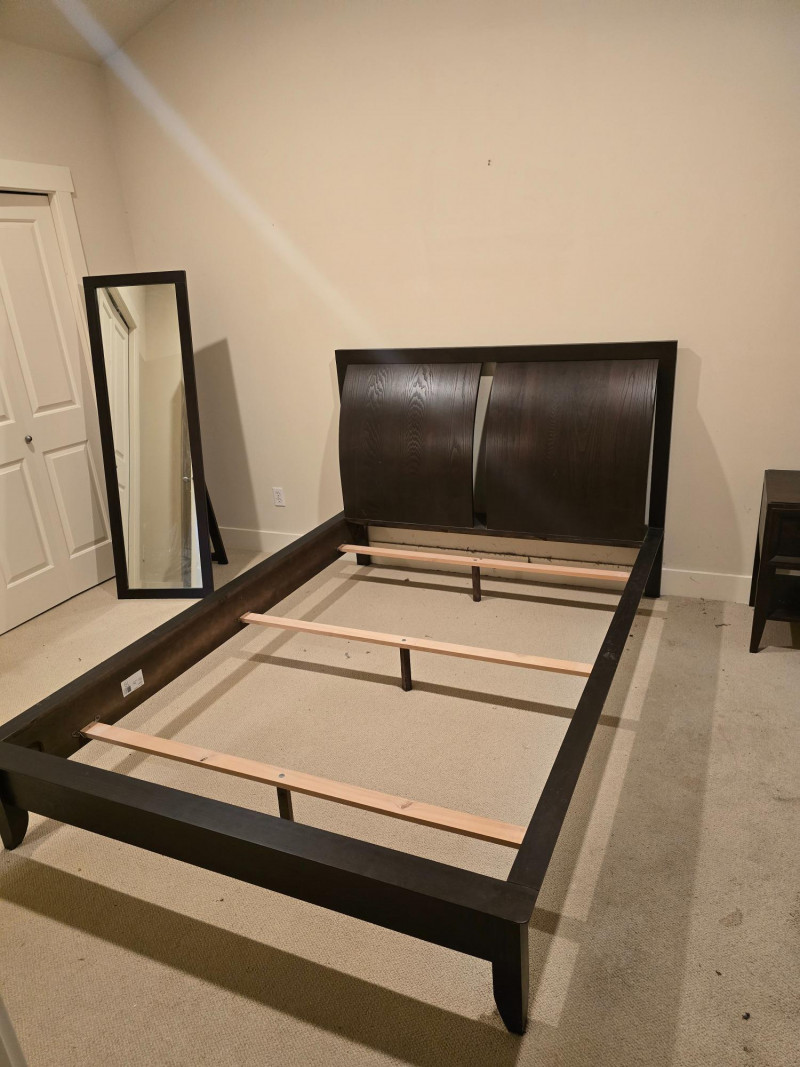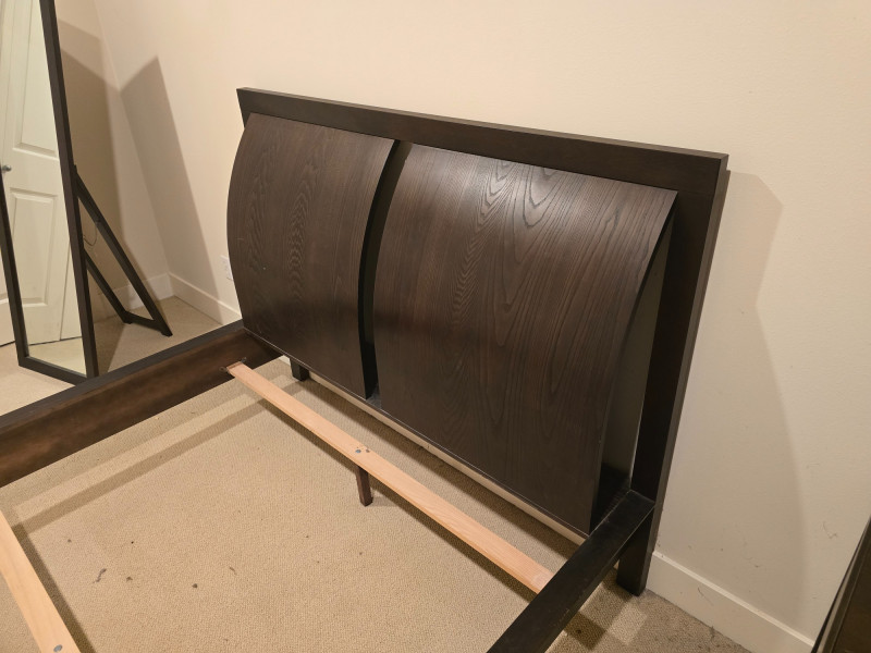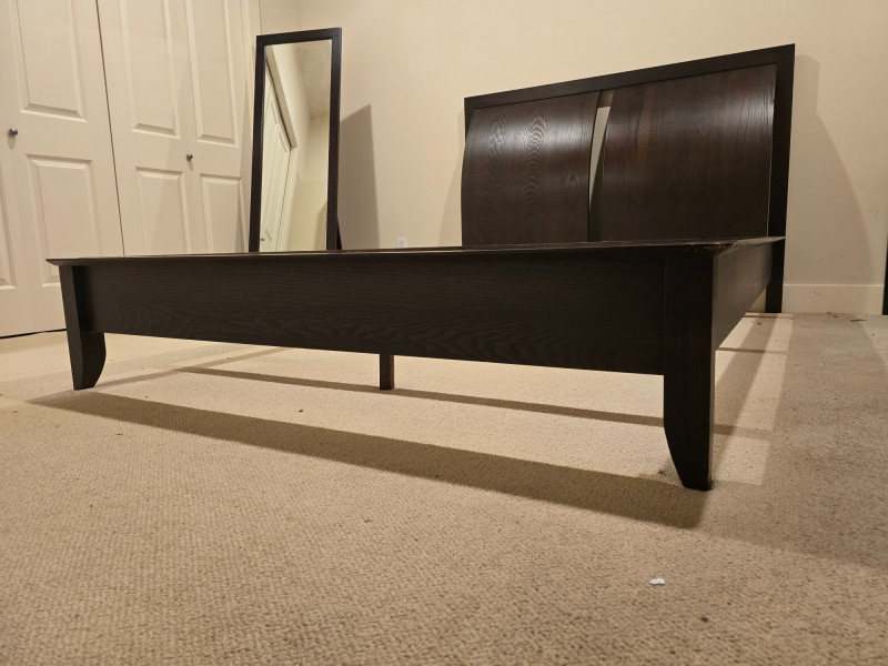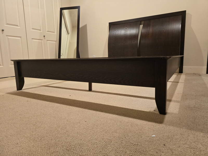 A gorgeous and sleek Queen bedframe. Made in Canada. There is also a matching nightstand in this auction. Nightstand and mirror are not included. Design Features: Rich dark brown finish with clean lines and minimal hardware. Functionality/Condition: Appears structurally sound with light wear consistent with use. Wear on corners and edges of frame. The headboard itself is in very good condition.