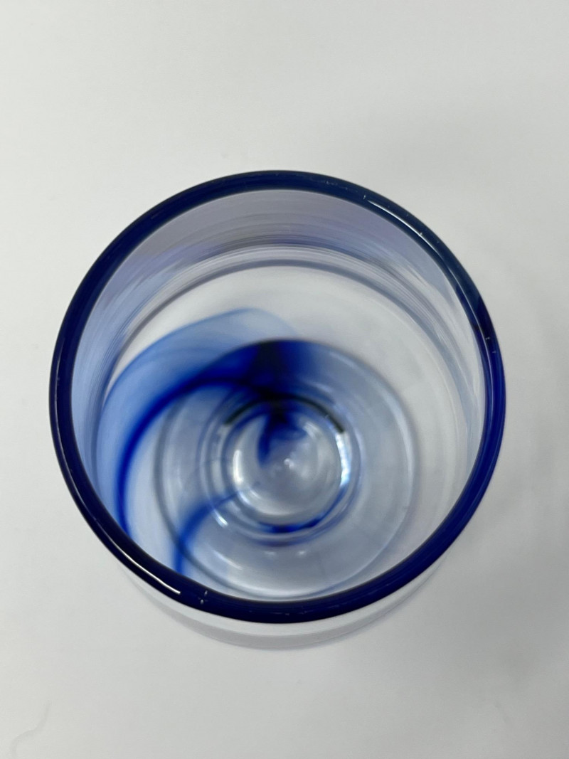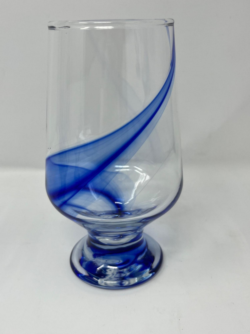 Set of 6 Libbey Blue Ribbon Glasses. Each glass boasts a uniquely handmade blue "ribbon" from the base to the rim. The royal blue bears a mysterious and striking contrast as it swirls around in a free-flowing motion. Clean and beautiful design with an artisian twist, it will ensuring your drinks are refreshing to all the senses!