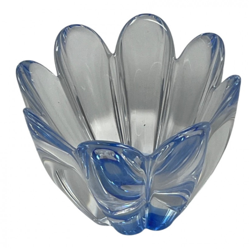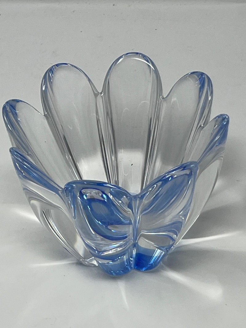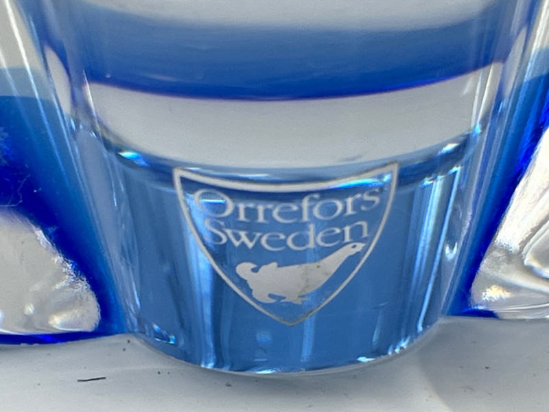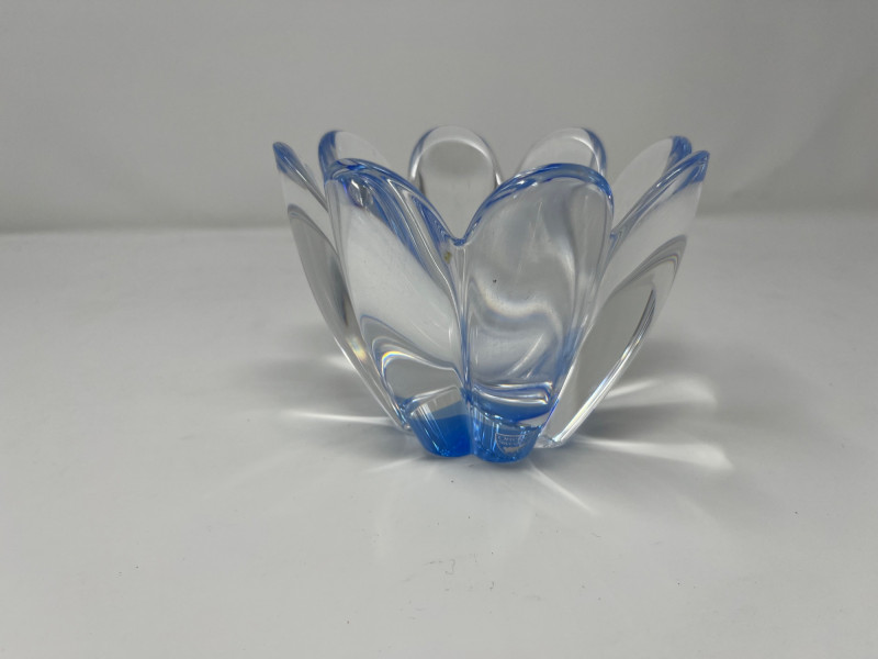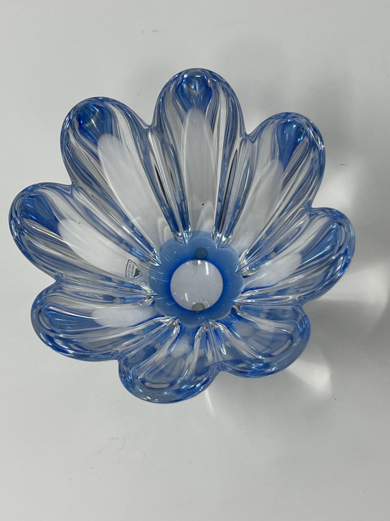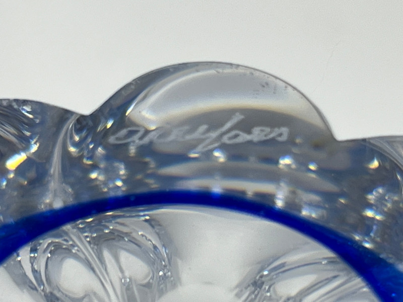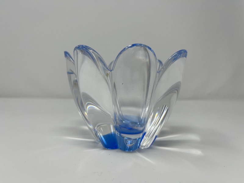 Beautiful blue Mayflower bowl by Orrefors in Sweden. Orrefors is a renowned Swedish glassworks company, known for its quality crystal and art glass pieces. In addition to the identifying sticker, the Orrefors name is carved into the underside of the bowl. The Mayflower bowl series was created by silversmith and glass sculptor Jan Johansson in the 1970s in a variety of colors. This stunning blue captures the eye of romantic, vintage, and feminine decor. This series embodied Johansson's signature style of clean shapes of cut crystal, blending tradition and contemporary aesthetics.