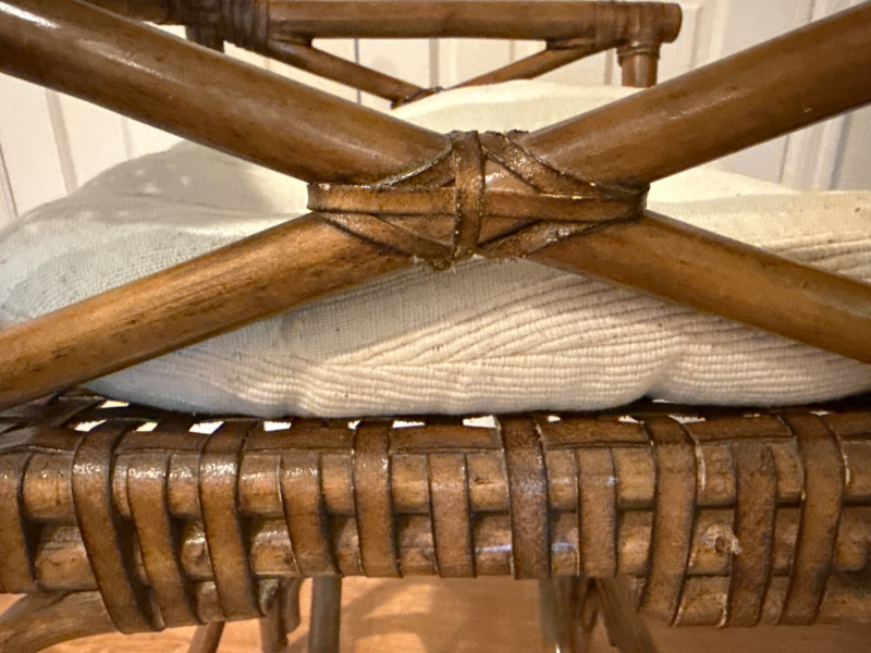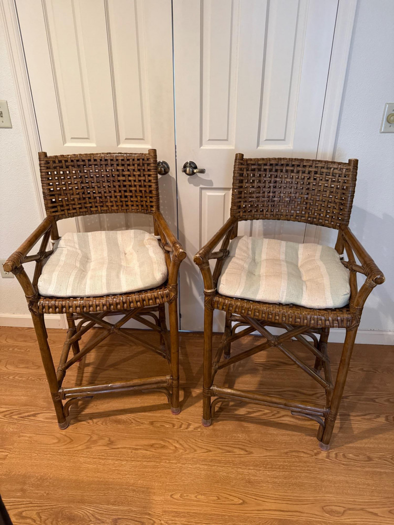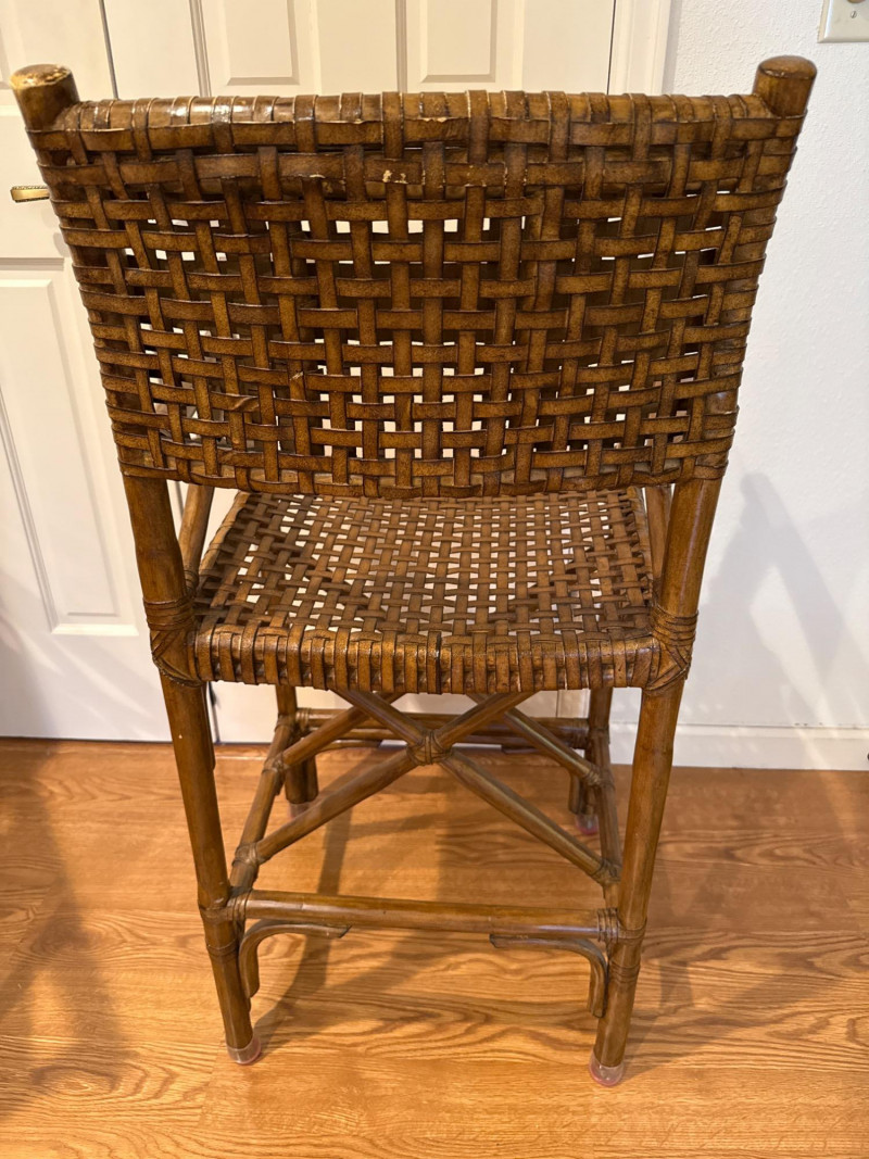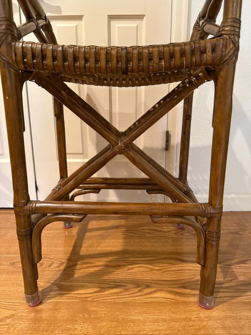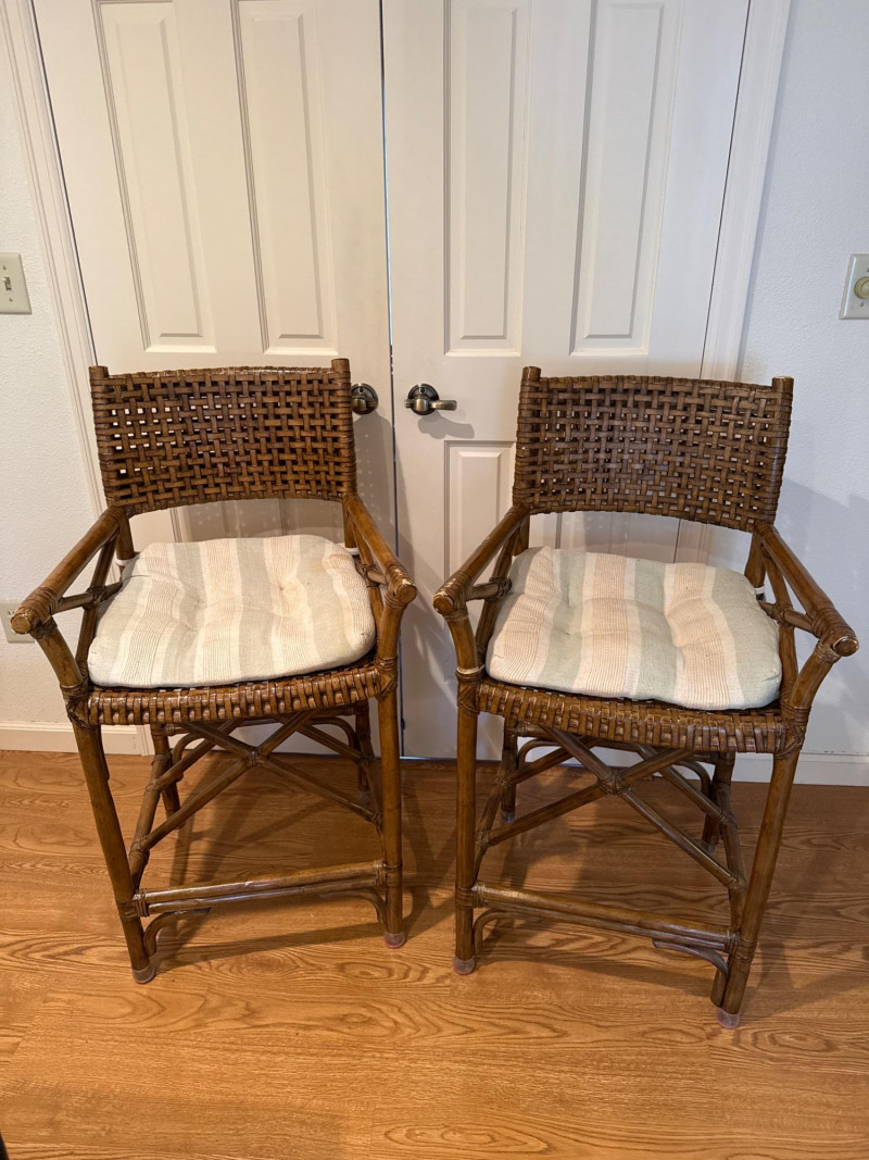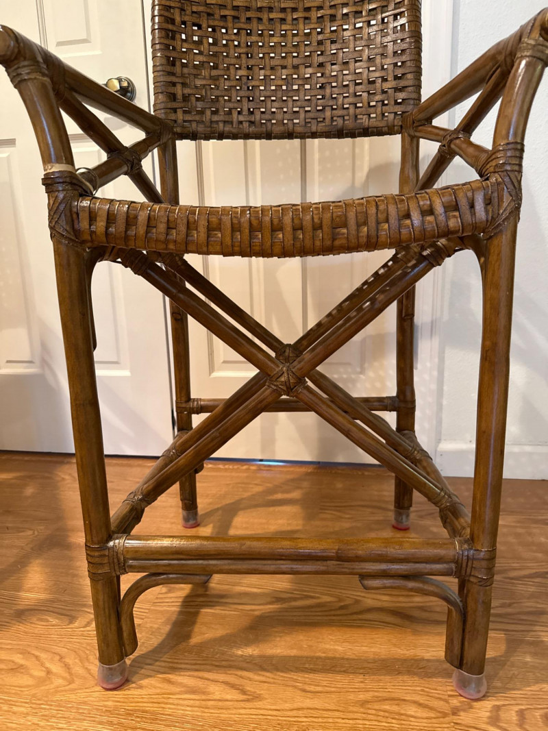 A pair of vintage bar stools crafted from natural rattan, featuring woven wicker seats and backs. The frames are reinforced with rawhide bindings at the joints, adding strength and traditional character. Each stool includes: Armrests for relaxed seating X-form side and back supports for added stability Footrests for comfort Fabric seat cushions Dimensions: Length: 22.5 in Width: 18 in Height: 41 in A timeless addition to any space with coastal, tropical, or bohemian flair.Pair of Vintage Rattan & Rawhide Woven Bar Stools