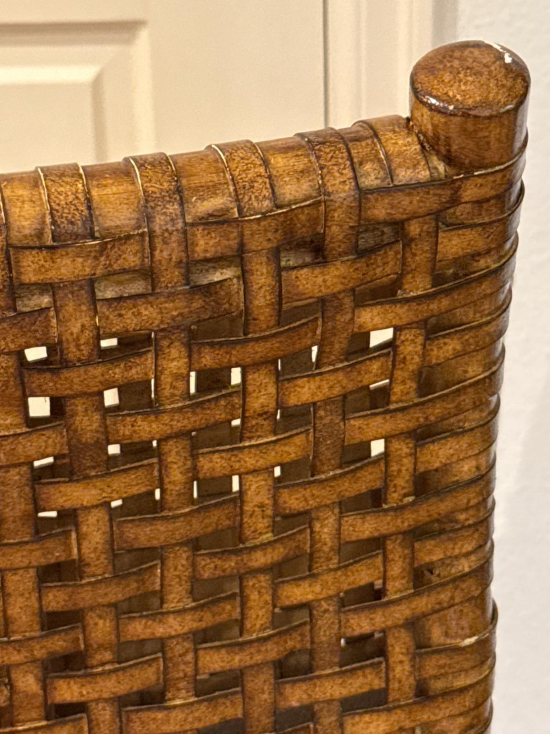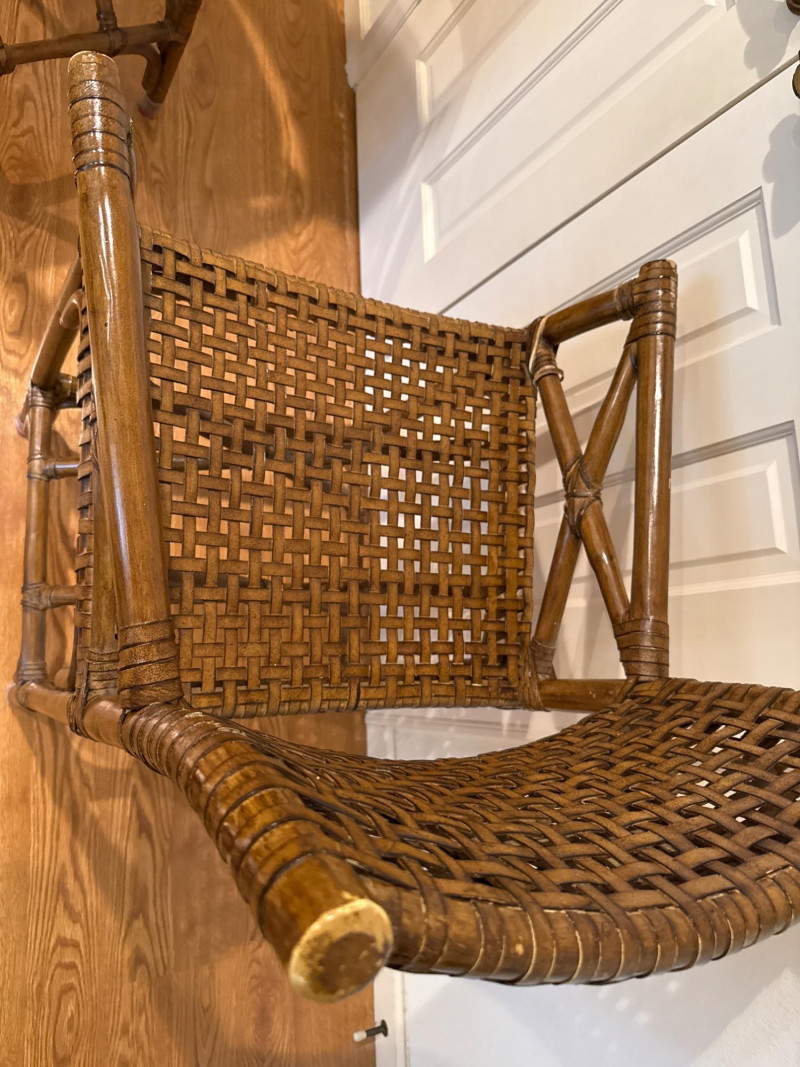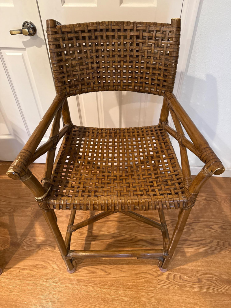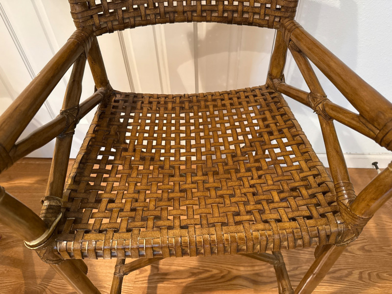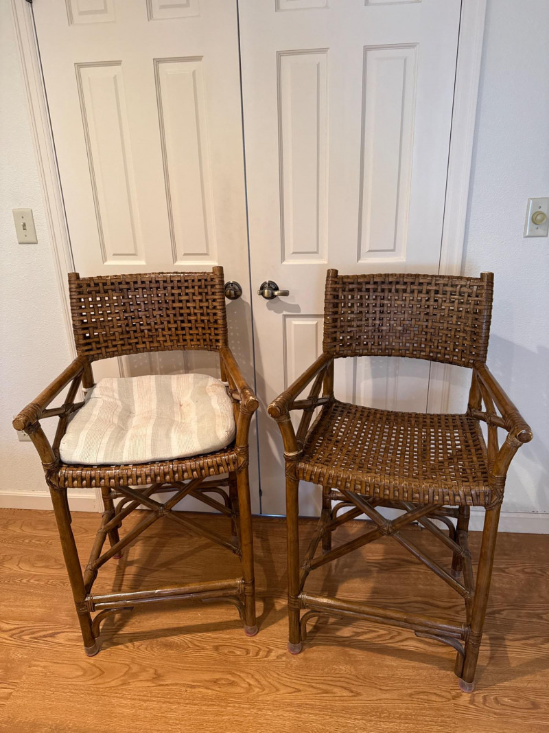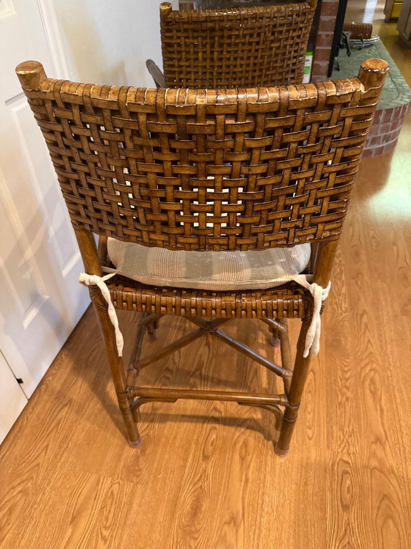 A pair of vintage bar stools crafted from natural rattan, featuring woven wicker seats and backs. The frames are reinforced with rawhide bindings at the joints, adding strength and traditional character. Each stool includes: Armrests for relaxed seating X-form side and back supports for added stability Footrests for comfort Fabric seat cushions Dimensions: Length: 22.5 in Width: 18 in Height: 41 in A timeless addition to any space with coastal, tropical, or bohemian flair.Pair of Vintage Rattan & Rawhide Woven Bar Stools