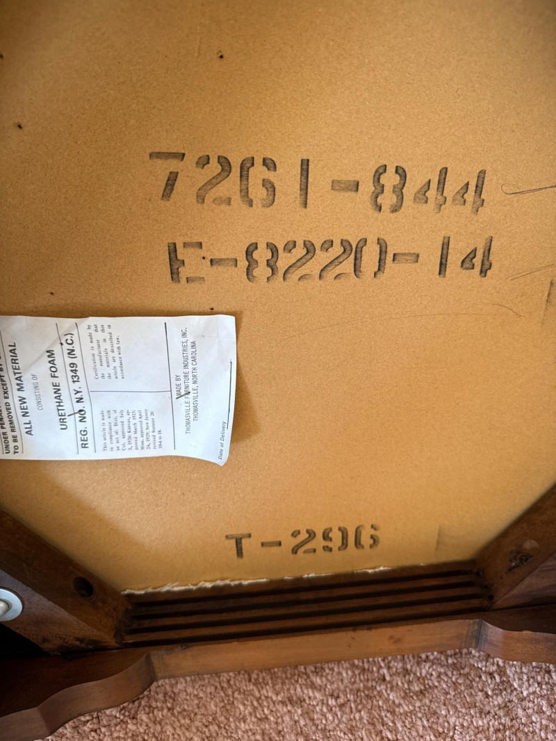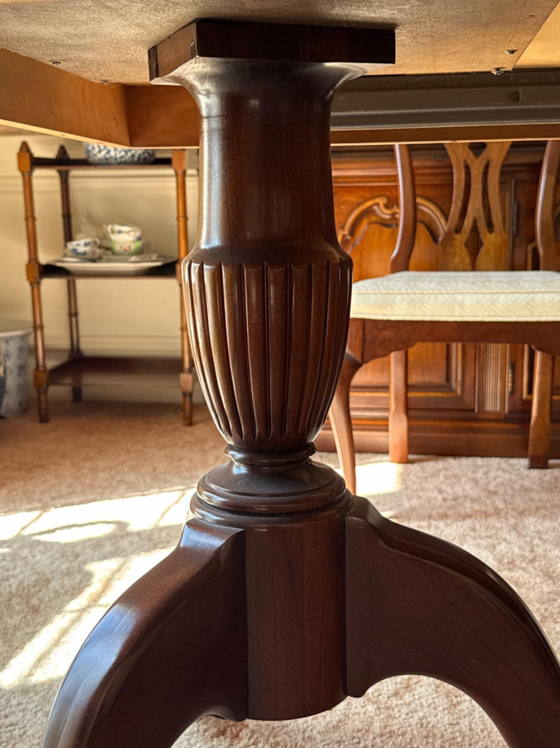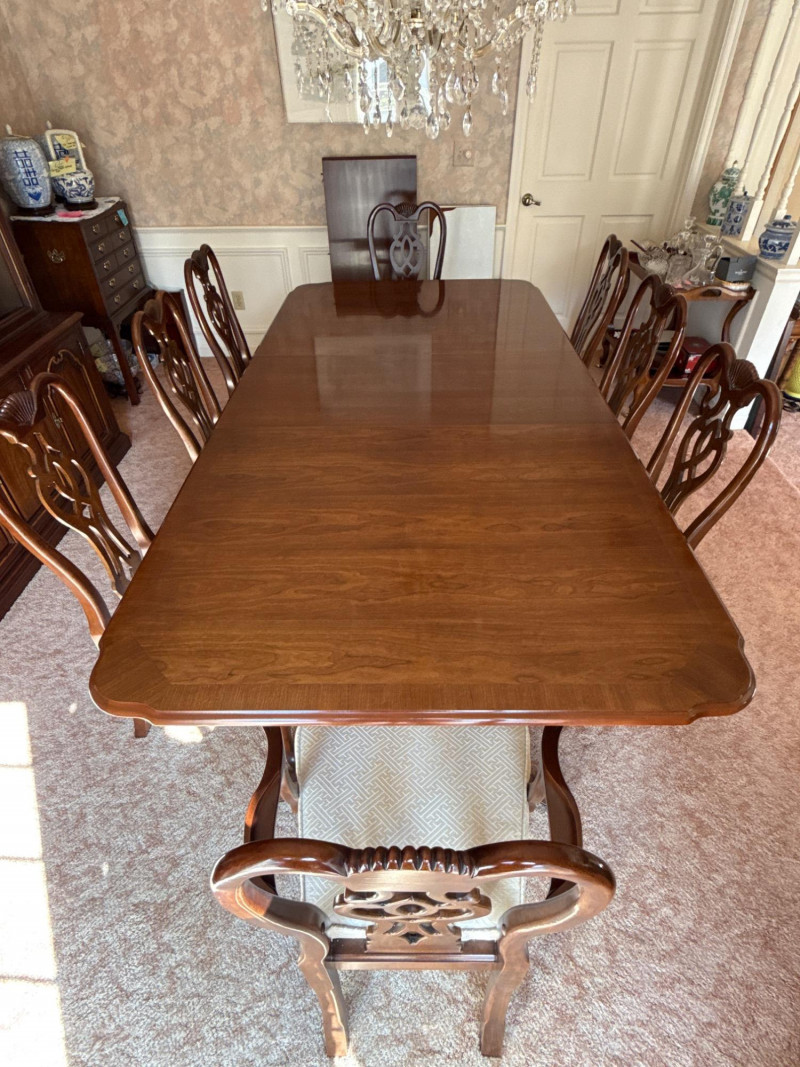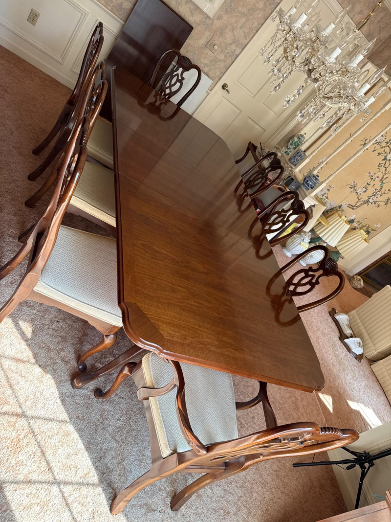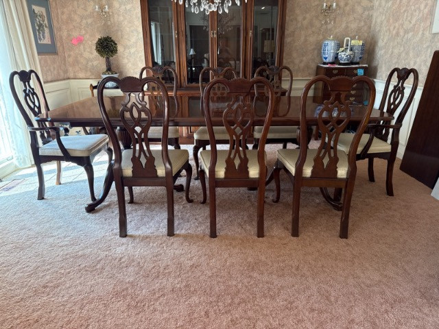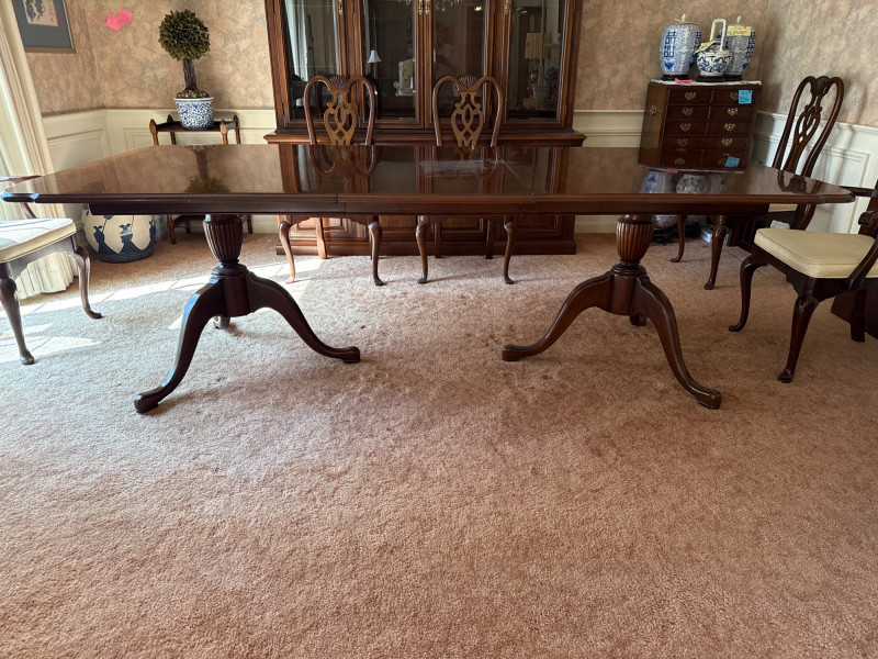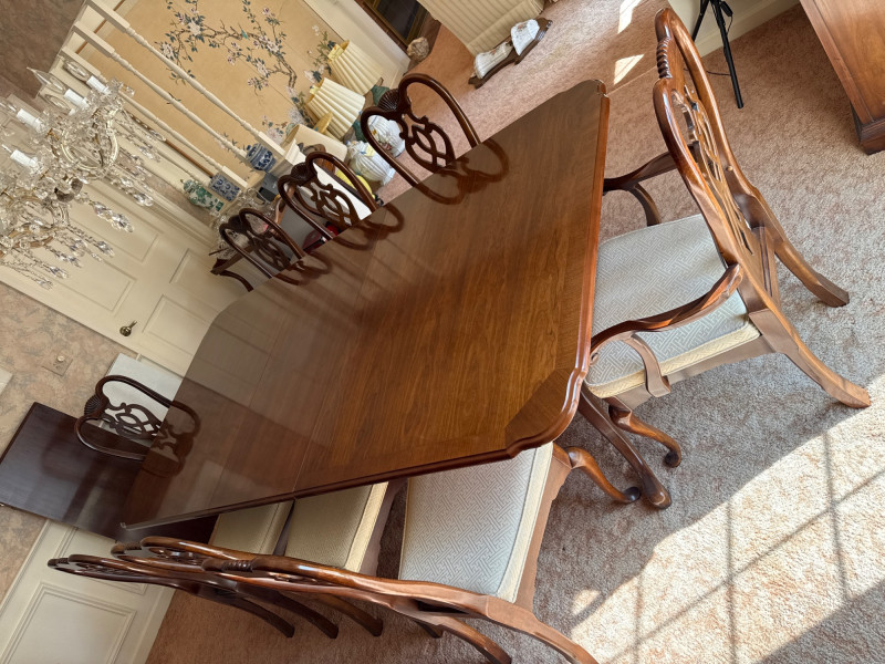 Thomasville Chippendale Double Pedestal Dining Table with 8 Chairs This Thomasville Chippendale Revival dining set is a beautiful blend of craftsmanship and timeless elegance. Here's a breakdown of its key features and value points: Chippendale Revival: Inspired by 18th-century English design, known for its ornate details and refined silhouette. Pierced Splat Backs: A hallmark of Chippendale chairs, adding visual interest and historical charm. Cream Upholstered Seats: Neutral and classic, offering comfort and versatility in décor. Table Size: measures 111" long by 44" wide with two leaves—perfect for both intimate dinners and large gatherings. Two leaves. Double Pedestal Base: Offers stability and legroom, while enhancing the formal aesthetic. Protective Pads: Custom-fitted pads included to preserve the tabletop, especially when fully extended. 8 Chairs Total: 6 Side Chairs 2 Armchairs Thomasville Furniture, North Carolina 7261 Series: Known for quality construction and enduring style. About the Maker: Thomasville Furniture Industries, founded in 1904 in Thomasville, North Carolina, became one of America's most respected furniture manufacturers. Known for its craftsmanship, elegant designs, and use of quality hardwoods, Thomasville earned a reputation for producing timeless pieces that blended tradition with durability. **Must bring equipment and support to load. Design & Style