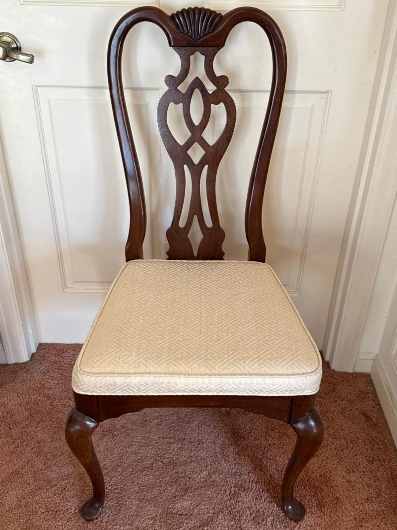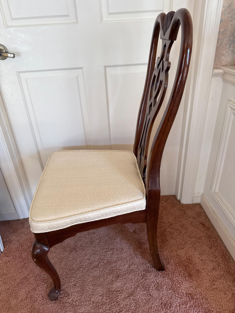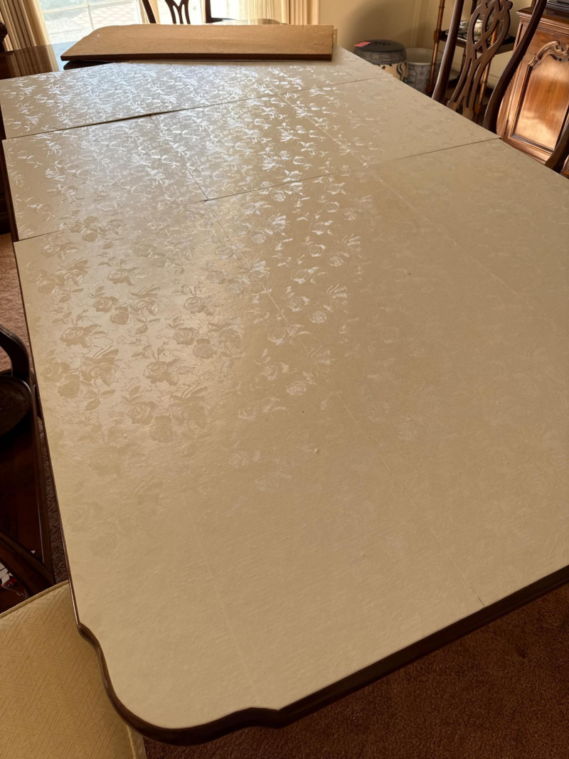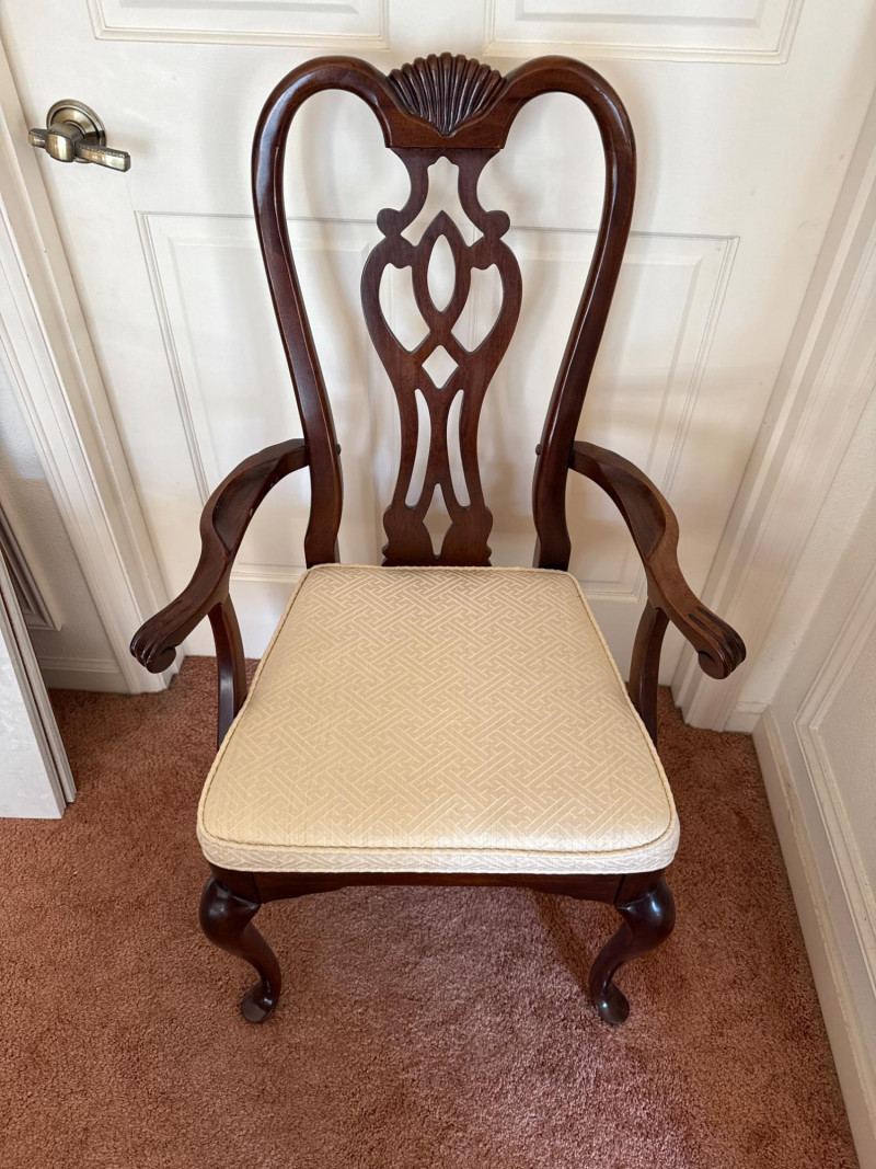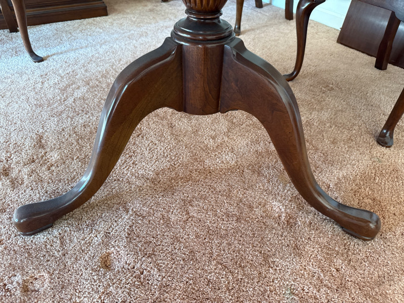 Thomasville Chippendale Double Pedestal Dining Table with 8 Chairs This Thomasville Chippendale Revival dining set is a beautiful blend of craftsmanship and timeless elegance. Here's a breakdown of its key features and value points: Chippendale Revival: Inspired by 18th-century English design, known for its ornate details and refined silhouette. Pierced Splat Backs: A hallmark of Chippendale chairs, adding visual interest and historical charm. Cream Upholstered Seats: Neutral and classic, offering comfort and versatility in décor. Table Size: measures 111" long by 44" wide with two leaves—perfect for both intimate dinners and large gatherings. Two leaves. Double Pedestal Base: Offers stability and legroom, while enhancing the formal aesthetic. Protective Pads: Custom-fitted pads included to preserve the tabletop, especially when fully extended. 8 Chairs Total: 6 Side Chairs 2 Armchairs Thomasville Furniture, North Carolina 7261 Series: Known for quality construction and enduring style. About the Maker: Thomasville Furniture Industries, founded in 1904 in Thomasville, North Carolina, became one of America's most respected furniture manufacturers. Known for its craftsmanship, elegant designs, and use of quality hardwoods, Thomasville earned a reputation for producing timeless pieces that blended tradition with durability. **Must bring equipment and support to load. Design & Style