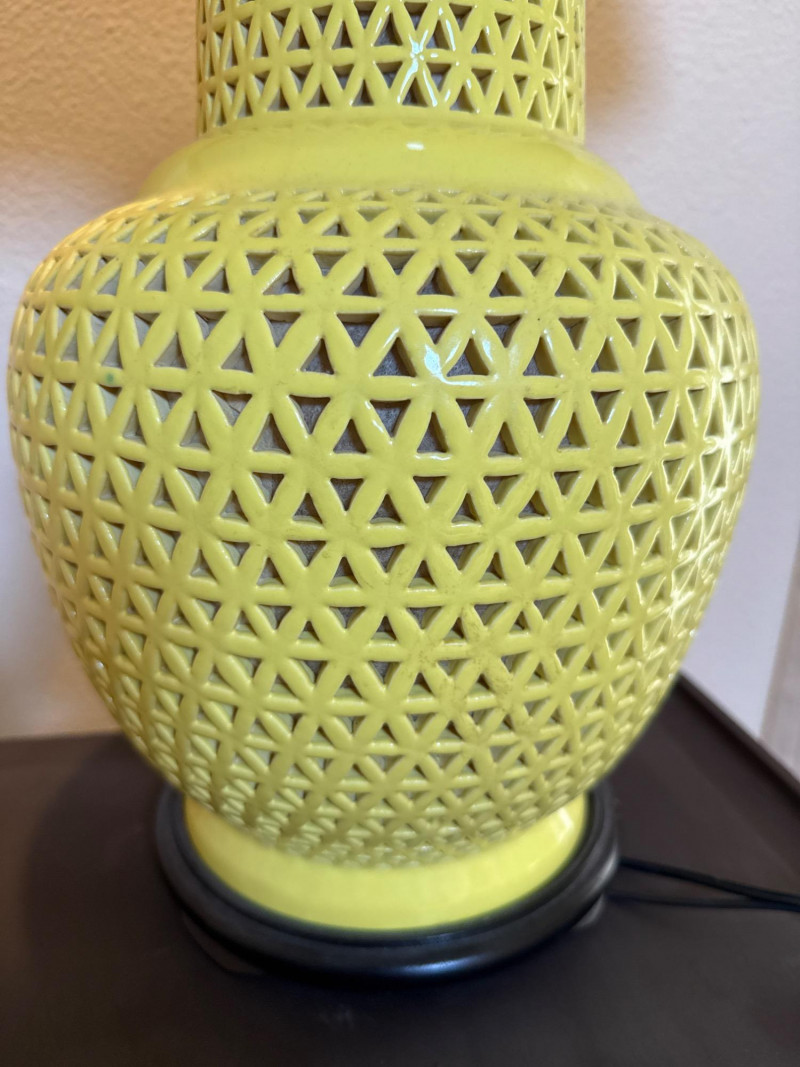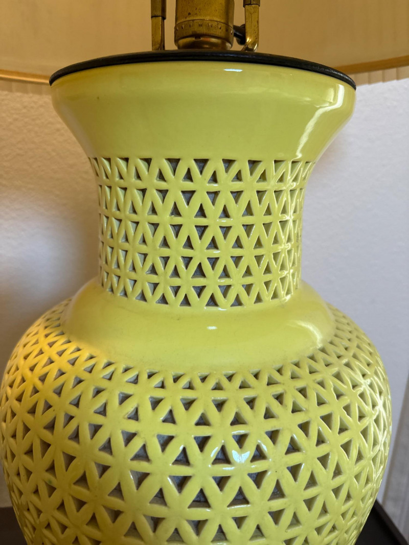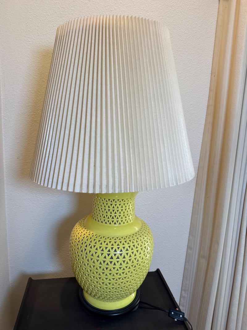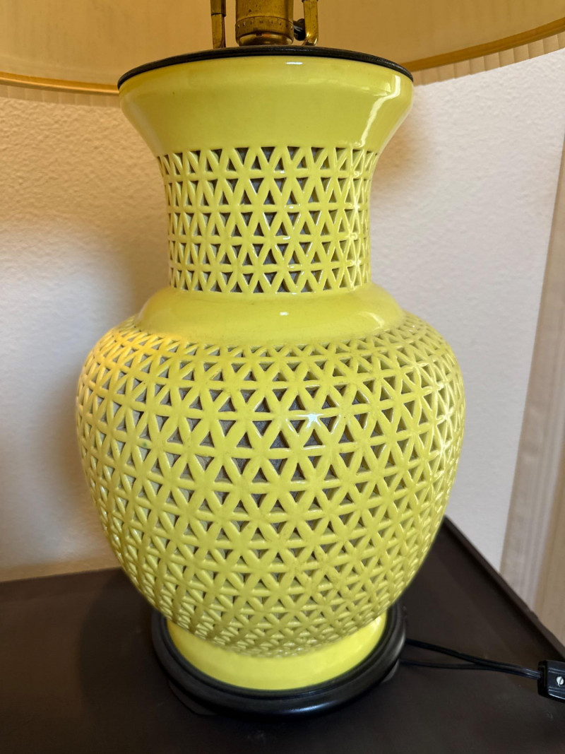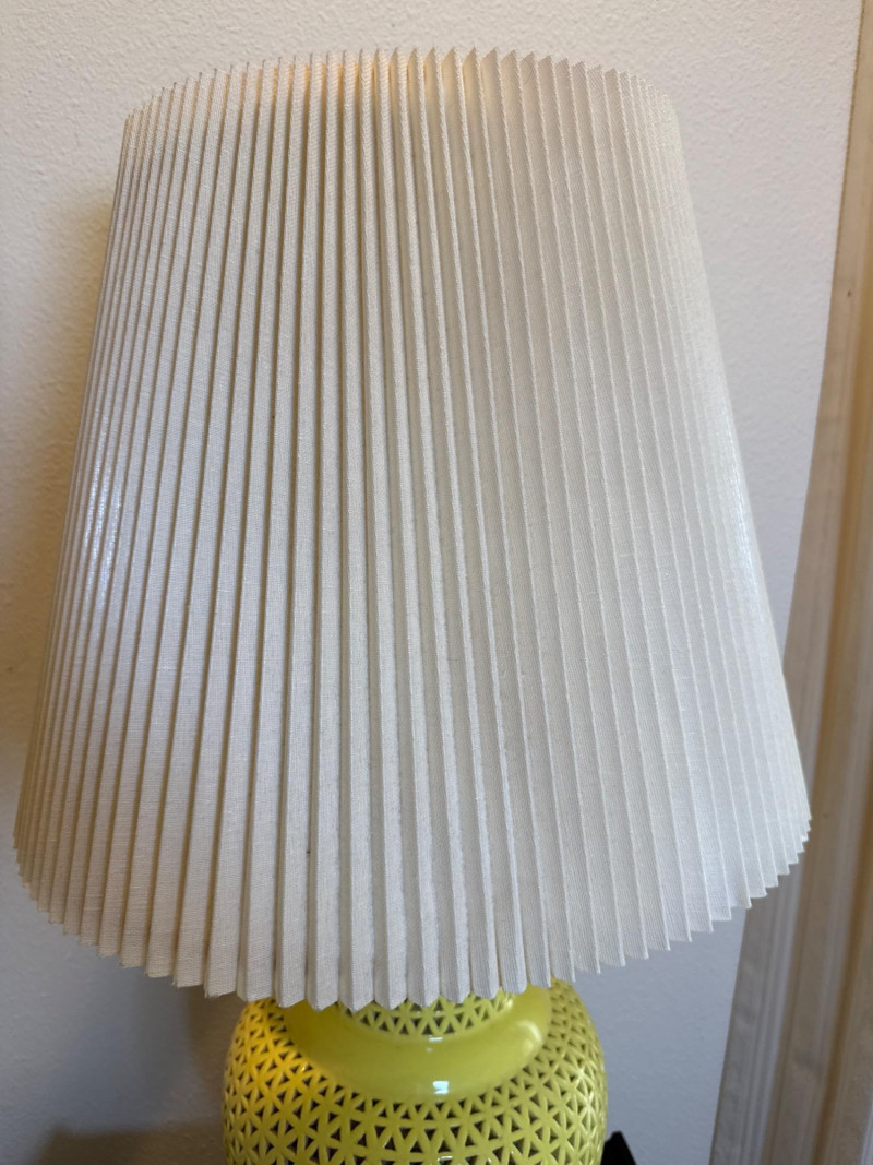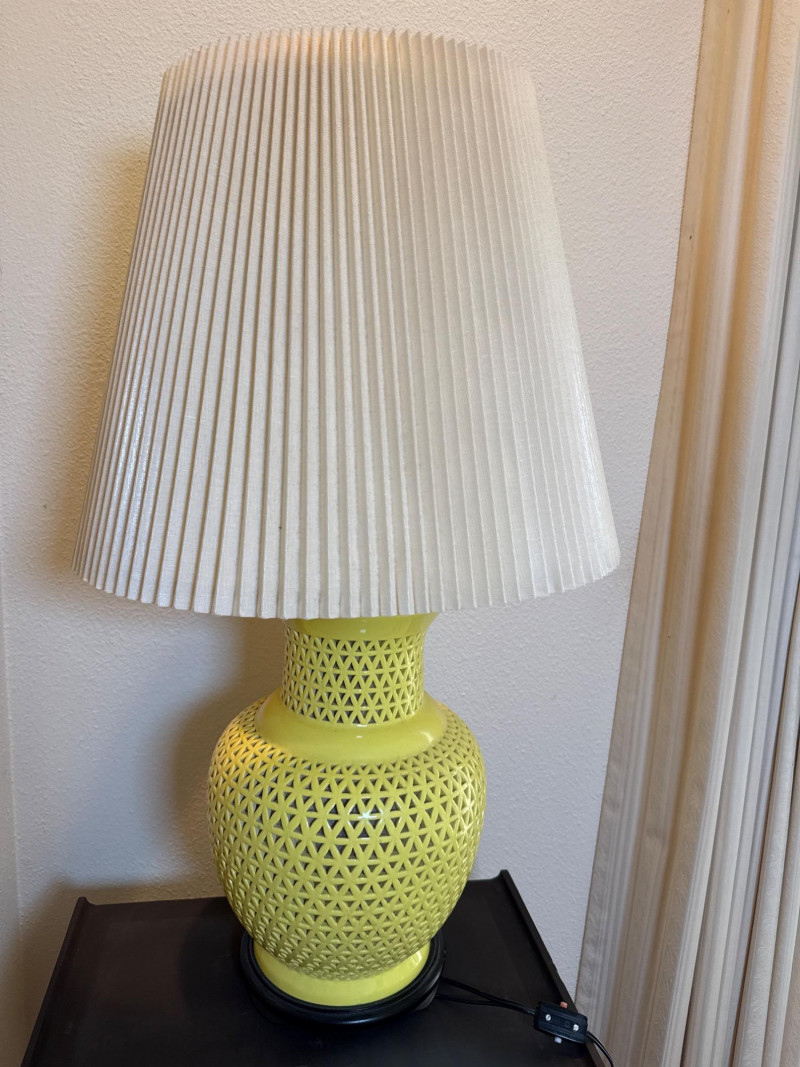 MCM Yellow Ceramic Chinoiserie Table Lamp with Pleated Shade A mid-century ceramic table lamp featuring a vibrant yellow glaze and an openwork lattice cutout body inspired by Chinoiserie design motifs. The lamp is mounted on a round black base and paired with an off-white pleated fabric shade, adding a touch of elegance and texture. Includes an inline switch on the cord for easy operation. Period: Mid-Century Modern (circa 1960s–1970s) Style: Chinoiserie influence Materials: Ceramic body, fabric shade, black base Color: Bright yellow base, off-white shade Condition: Lamp has been tested and is fully functional.