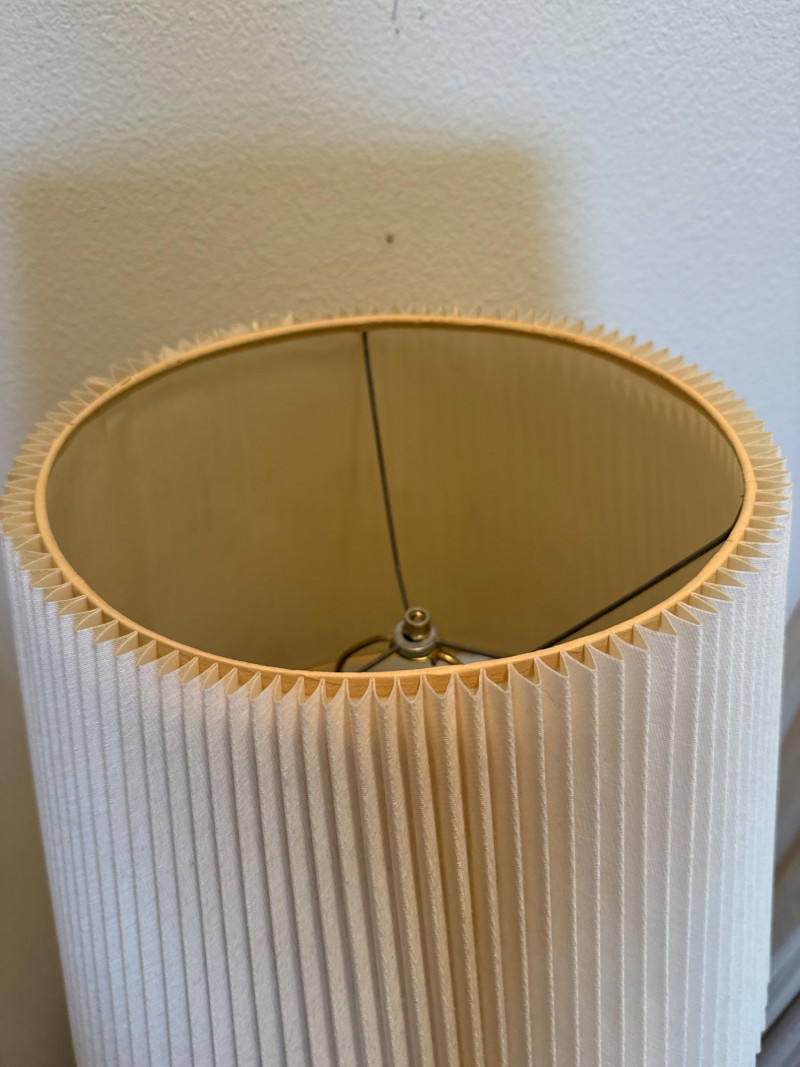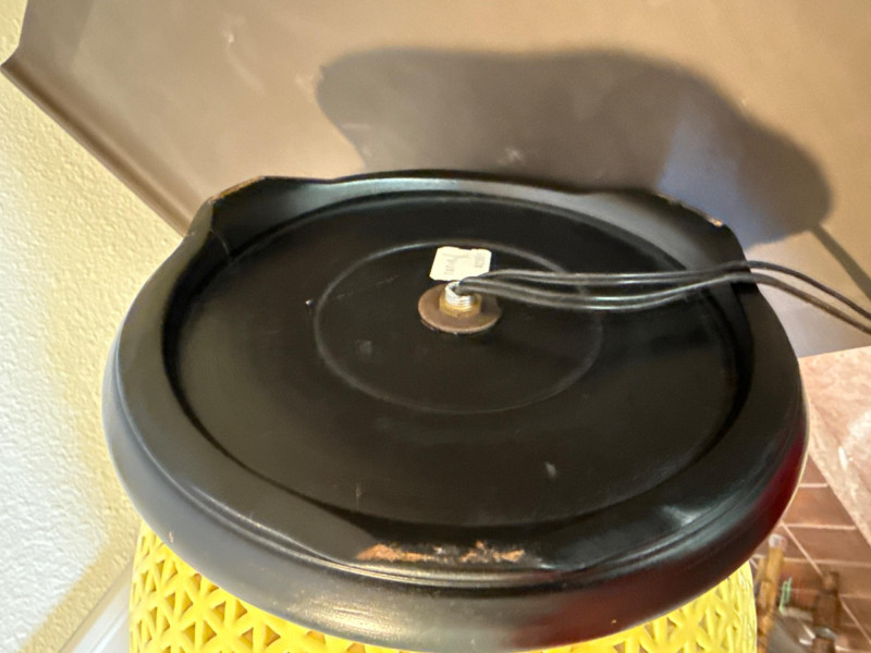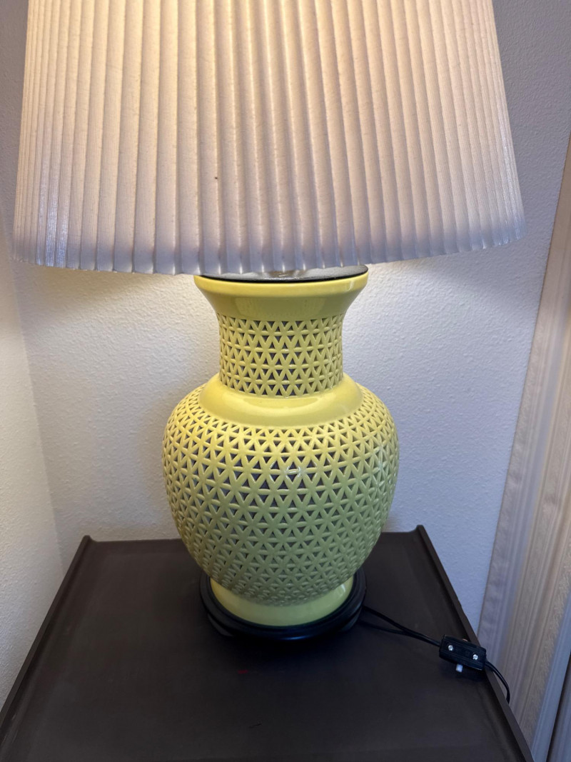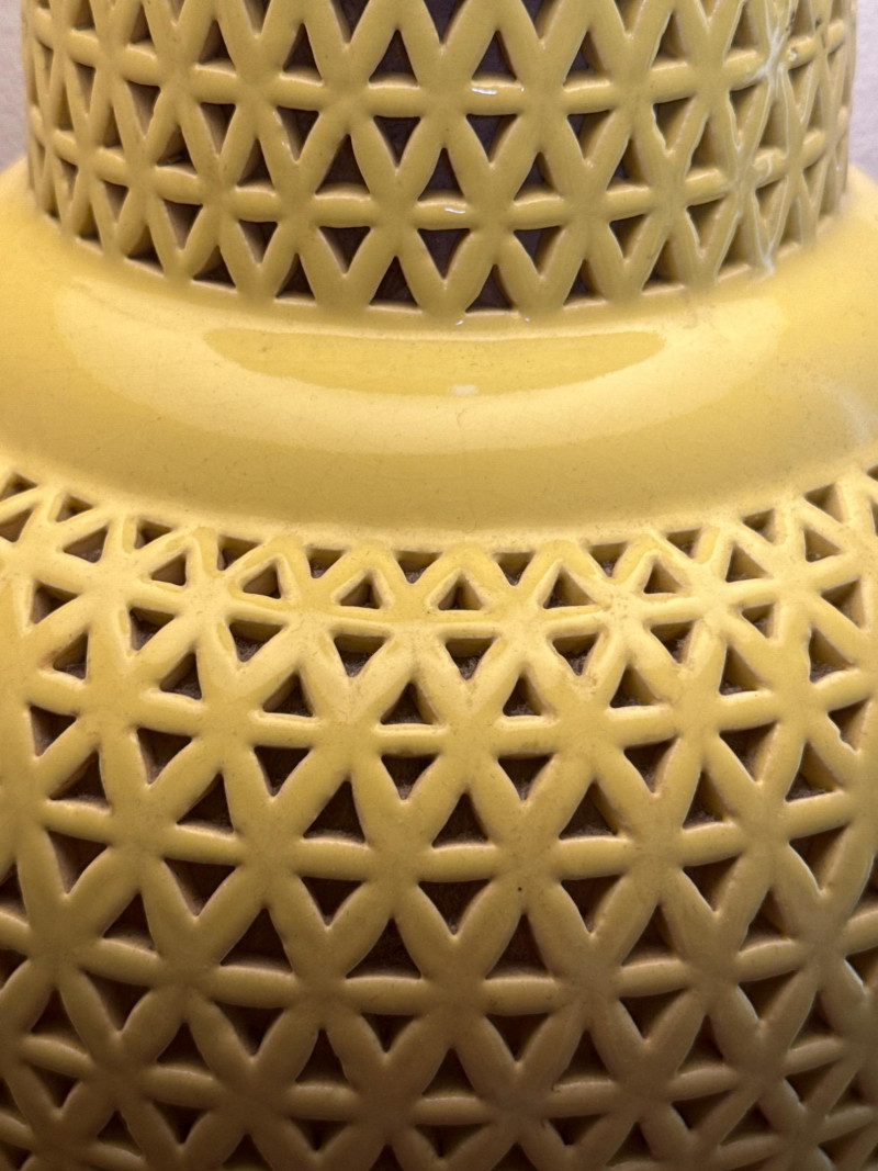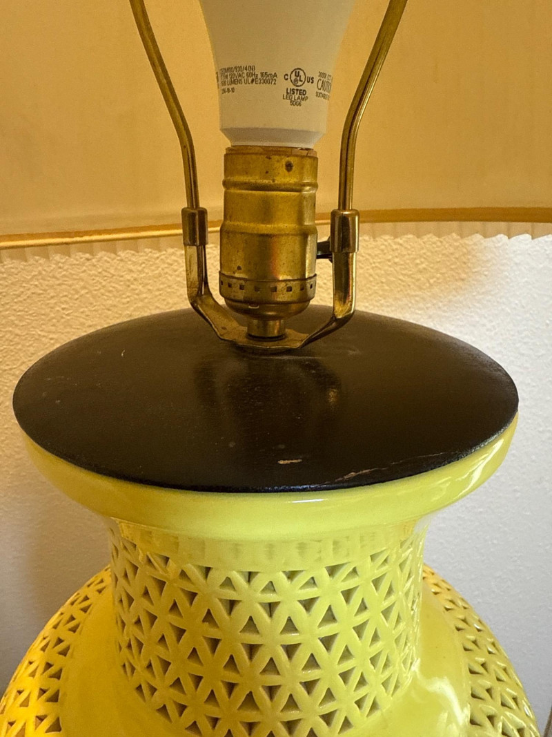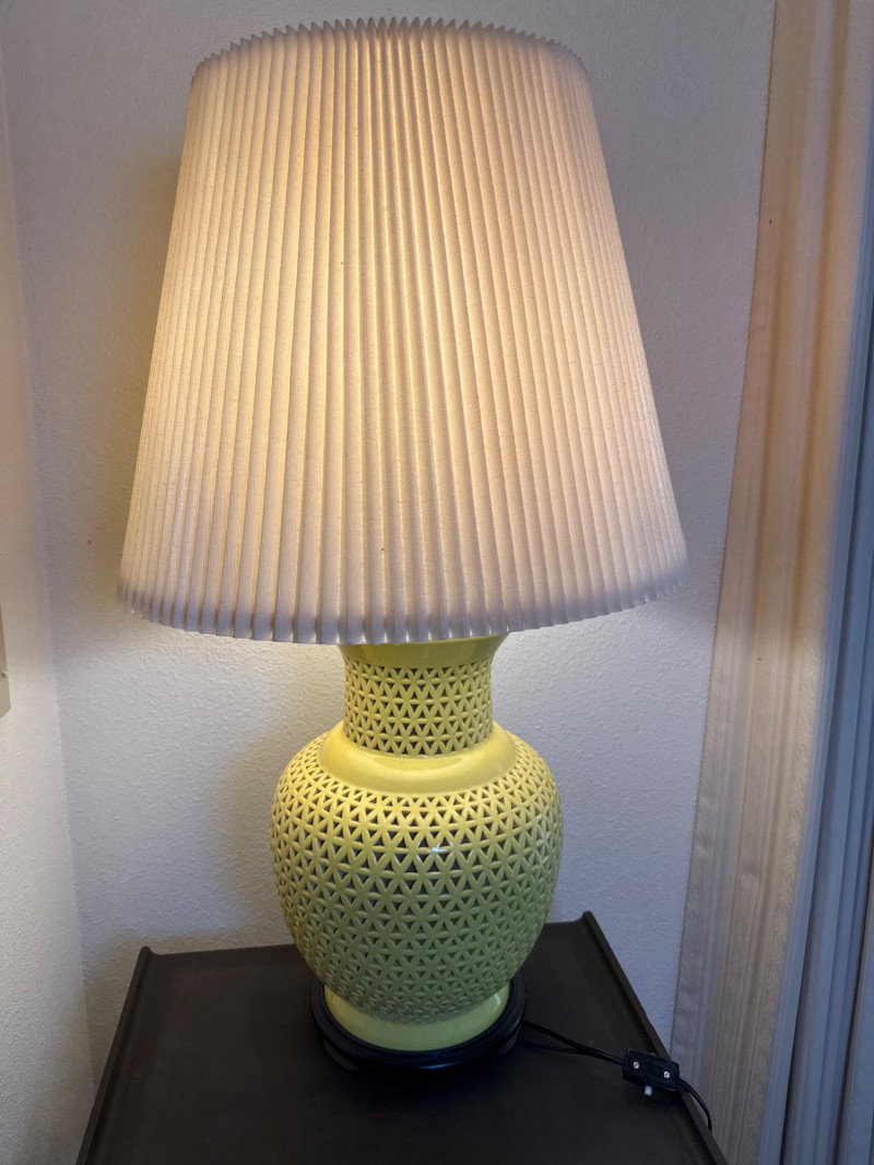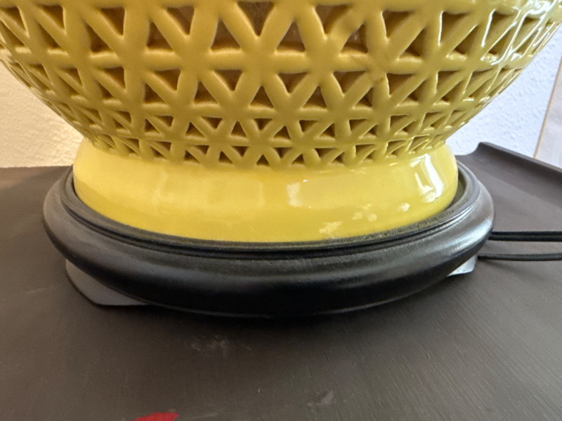 MCM Yellow Ceramic Chinoiserie Table Lamp with Pleated Shade A mid-century ceramic table lamp featuring a vibrant yellow glaze and an openwork lattice cutout body inspired by Chinoiserie design motifs. The lamp is mounted on a round black base and paired with an off-white pleated fabric shade, adding a touch of elegance and texture. Includes an inline switch on the cord for easy operation. Period: Mid-Century Modern (circa 1960s–1970s) Style: Chinoiserie influence Materials: Ceramic body, fabric shade, black base Color: Bright yellow base, off-white shade Condition: Lamp has been tested and is fully functional.