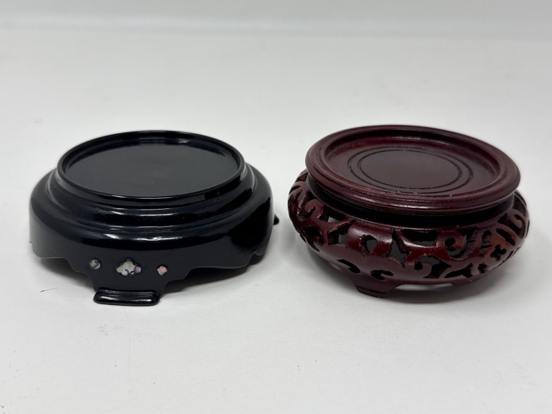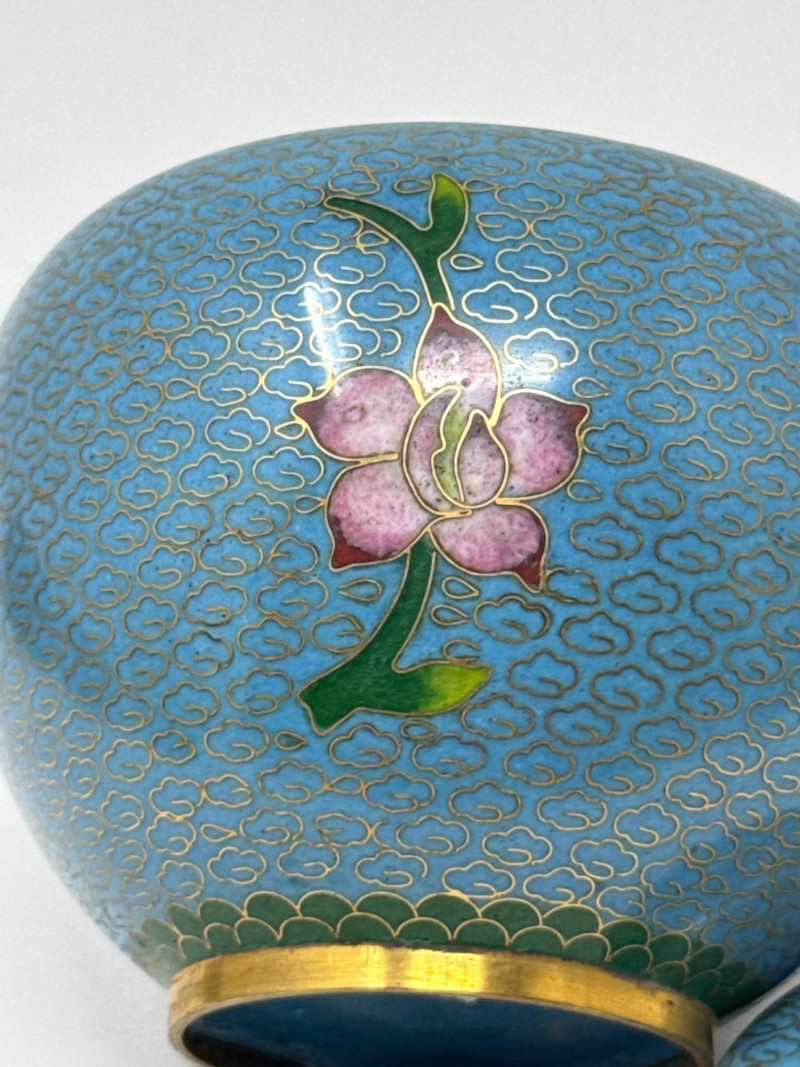 A vibrant quartet of vintage cloisonné vessels, each adorned with lotus florals on a rich blue enamel ground and accented with gold-toned trim. This matched set includes two lidded ginger jars and two open-neck vases, each perched on decorative wood stands and arranged with tiered visual flair. 2 Ginger Jars Dimensions: 4" H × 3.2" W (without stand) 5.2" H with stand Lidded design with rounded body and floral motif 2 Vases Dimensions: 6.2" H × 3" W (without stand) 7.2" H with stand Open neck with tapered body and lotus pattern Technique: Cloisonné enamel over metal Palette: Deep blue background with multicolor lotus florals Accents: Gold-toned rims and trim Stands: Carved wood bases; two displayed on acrylic riserSet Includes