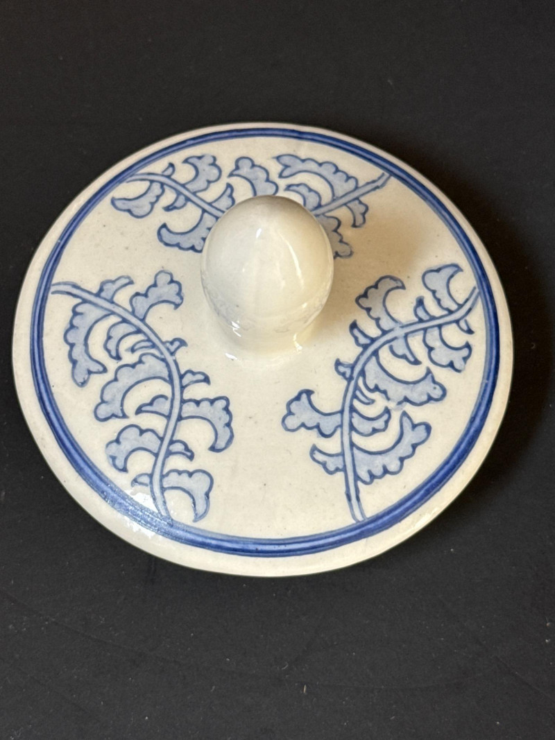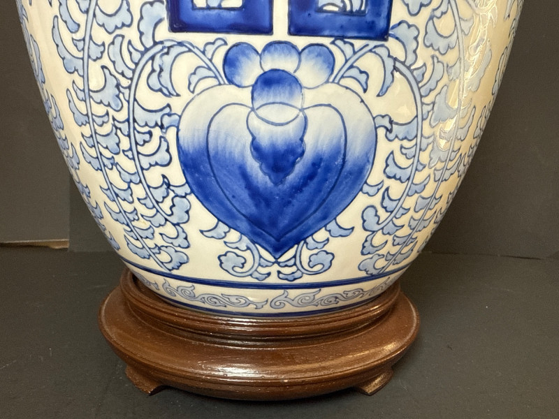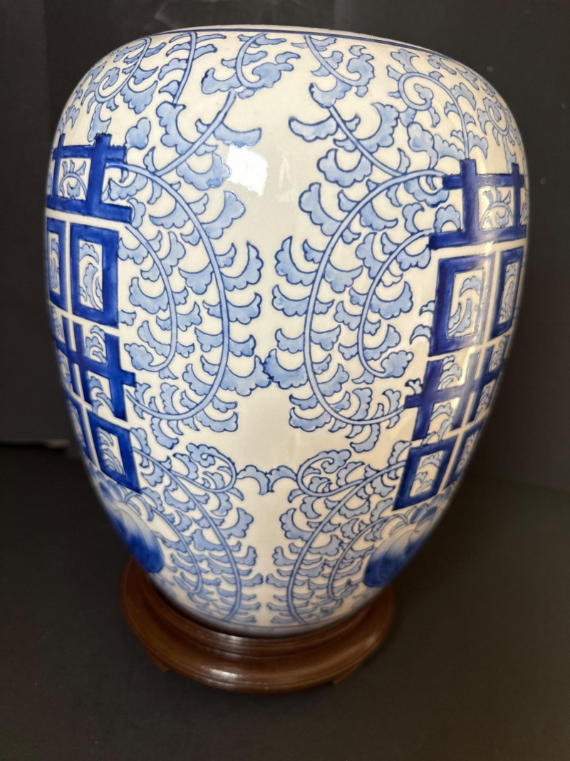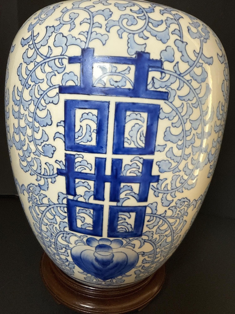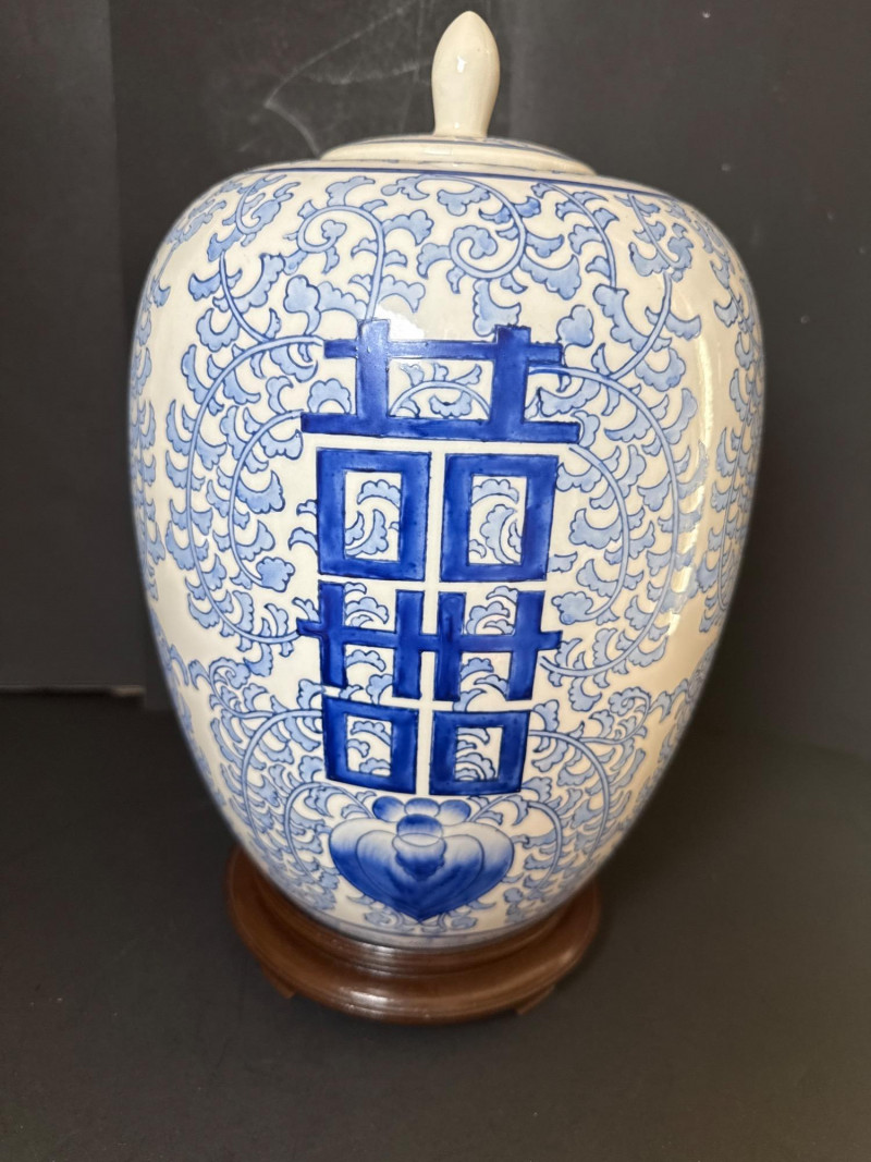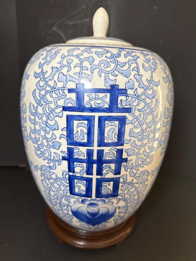 Vintage Ceramic Double Happiness Ginger Jar A vintage lidded ceramic ginger jar featuring traditional Chinese artistry. The jar is decorated in rich cobalt blue underglaze on a white ceramic ground. Prominently displayed on the body is the Double Happiness (囍) character—an auspicious symbol often associated with marriage and good fortune—surrounded by elegant scrolling floral and foliate motifs. The domed lid is topped with a knop finial and echoes the jar’s decorative theme. This piece is presented with a carved wood display stand, enhancing its visual appeal and stability. Form: Baluster jar with domed lid and knop finial Material: Ceramic with underglaze blue decoration Motif: Double Happiness (囍) symbol with floral scrolls Color Scheme: Cobalt blue on white Includes: Carved wood stand Era: Early to mid-20th century (Republic Period to 1980s)Features: