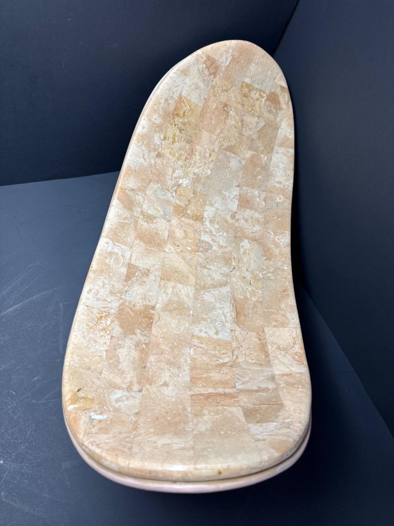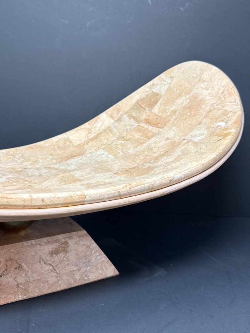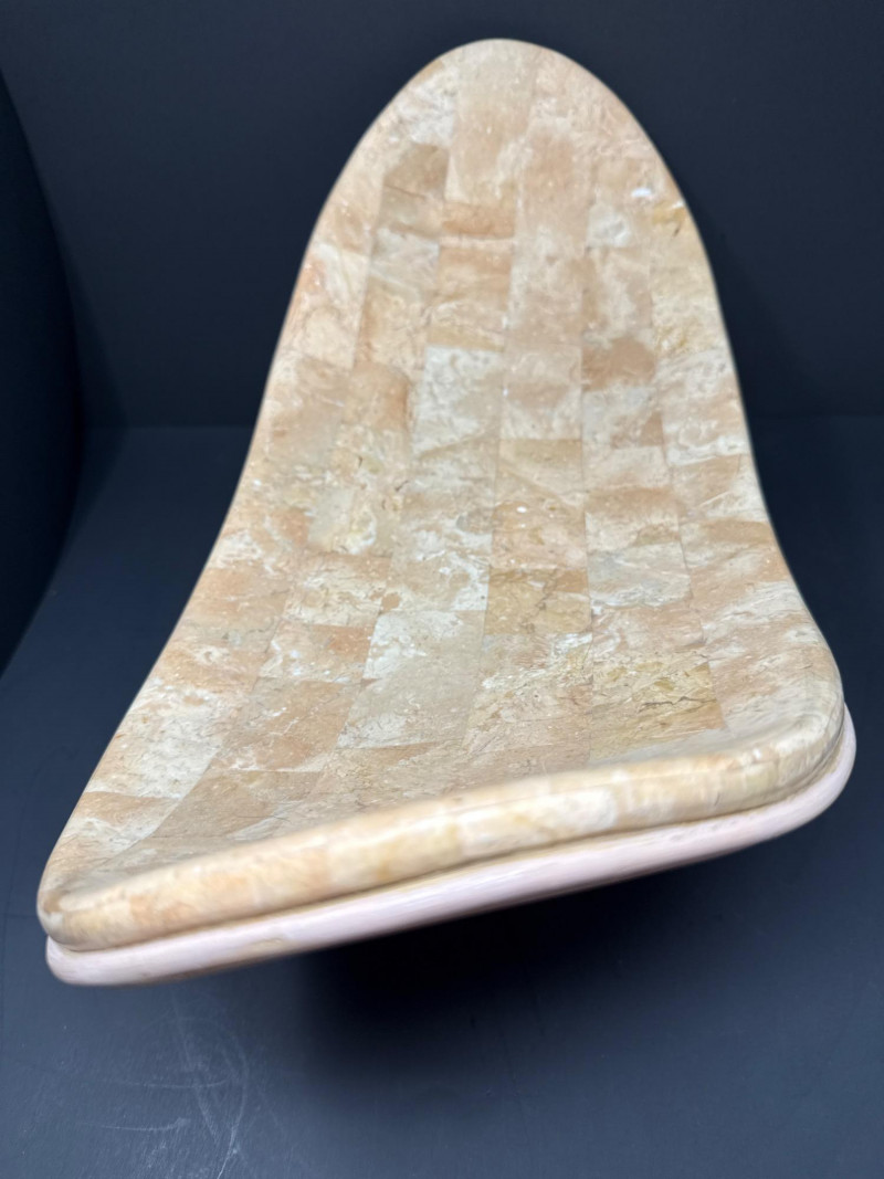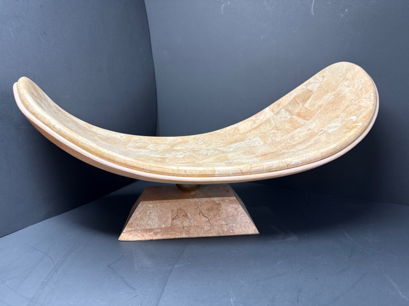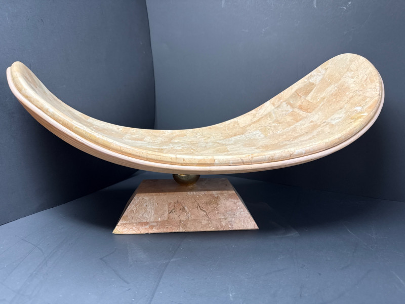 A sculptural decorative tray crafted in tessellated stone with embedded fossil inclusions, gently curved in a saddle form. The tray is elevated on a pedestal base joined by a brass ball connector, offering both structural elegance and visual contrast. The underside features a layered pencil-reed design, showcasing meticulous craftsmanship and adding organic texture. This piece reflects the postmodern decorative ethos of the late 20th century, often attributed to Maitland-Smith and other luxury decorators of the Memphis Revival era. Materials Tessellated stone Metal connector (unspecified) Pencil-reed underside Style & Period Postmodern / Memphis Revival Circa 1980s–1990s Notes: This tray is ideal as a centerpiece, catchall, or sculptural accent. The fossil inclusions and reed detailing make it a conversation piece with layered visual interest.Tessellated Stone & Pencil Reed Tray on Pedestal Base