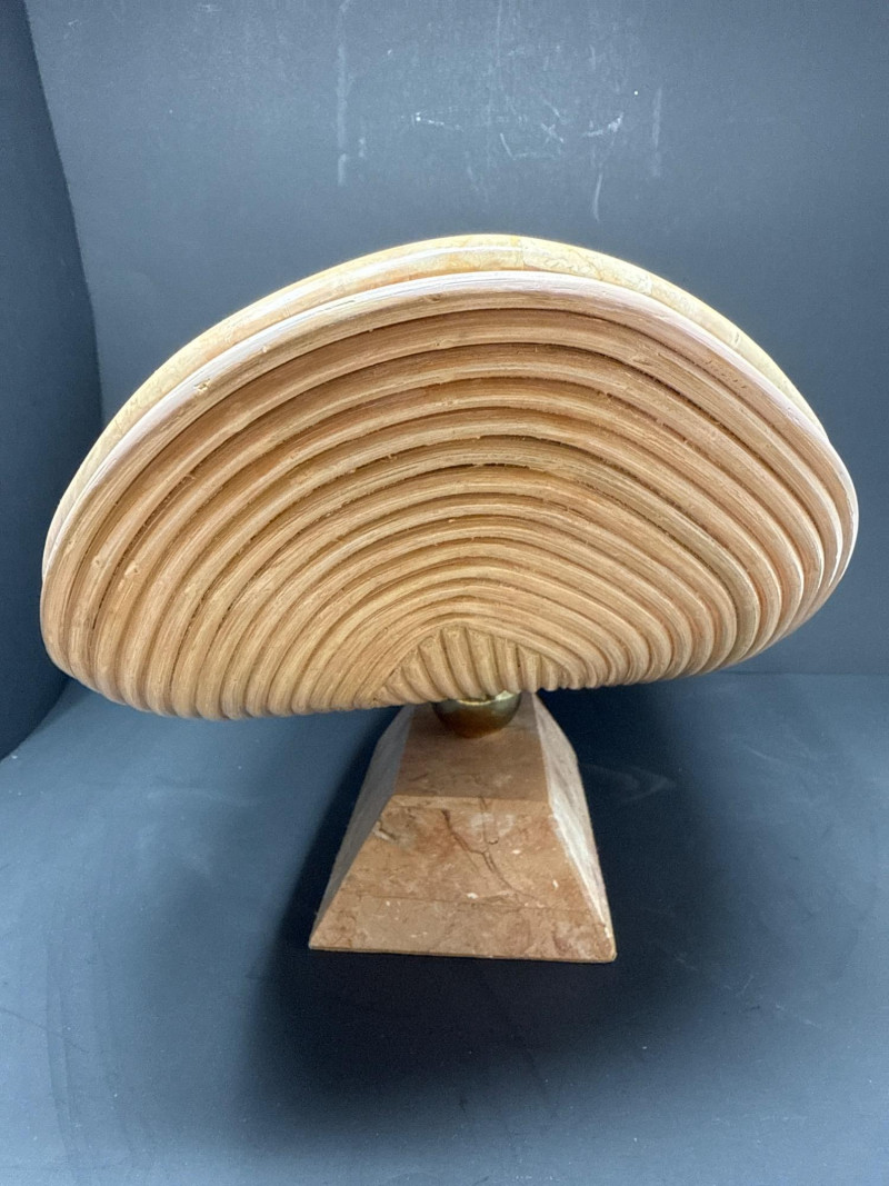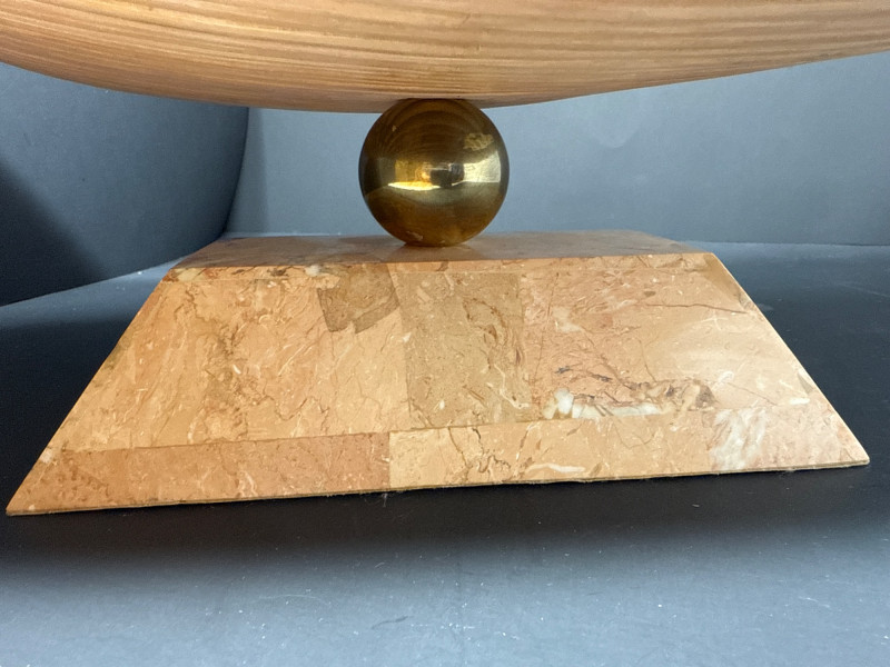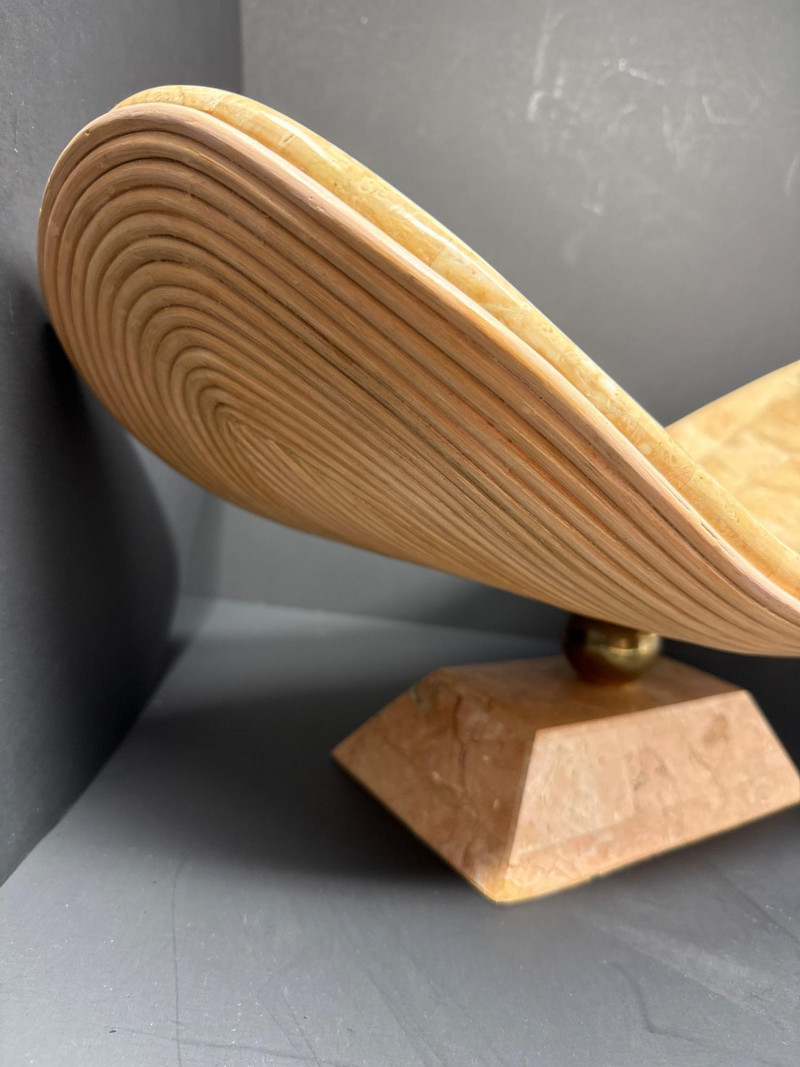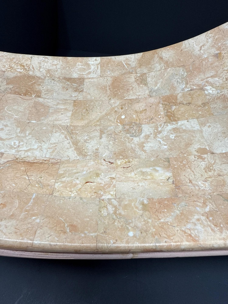 A sculptural decorative tray crafted in tessellated stone with embedded fossil inclusions, gently curved in a saddle form. The tray is elevated on a pedestal base joined by a brass ball connector, offering both structural elegance and visual contrast. The underside features a layered pencil-reed design, showcasing meticulous craftsmanship and adding organic texture. This piece reflects the postmodern decorative ethos of the late 20th century, often attributed to Maitland-Smith and other luxury decorators of the Memphis Revival era. Materials Tessellated stone Metal connector (unspecified) Pencil-reed underside Style & Period Postmodern / Memphis Revival Circa 1980s–1990s Notes: This tray is ideal as a centerpiece, catchall, or sculptural accent. The fossil inclusions and reed detailing make it a conversation piece with layered visual interest.Tessellated Stone & Pencil Reed Tray on Pedestal Base