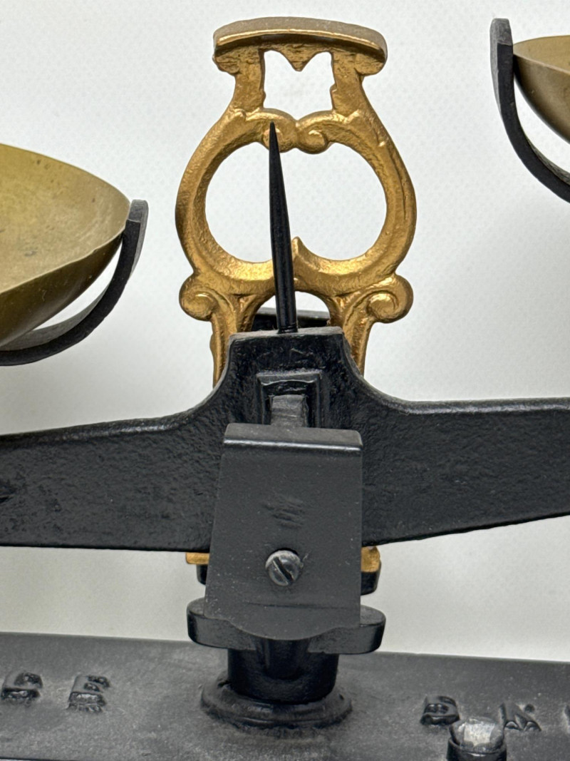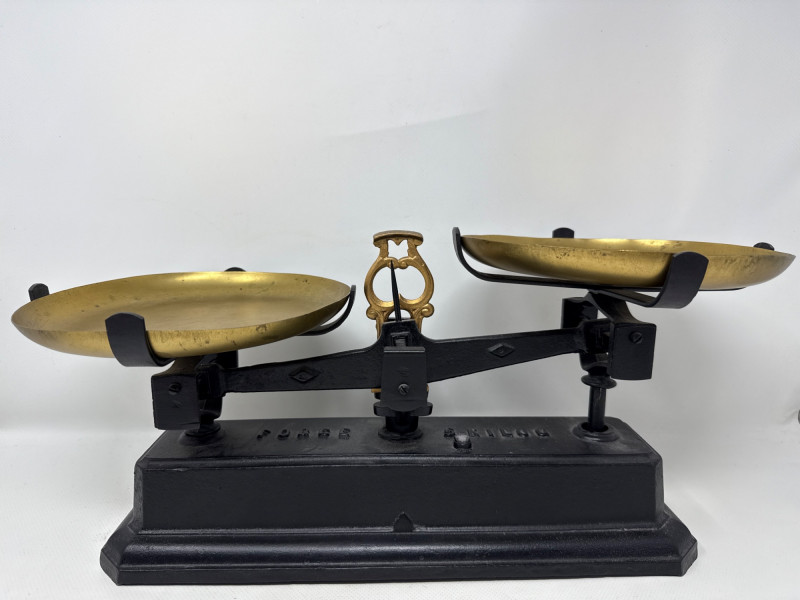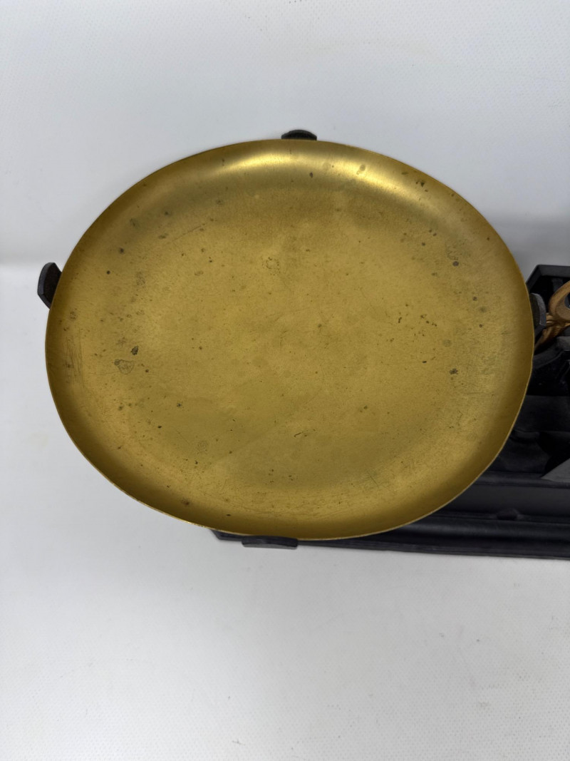 A vintage French balance scale, crafted with a cast iron base embossed “FORCE” and “5 KILOG,” denoting its 5-kilogram capacity. This elegant piece features dual removable brass weighing pans, a central balance mechanism, and a decorative brass finial—blending utility with timeless European charm. Cast iron base and frame Brass weighing pans 5 kilograms “Force” marked scales were widely produced in France during the early to mid-20th century for use in kitchens, bakeries, and market stalls. Today, they are prized for their craftsmanship and aesthetic appeal, making them sought-after vintage accents and functional collectibles.Vintage French “Force” Cast Iron & Brass Balance Scale – 5 KG Capacity